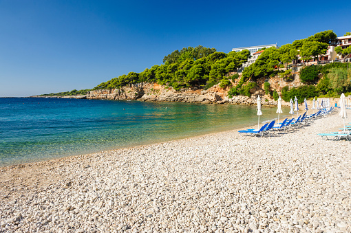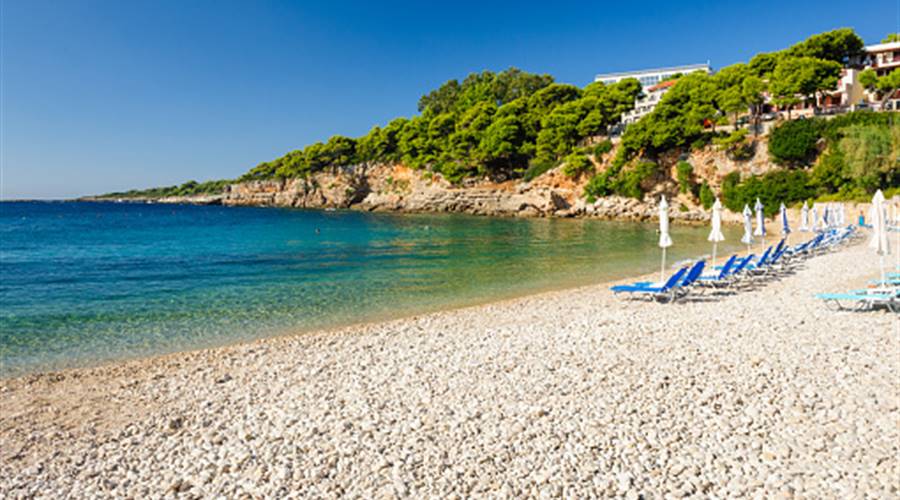 La spiaggia di Roussoum Gialos si trova a circa un chilometro a nord est dalla baia di Patitiri, è incorniciata da un paesaggio pittoresco di rocce e pini che si protendono sull'acqua.