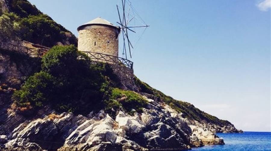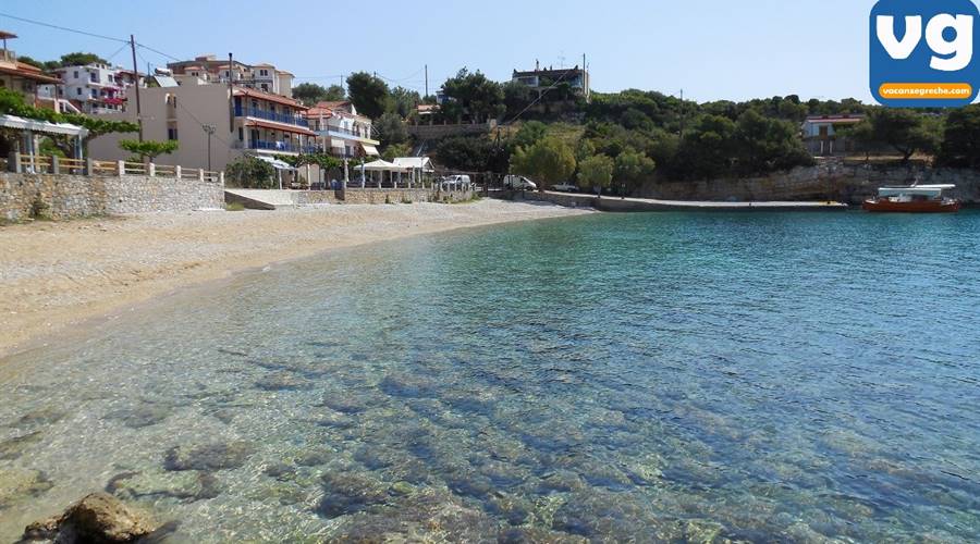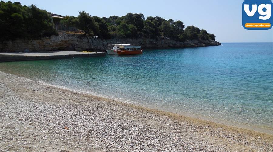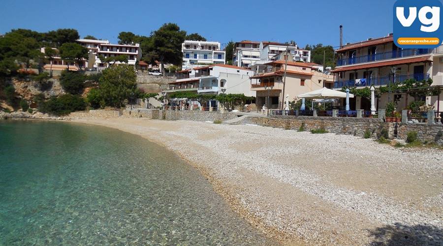 La spiaggia di Roussoum Gialos è una piccola baietta vicina a Patitiri, con una parte attrezzata con lettini e ombrelloni (6€ al giorno) e una parte di spiaggia libera .