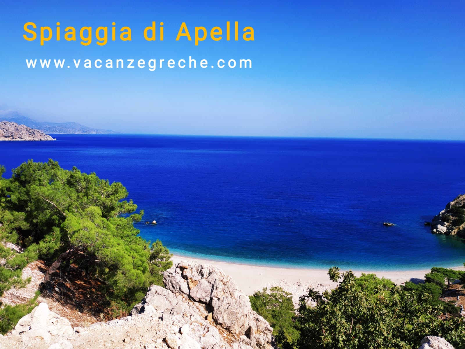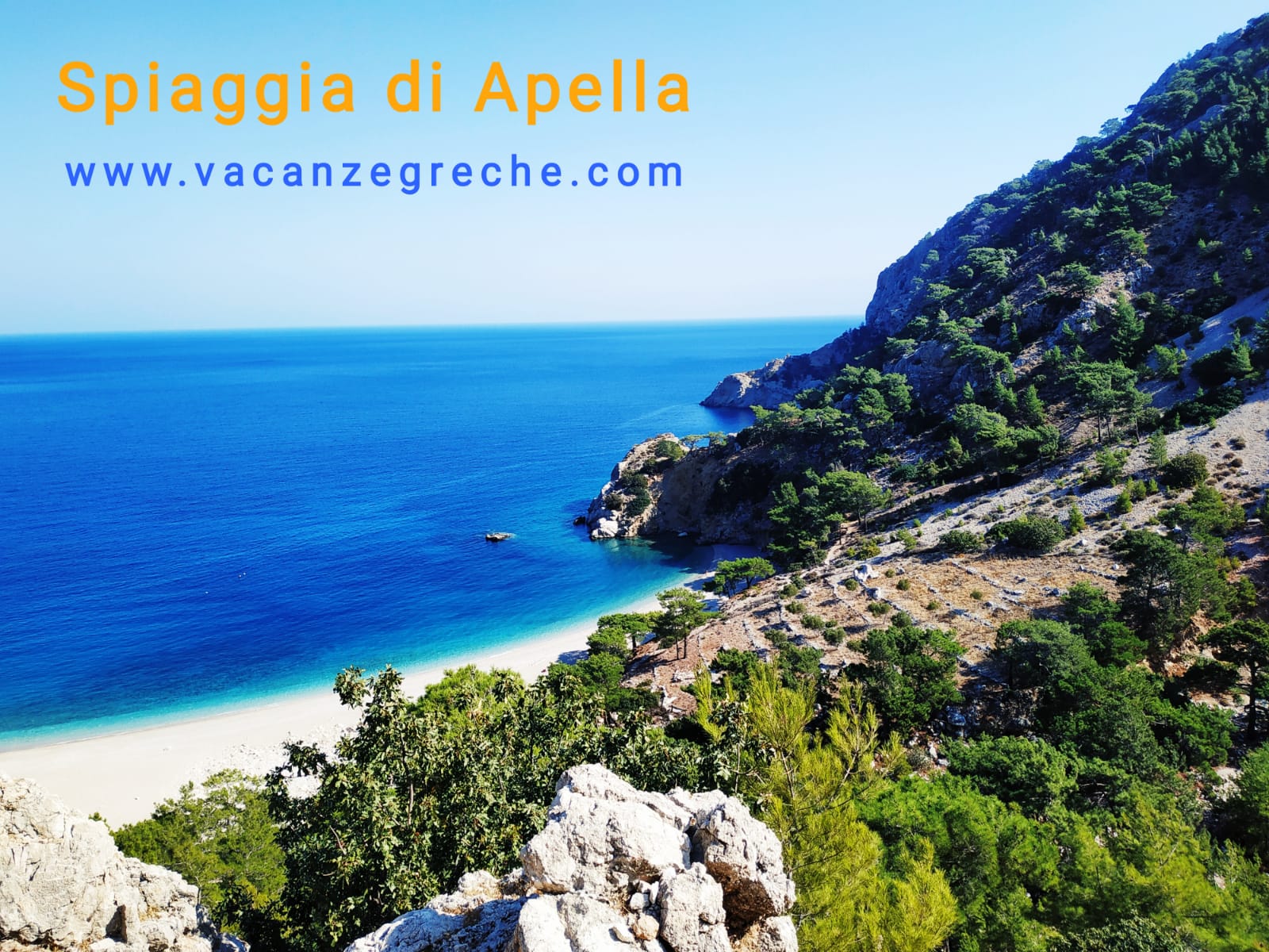 La spiaggia di Apella è considerata una delle spiagge più belle di Karpathos! Presenta sabbia a grana grossa insieme a ciottoli bianchissimi. E' attrezzata con lettini e ombrelloni, e una piccola taverna dove poter acquistare bevende fresche o fare uno spuntino. Il centro più vicino dista parecchi kilometri, quindi ove preferiste optare per il "fai da te" (meglio fare un po' di spesa a Pigadia (nel capoluogo) o in uno degli altri paesi.Apella possiede anche una parte libera portandosi dall'alloggio tutto l'occorrente per ripararvi dal sole, a meno che preferiate farlo sotto uno dei tanti verdissimi tamerici che abbracciano la spiaggia.