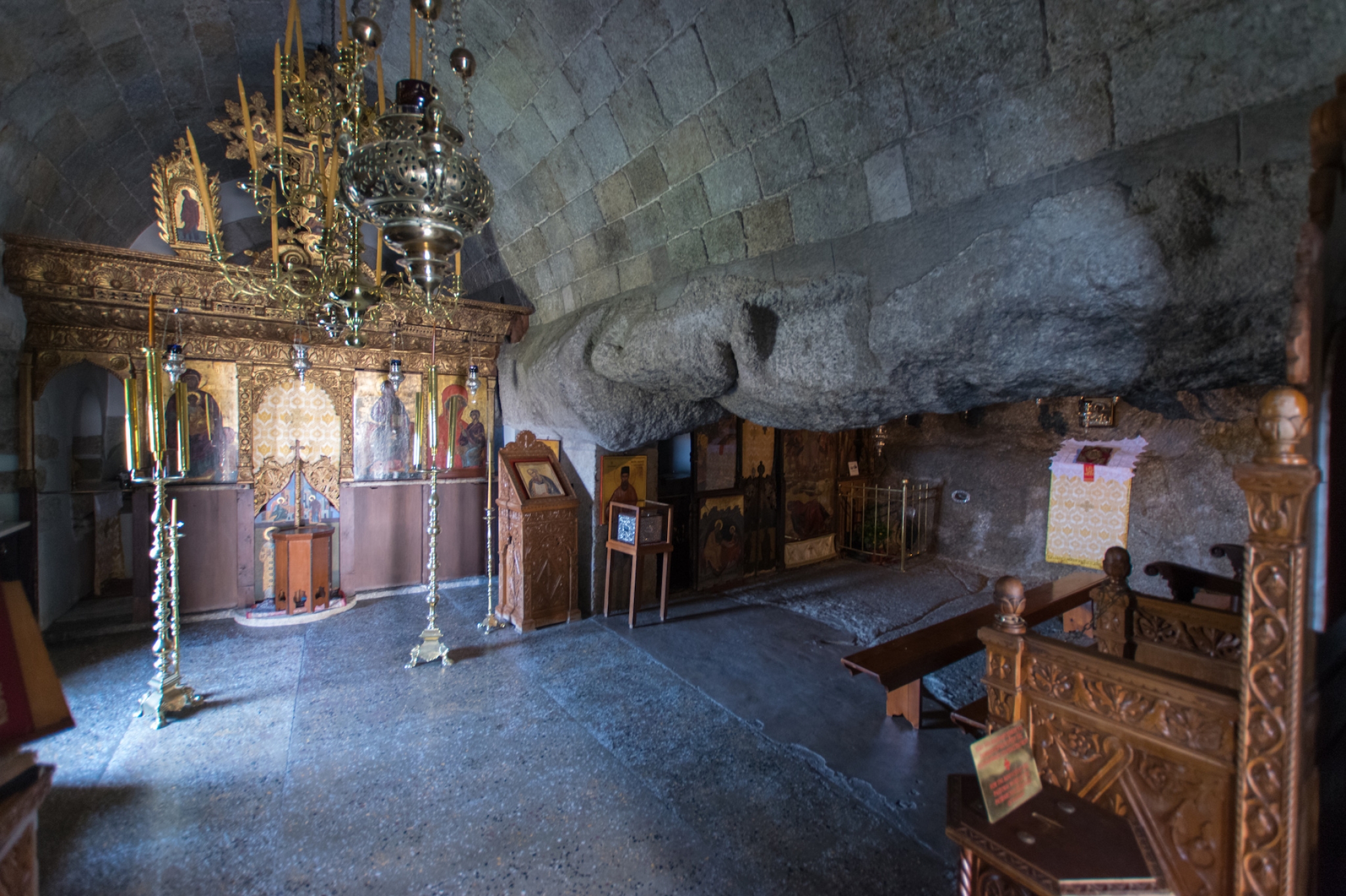 L’interno della grotta è piccolo, illuminato con semplici candele e decorato con dipinti e antiche icone. Nella penombra di questa grotta è innegabile la suggestione e la forte sacralità che si percepisce. Un luogo intriso di storia e sacralità, che crea timore reverenziale nei visitatori più devoti.