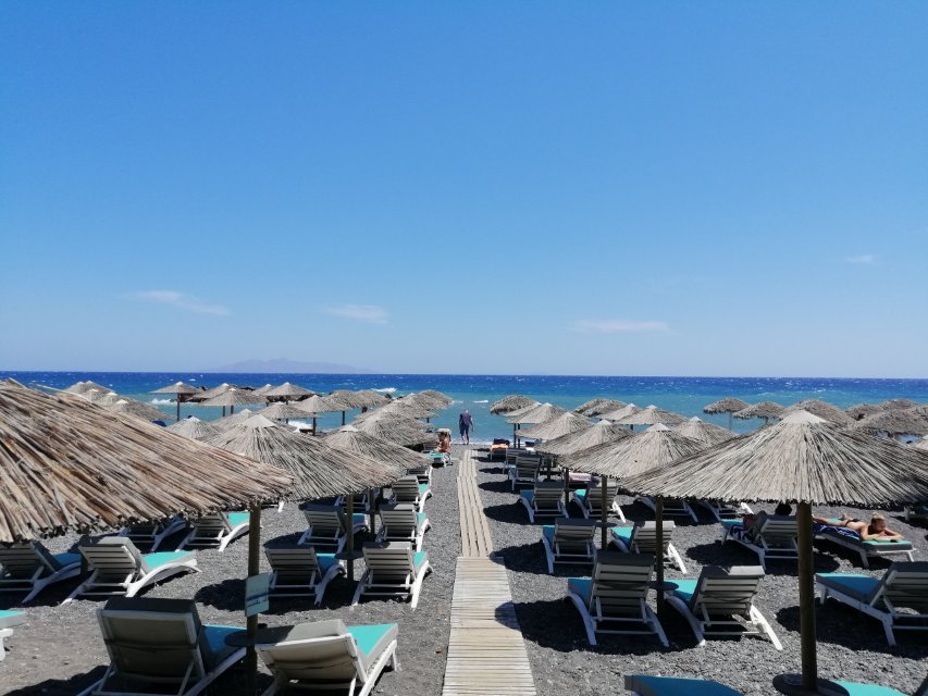 La spiaggia di Kamari è attrezzata con bar, ristoranti, alberghi, luoghi d'intrattenimento e bancarelle che potrete comodamente trovare sul lungomare. Ovviamente lettini e ombrelloni sono sempre a vostra disposizione e nella maggior parte dei casi potrete averli gratuitamente se acquistate anche qualcosa per pranzo. Inoltre il personale di questi bar e locali è sempre molto gentile e disponibile, il che non guasta!La strada che affianca la spiaggia di Kamari è ricca di bar, ristoranti, negozi d'abbigliamento, minimarkets, ouzerie e gyros shops. Insomma potete darvi alla pazza gioia!Questa spiaggia è sinonimo di comfort, per qualsiasi cosa desideriate. La spiaggia di Kamari è anche raggiungibile in bus da Fira (non solo in auto/scooter).Che aspettate? Venite a scoprire questa spiaggia imperdibile dell'isola di Santorini!