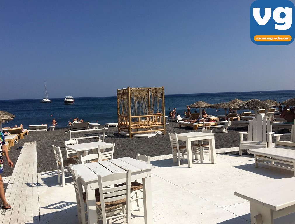La spiaggia di Perissa si trova nella parte sudorientale dell'isola di Santorini, a 15 chilometri da Fira. Presenta un mare straordinario e fine e morbida sabbia nera mista a ciottoli. Qui è possibile utilizzare lettini ed ombrellone gratuitamente consumando però qualcosa al bar. È divisa dalla spiaggia di Kamari dal monte Mesa Vouno e alle sue spalle troverete un piccolo villaggio in classico stile greco, con abitazioni di color bianco in contrasto con la natura vulcanica circostante. Una vera delizia per gli occhi di chi la guarda! Le sue acque sono talmente belle e pulite che alla baia è stata attribuita la Bandiera Blu. Siamo certi che quando arriverete non vedrete l'ora di tuffarvi!Una cosa per il quale raccomandiamo di fare molta attenzione è l'entrata in acqua. Purtroppo l'ingresso è caratterizzato da ciottoli un po' scivolosi, quindi prestate attenzione e se avete problemi seri nel reggervi in piedi da soli cercate di farvi aiutare oppure evitate di entrare in acqua. Se volete rilassarvi sulla splendida spiaggia di Perissa basta che vi spostiate nelle estremità della spiaggia, dove potrete godere del relax assoluto.Ma comunque troverete poco affollamento sull'intera baia grazie alla sua ampiezza. È molto apprezzata dai giovani per due motivi: il primo è la presenza di molti locali dove si può sorseggiare un drink al tramonto e ascoltare dj di fama internazionale che suonano fino a tarda notte. Il secondo è la possibilità di praticare innumerevoli sport acquatici. Il migliore è in assoluto lo snorkeling, i suoi fondali sono splendidi e tutti da esplorare. Ma gli sport da esercitare sono veramente tanti, dal jet ski al parapendio! Oltre a questi stabilimenti ci sono anche taverne e ristoranti all'interno dei quali potrete gustarvi dell'ottimo pesce oppure del buon cibo greco, il tutto a prezzi molto modesti. La zona che circonda la baia è ricca di alberghi e appartamenti a basso costo insieme a ristoranti, bar, negozi di moda, di gioielli e di attrezzature da spiaggia. Perissa è adatta a qualsiasi target di visitatore. Potete trovare dal più semplice snack bar low coast al locale più chic e alla moda a prezzi un po' più elevati. Inoltre, sempre nell'area retrostante alla spiaggia, è presente una zona pedonale, dove le auto non possono passare dopo le 17.00, ottima per fare lunghe passeggiate serali. Molto romantico! La spiaggia di Perissa è raggiungibile da Fira con un autobus che passa ogni 20 minuti circa, ma vi avvertiamo che spesso i bus sono parecchio pieni qundi se preferite potete noleggiarvi un'auto e giungervi in totale indipendenza. Questa è una spiaggia che di certo non vi potete perdere!