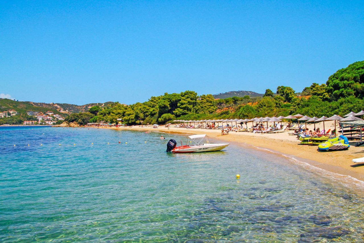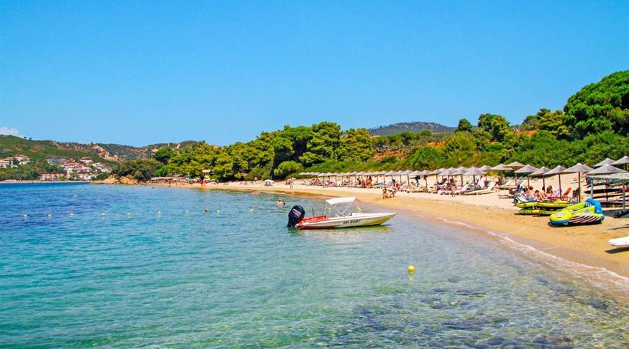 Vromolimnos beach is located 6 kilometers south-west of Skiathos Town , along the southern coast of the island of Skiathos.It has a long and narrow golden and soft beach of about 7 kilometers and a clear emerald sea. All around you can admire the lush vegetation that grows on the hills and gives a little green to the beach! Thanks to the latter, the beach remains very protected from the feared Greek winds. Its shallow water for several meters and its calm waters allow families with children to relax without worries.Vromolimnos is considered one of the most elegant beaches on the island of Skiathos!