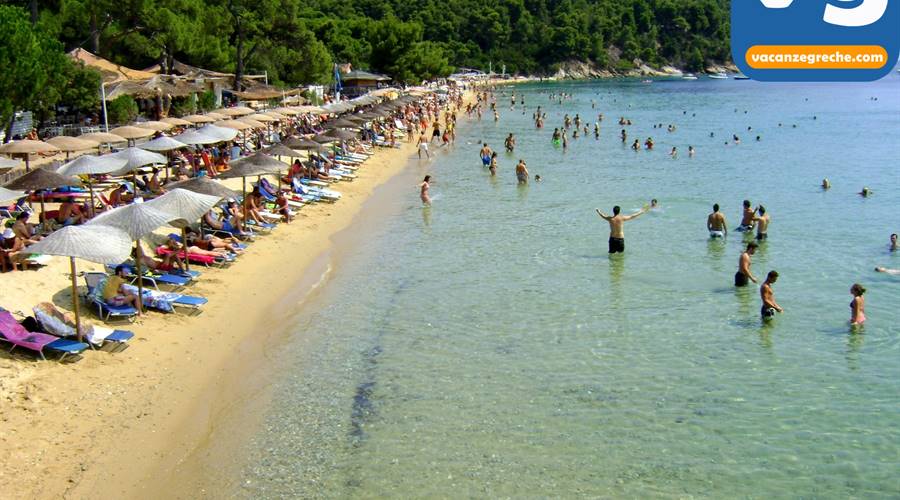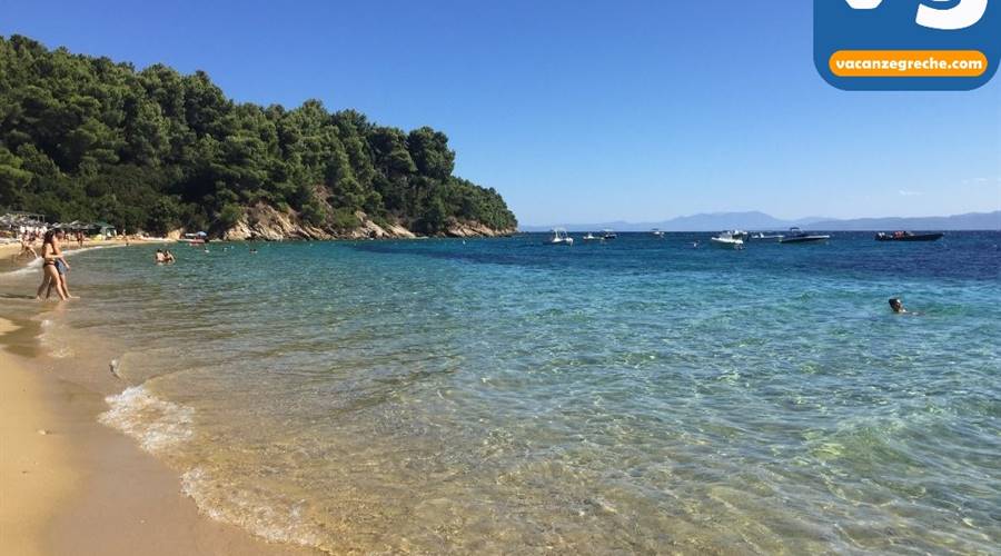Its long beach with fine and golden sand, its green hills that protect it from windy days, its two beaches with sun beds and umbrellas (€ 10 a day), its cafes and taverns and all the water sports that its visitors are passionate about (windsurfing, paragliding and water skiing), making it a beach that deserves to be visited at least once during your stay on the island of Skiathos.