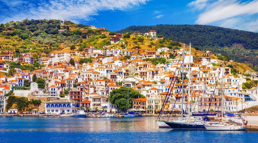 Una volta arrivati a Skopelos Città vi consigliamo di perdervi nel labirinto di stradine acciottolate piene di fiori, tra le casette bianche con tetti di ardesia o di terracotta e bouganville che scendono dalle pareti. Ammirate i balconi sporgenti in legno e le tende di pizzo bianco dietro le finestre dipinte. Potreste scorgere donne del posto affacciate alle loro finestre, incuriosite dal passeggiare dei turisti, mentre ricamano il corredo di qualche nipote in età da nozze. Questa piccola cittadina vi regalerà un'atmosfera intima, protetta e quasi familiare.