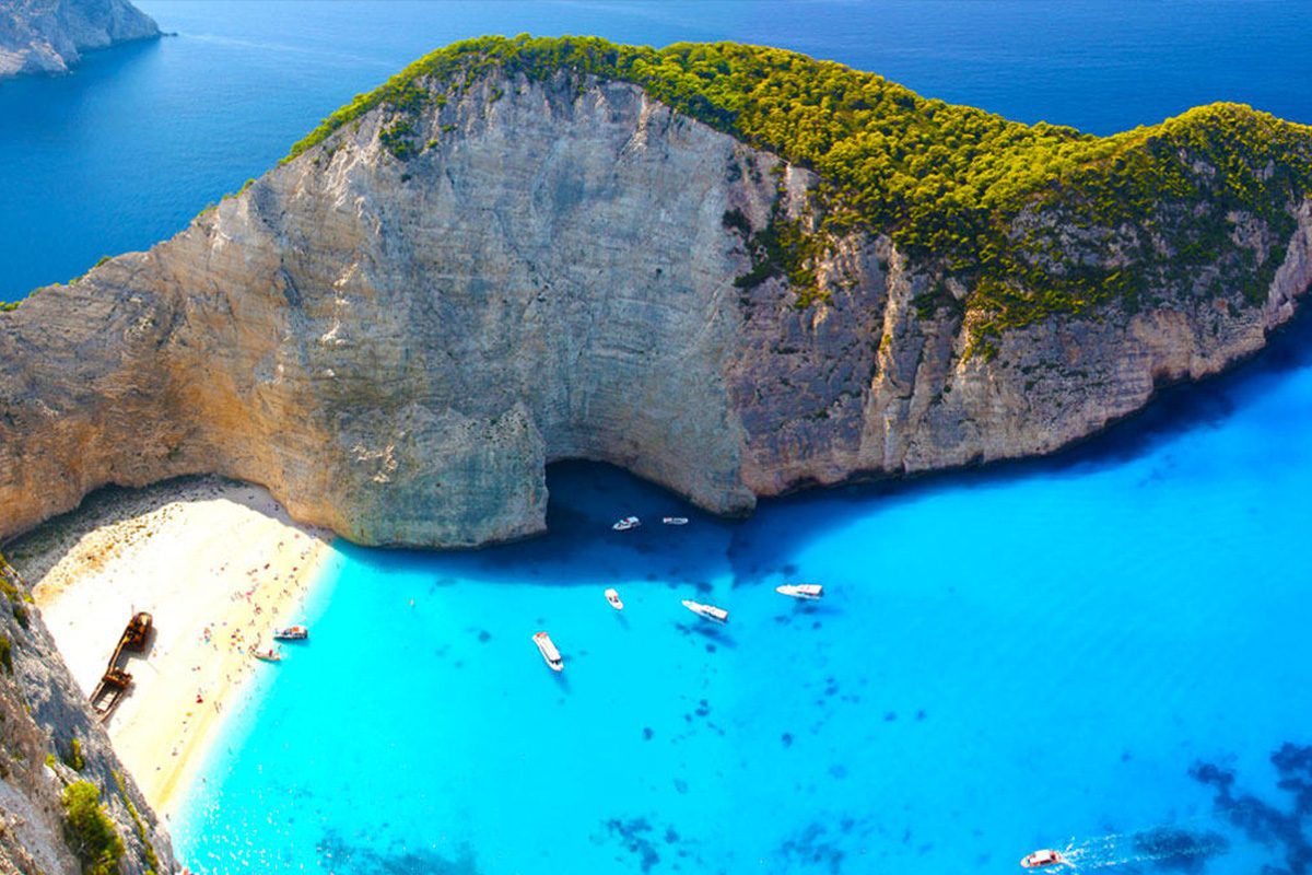 La baia di Navagio, detta anche spiaggia del Relitto è la più famosa di tutta la Grecia e sicuramente una delle più particolari al mondo. È situata nella costa nord-occidentale dell'isola di Zante ed è certamente la più visitata e fotografata dell'isola. Il suo nome, Navagio significa naufragio, è infatti a causa del naufragio di una nave, incagliatasi nella baia nel 1980 che la spiaggia trattenuto e per questo è ancora visibile. Vi lascerà anche più perplessi sapere che prima del naufragio non esisteva la spiaggia e la baia si chiamava Agios Georgiou Sta Gremna (San Giorgio delle Rocce) in onore del piccolo monastero che sovrasta ancora oggi la spiaggia.Le alte e bianche scogliere che circondano la baia di Navagio e la sua sabbia bianca mista a ciottoli contrastano con il mare azzurro, che diventa turchese intenso appena dopo la riva, creando uno scenario a dir poco pittoresco. Completa quello che sembra un quadro d'autore il grande relitto rossastro della nave mercantile semi-sommerso dalla sabbia.