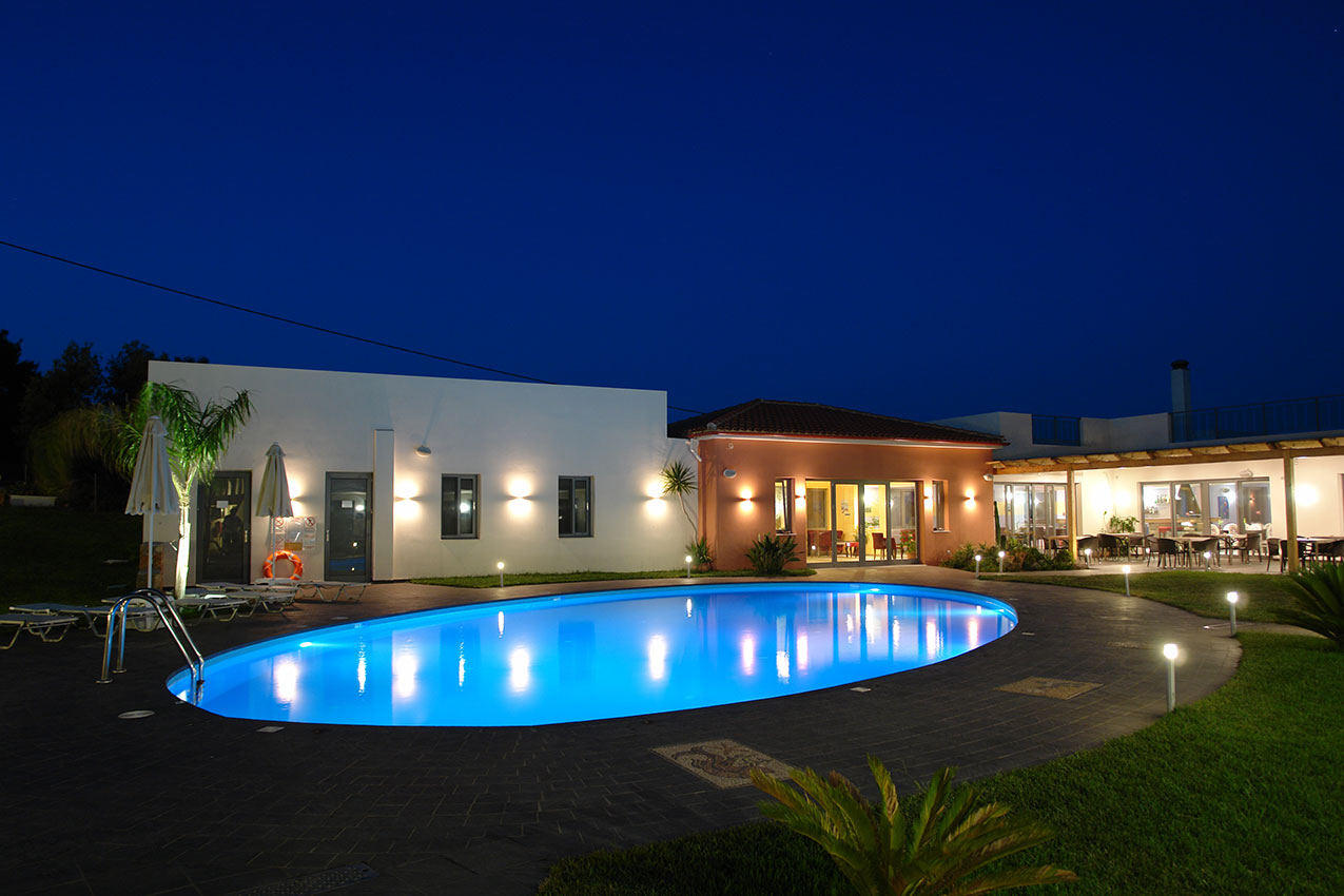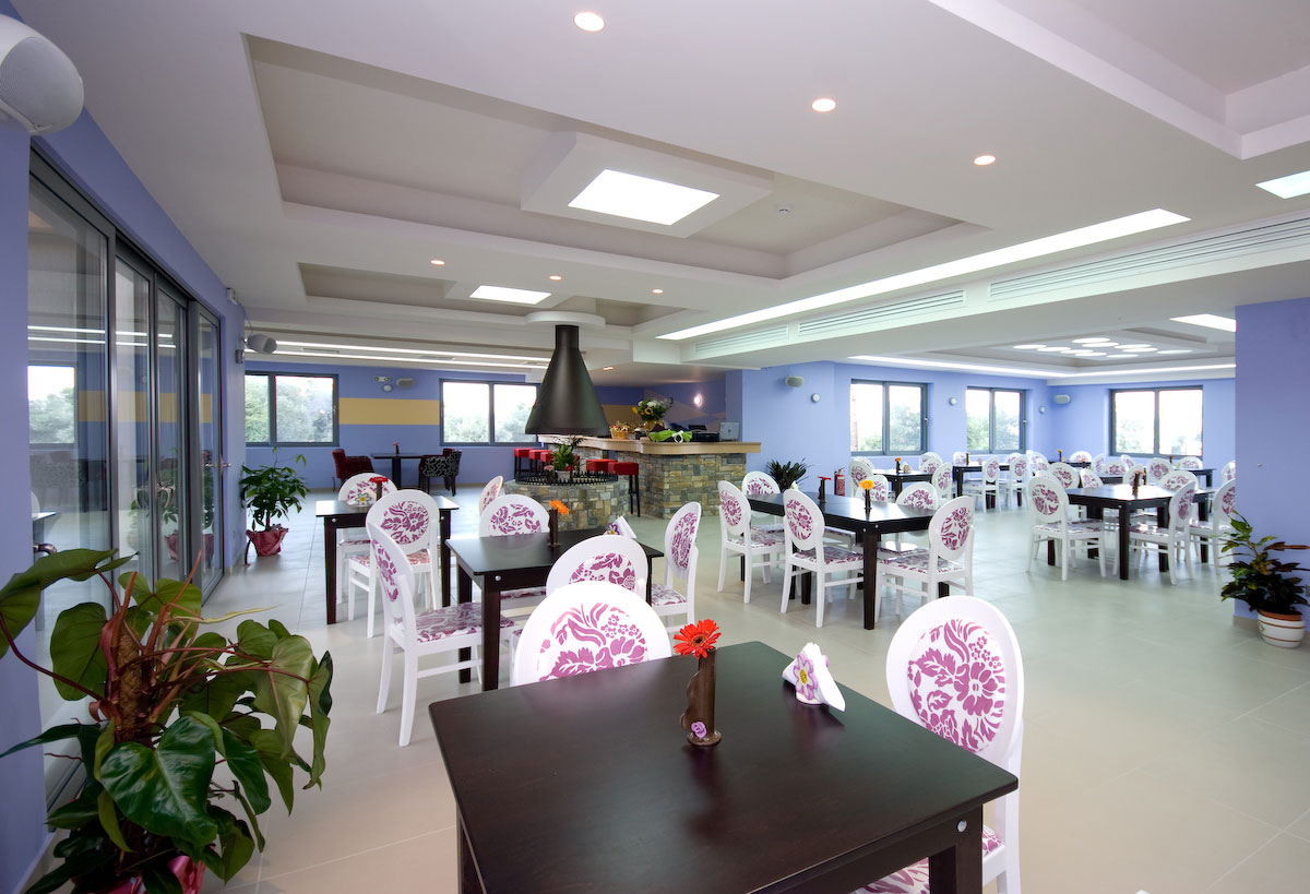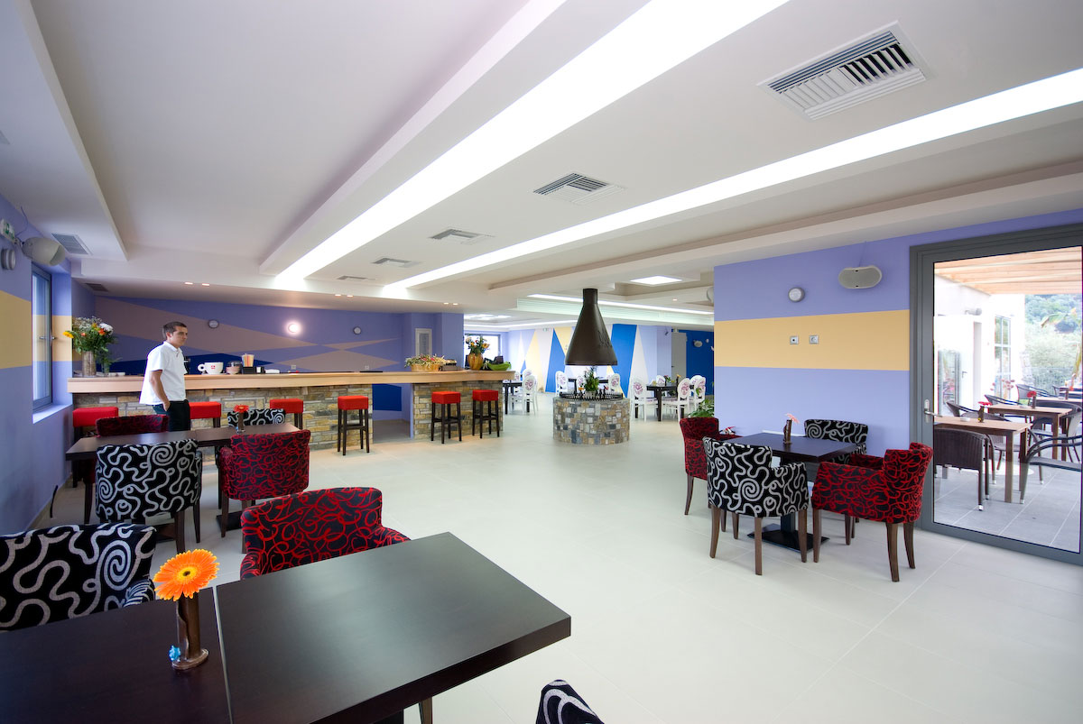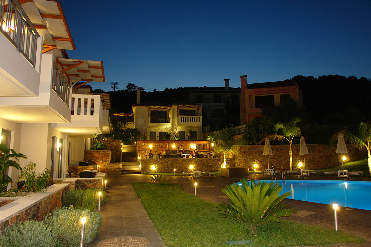 Si può godere di un cocktail accanto alla piscina, una varietà di vini e cocktail esotici oppure sul giardino pensile, con una vista unica della luna che emerge dall'isola Peristera. La colazione viene servita sulla terrazza del ristornate.
