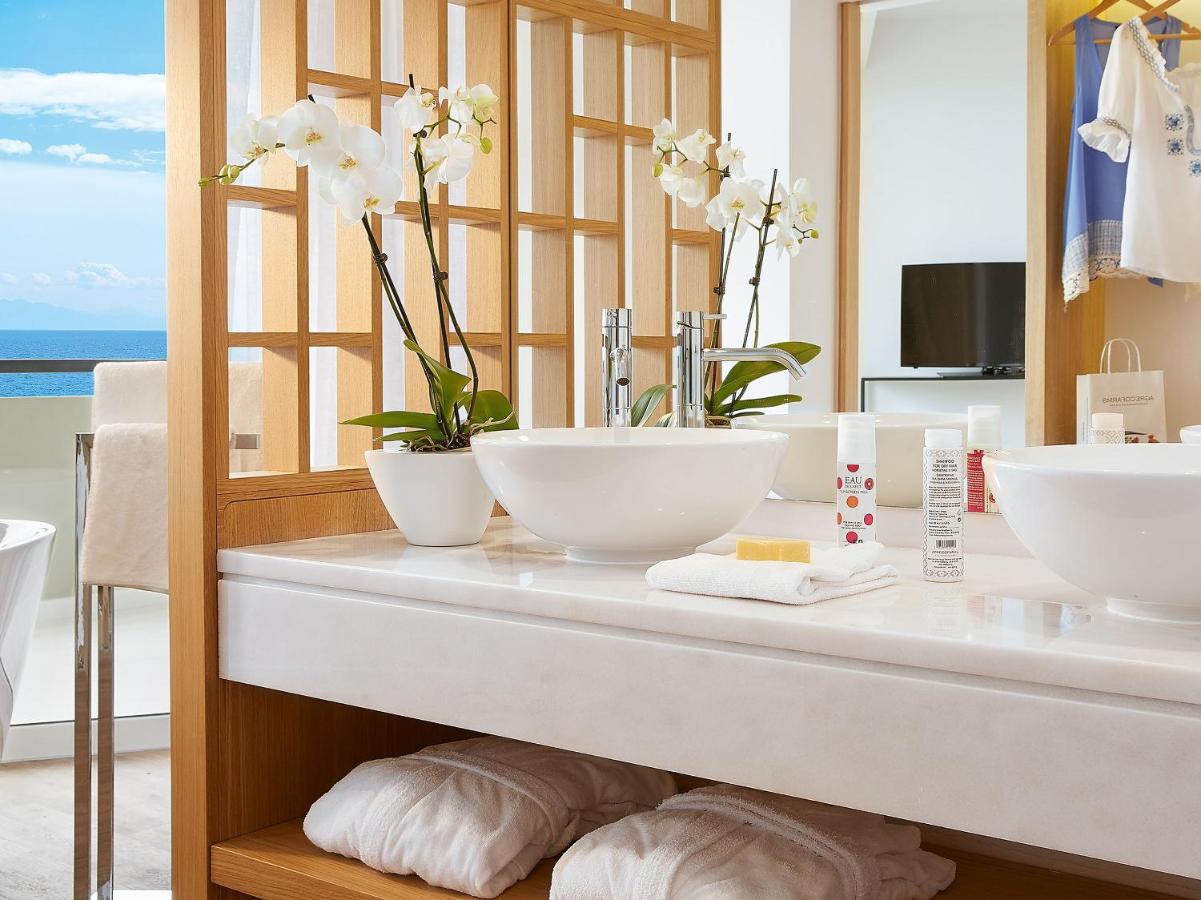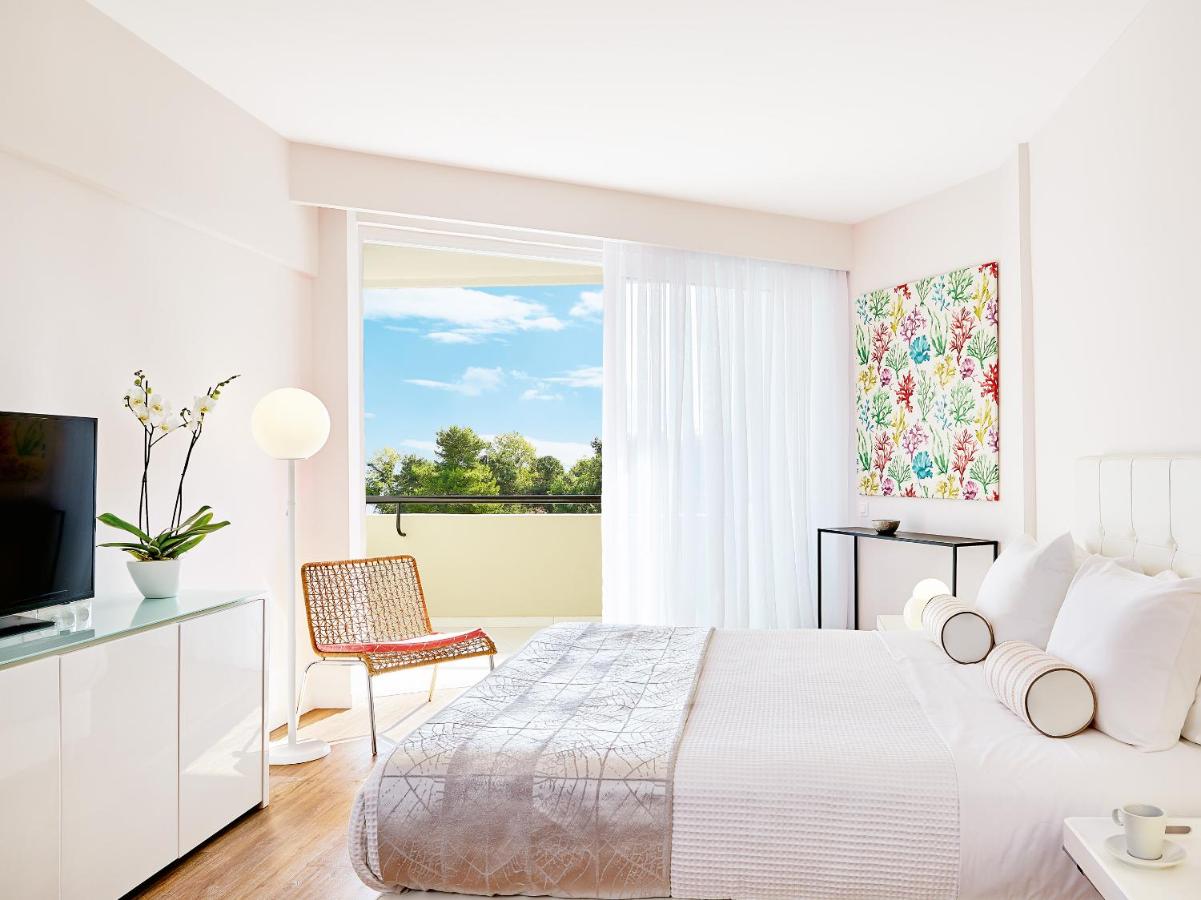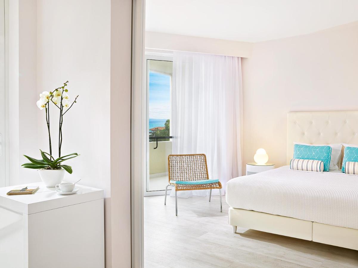 Le camere del Grecotel Margo Bay & Club Turquoise sono decorate con tonalità calde, dotate di un balcone arredato e godono di una vista laterale sul mare. Dispongono di un climatizzatore, TV satellitare, cassetta di sicurezza e articoli da bagno.