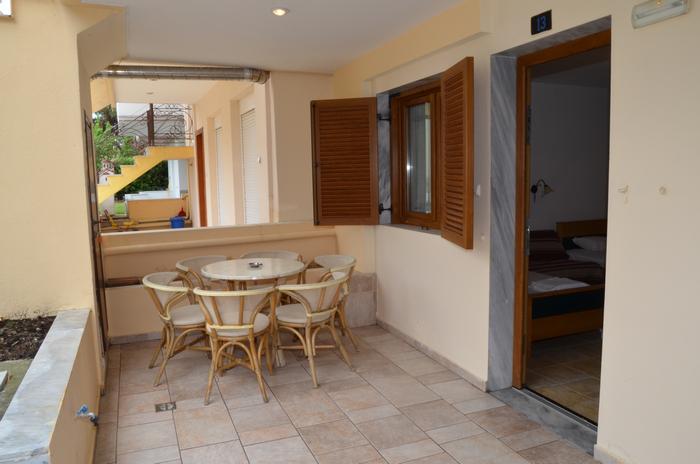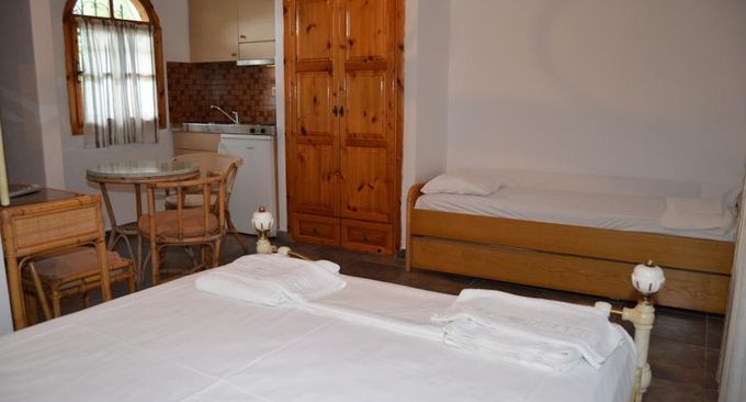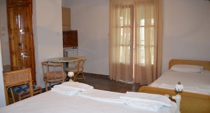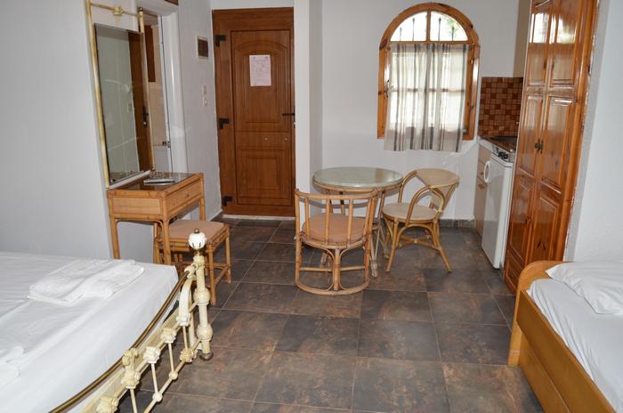 Tutte i  monolocali hanno   ampio balcone, con angolo cottura, letto matrimoniale, aria condizionata, TV, frigo, cassetta di sicurezza a pagamento e bagno con doccia e wc.  camere /  La prima colazione viene servita presso l'Hotel Rigakis 100 metro di distanza.