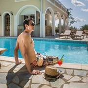 La colazione a buffet viene servita ogni giorno nella sala ristorazione o sulla spaziosa terrazza. Il bar a bordo piscina serve bevande, snack e caffè. Il ristorante in loco propone specialità greche e locali.
