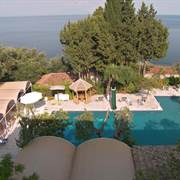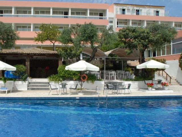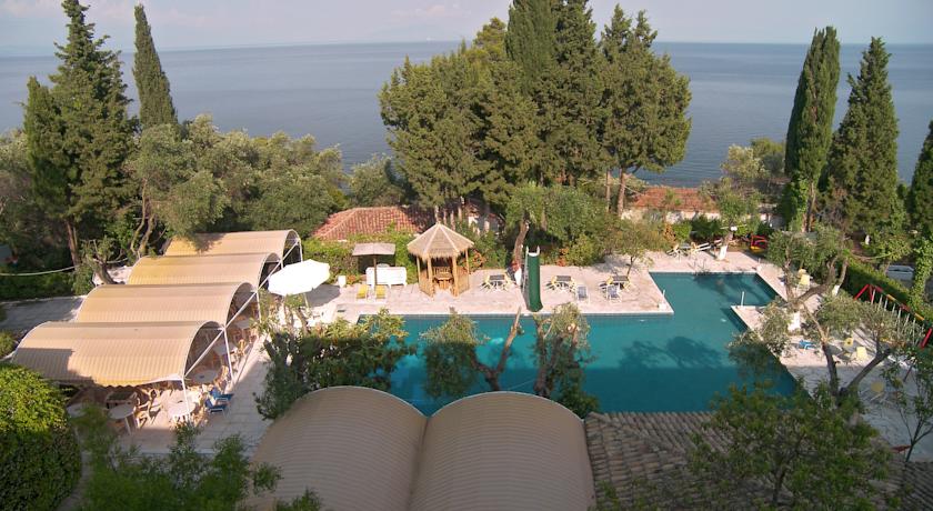 La piscina è circondata da alti alberi e dispone di una terrazza solarium e una piscina per bambini. Una terrazza con arredi esterni si affaccia sull'isolotto di Pontikonissi. Il ristorante dell'hotel offre piatti greci e internazionali, mentre la taverna serve specialità locali.