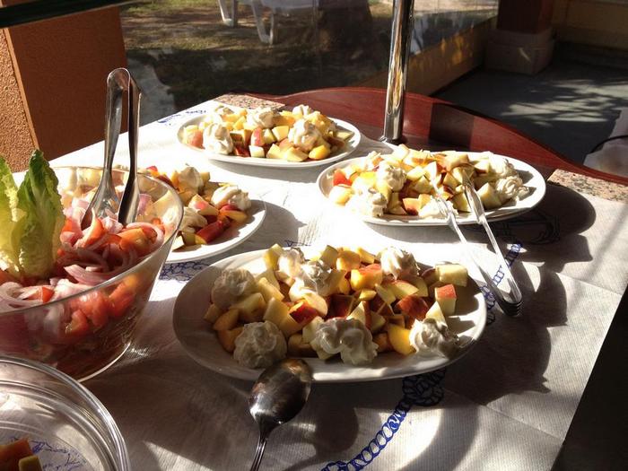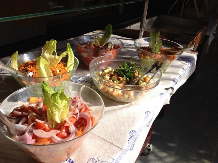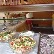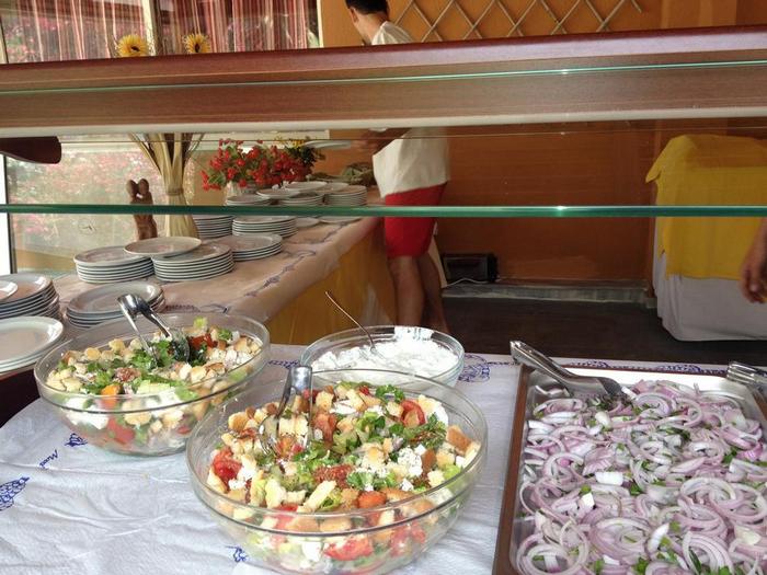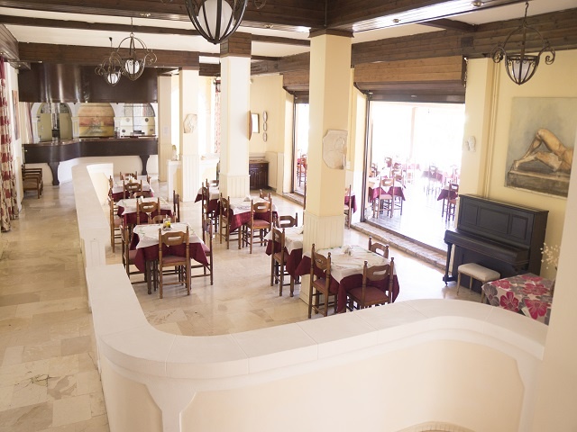 Il ristorante e il buffet è aperto per la prima colazione e per tutto il giorno e serve il pranzo e la sera cena a buffet con una vasta gamma di piatti della cucina greca e internazionale .