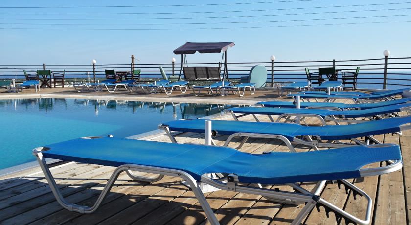 Oltre alla piscina principale, l'Amazones Village mette a disposizione anche una vasca per i bambini e un'ampia terrazza solarium in legno con viste panoramiche sul Mar Egeo. Imperdibile la sala fitness.
