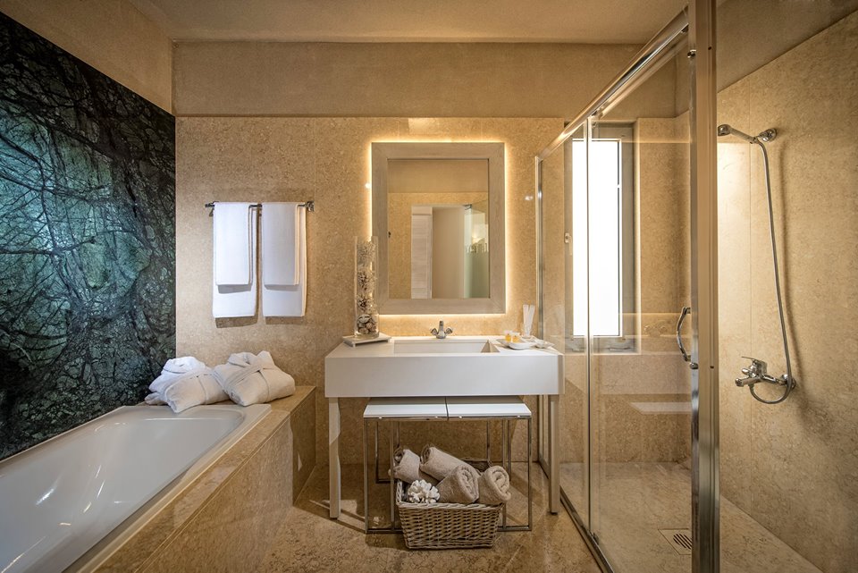 Le camere e le suite del Blue Bay Resort and Spa includono balcone privato arredato con vista diretta o laterale sul mare, una TV satellitare, una cassaforte, un minifrigo, l'aria condizionata, un set di cortesia e un bagno privato con vasca o doccia.