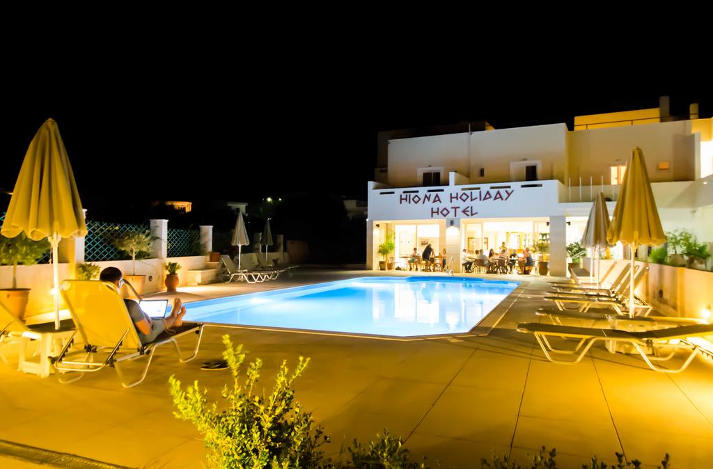 Situato ad 1 km dalla spiaggia di Hiona, lo Hiona Holiday Hotel offre camere e appartamenti con aria condizionata e balcone privato, una piscina con terrazza solarium e uno snack bar.