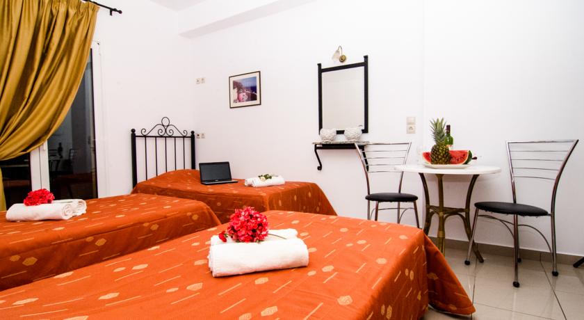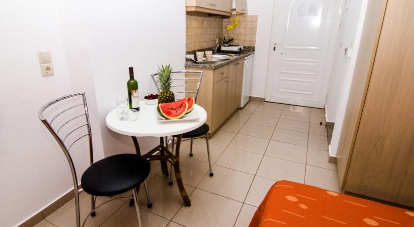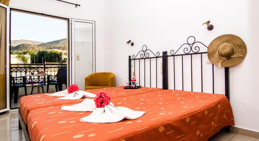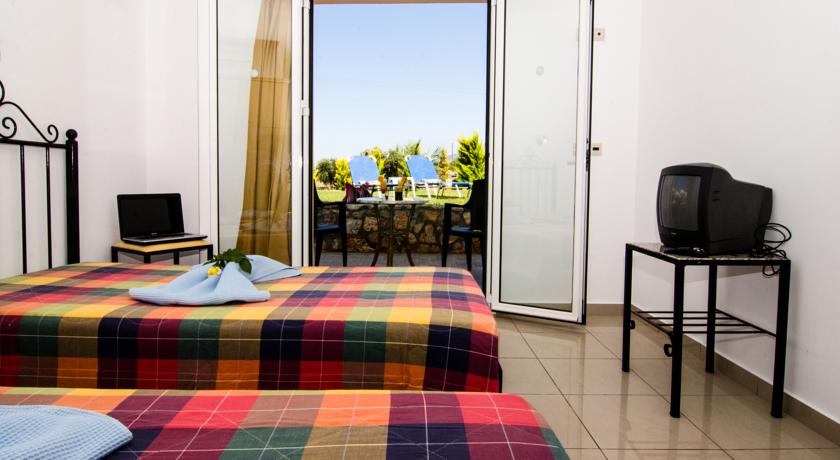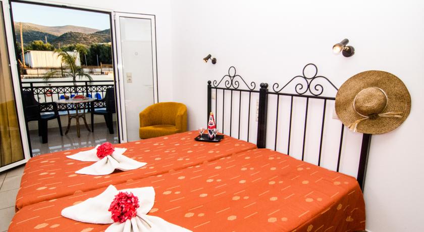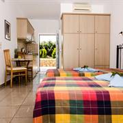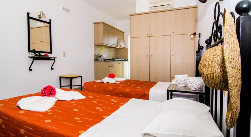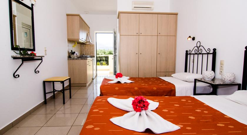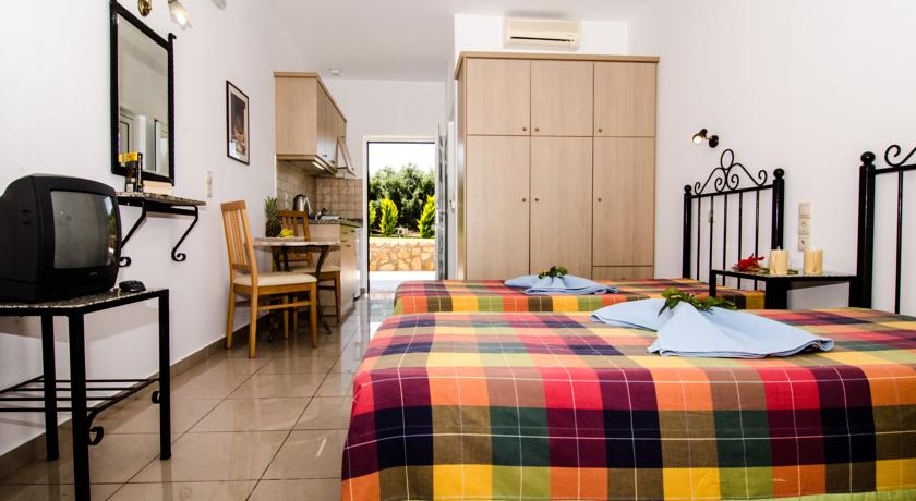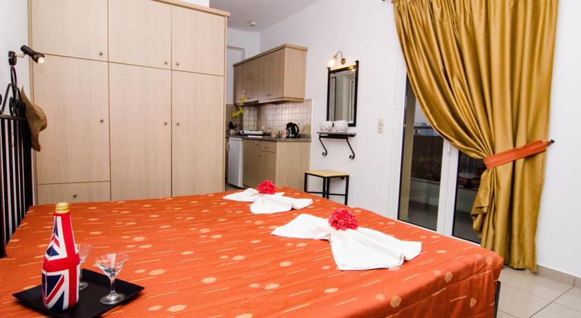 I monolocali del Real Palace sono insonorizzati, si aprono su un balcone o su un patio con vista sulla piscina, sul giardino, sulla montagna o sul mare di Creta, e dispongono di un angolo cottura con frigo e fornelli e di un bagno privato con doccia o vasca.