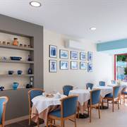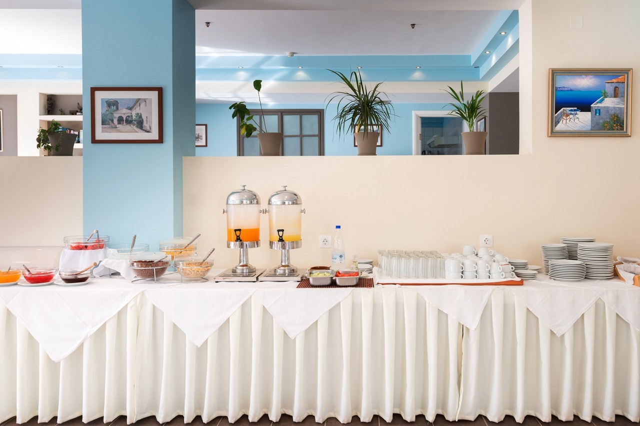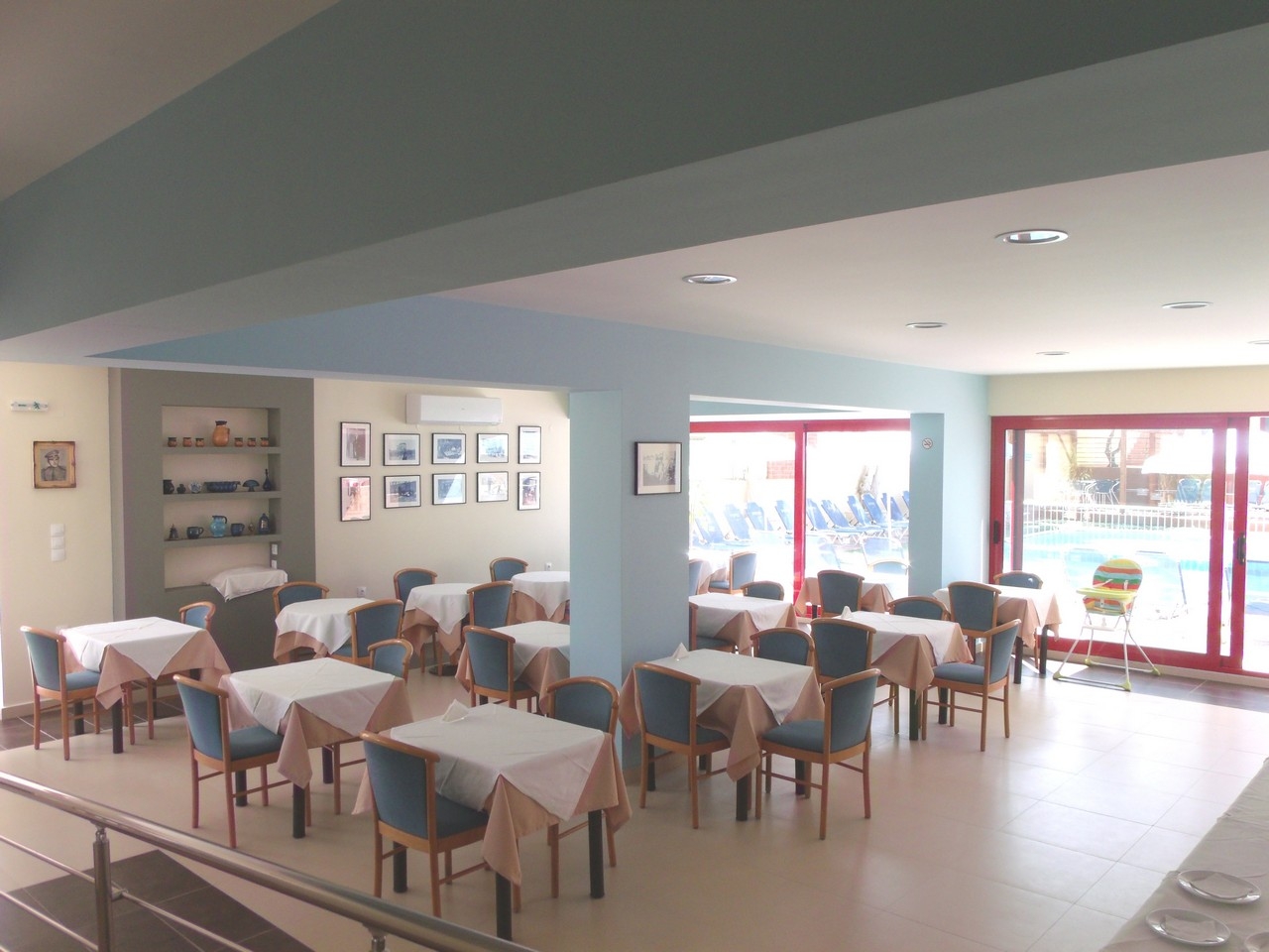 Si può gustare la colazione da un ricco buffet . Il pranzo e la cena sono serviti presso l'hotel del mare Restaurant. Il ristorante Thalassi BEACH BAR si trova in riva al mare, a 5 minuti a piedi dall'hotel. Tutti i pasti sono preparati con ingredienti fresci e biologici coltivati direttamente dall'hotel.