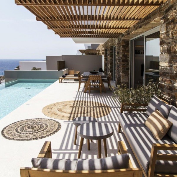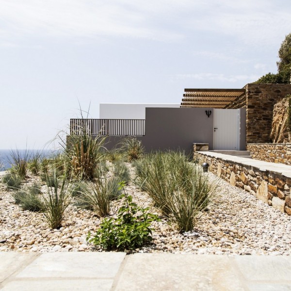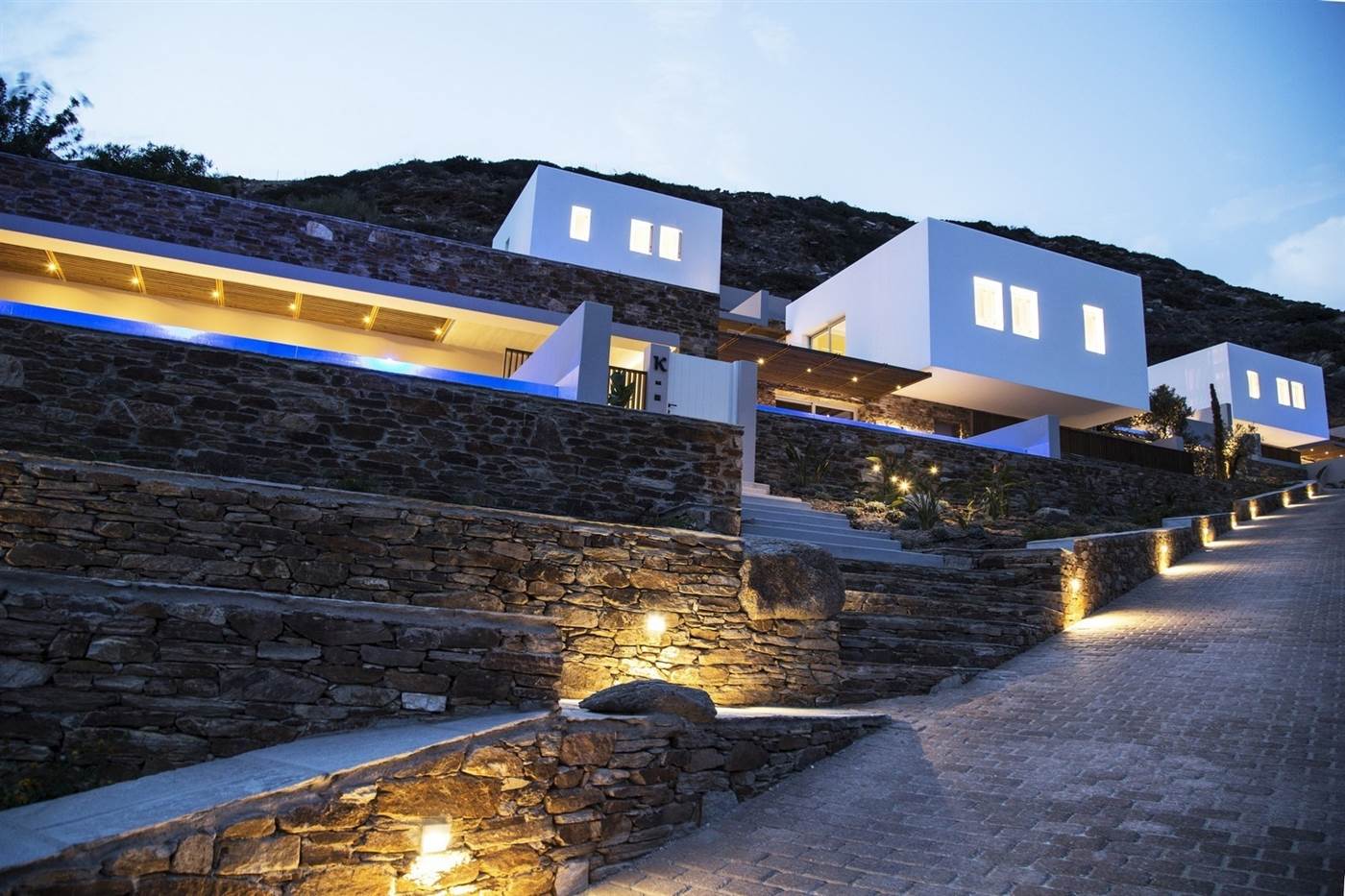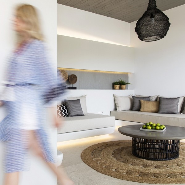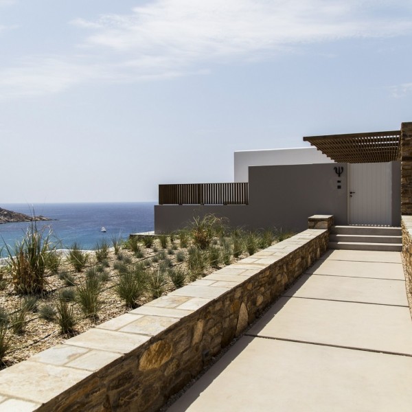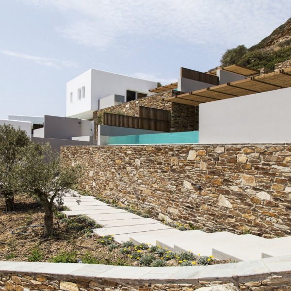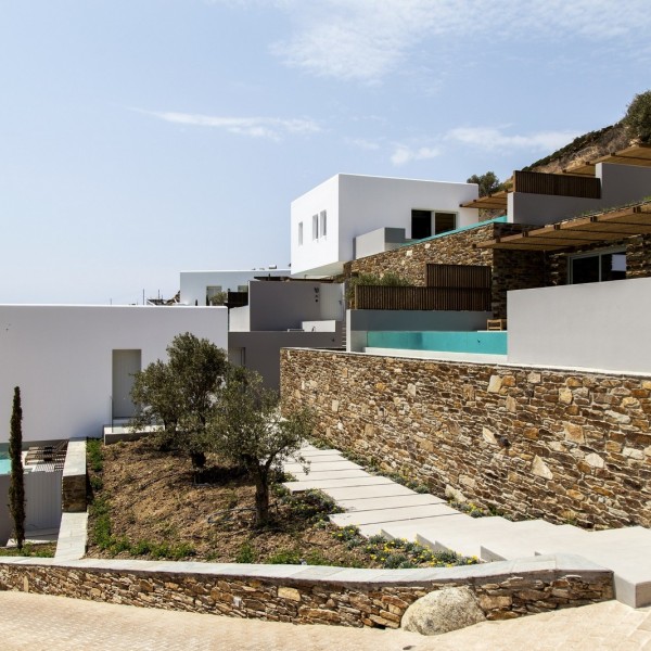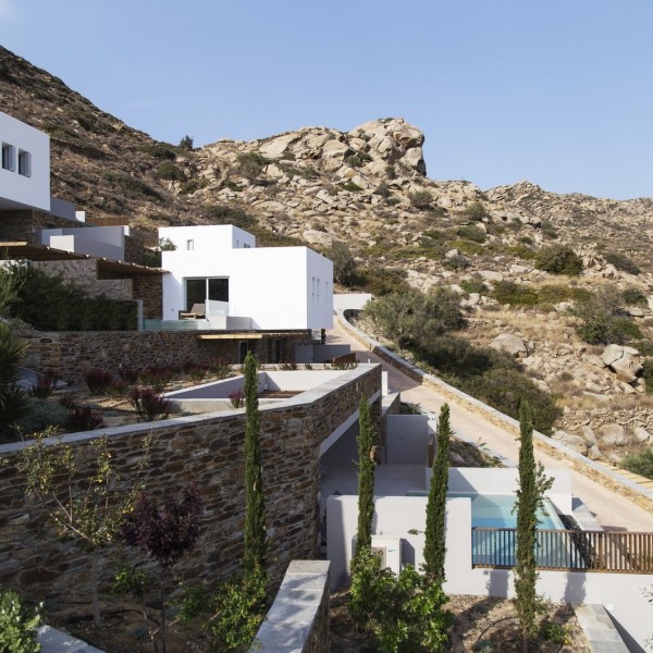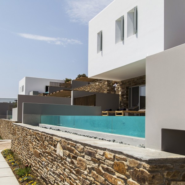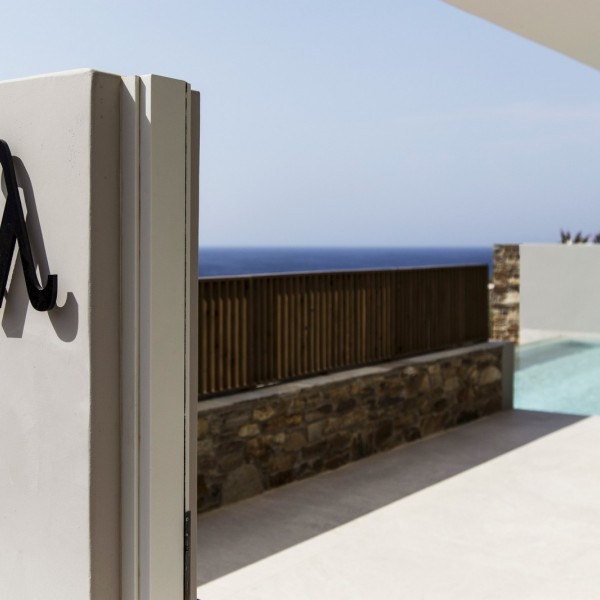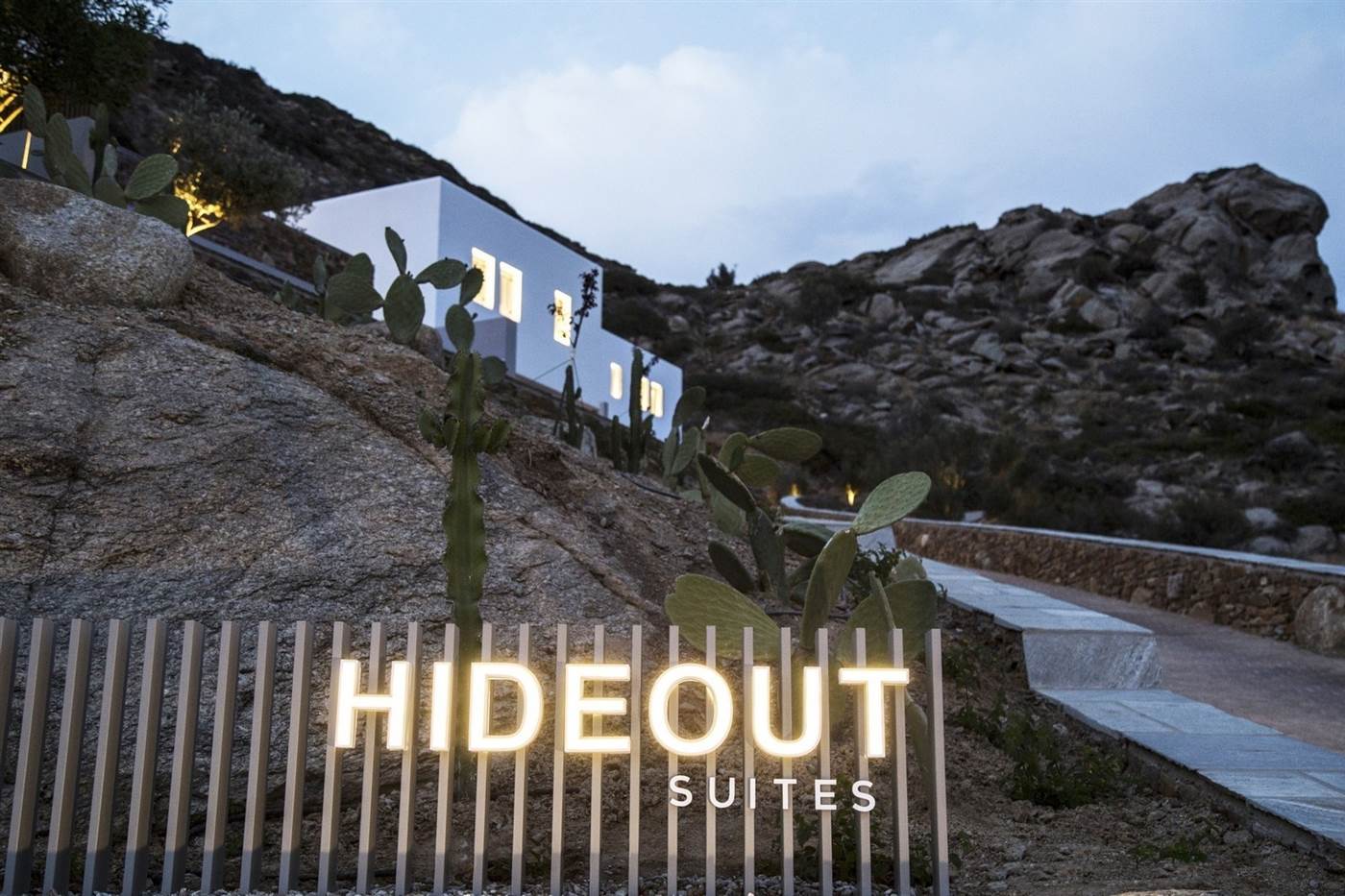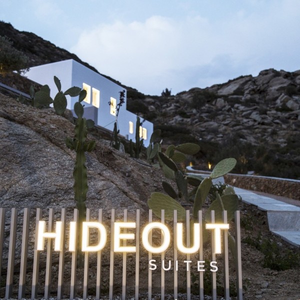 Il complesso è costruito rispetto al suo ambiente naturale, come se fosse uno con il paesaggio dell'isola di iOS. Lo stile tradizionale si bilancia armonicamente con l'architettura contemporanea, linee greche chiare, spaziosi interni, elementi minimi di decorazione e design, per trasmettere un umore di sistema operativo di rilassamento. Il momento clou di ogni suite è la veranda con un'area salotto e una piscina privata, tutte con viste sull'infinito blu. Hideout è progettato per coloro che vedono veri piaceri per le vacanze, come svegliarsi con panorami affascinanti, nuotare nella piscina privata, rilassarsi nella sala esterna, indulgere in trattamenti spa e sperimentare servizi alberghieri premium.