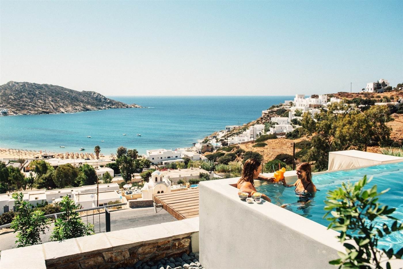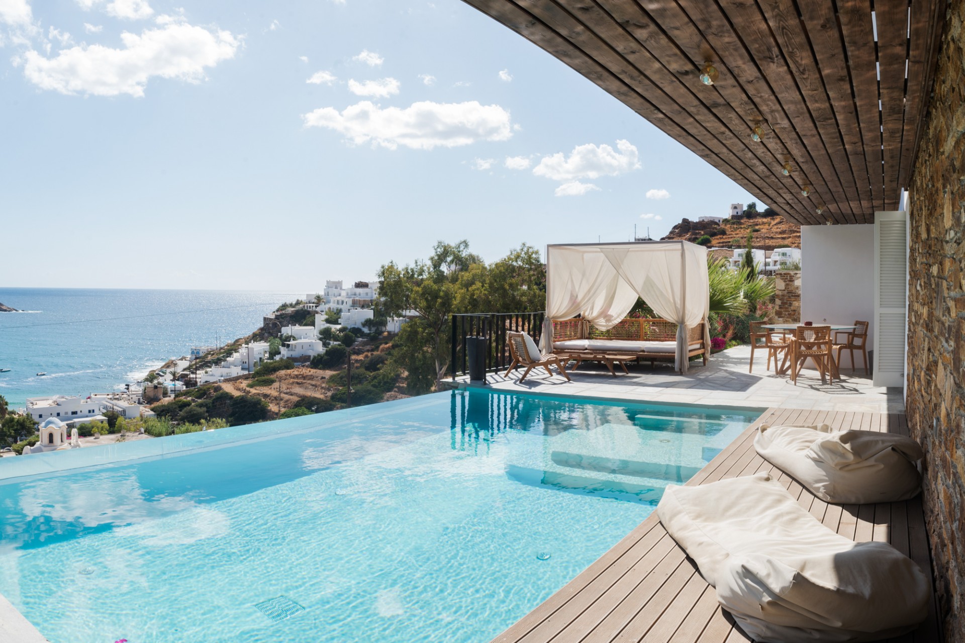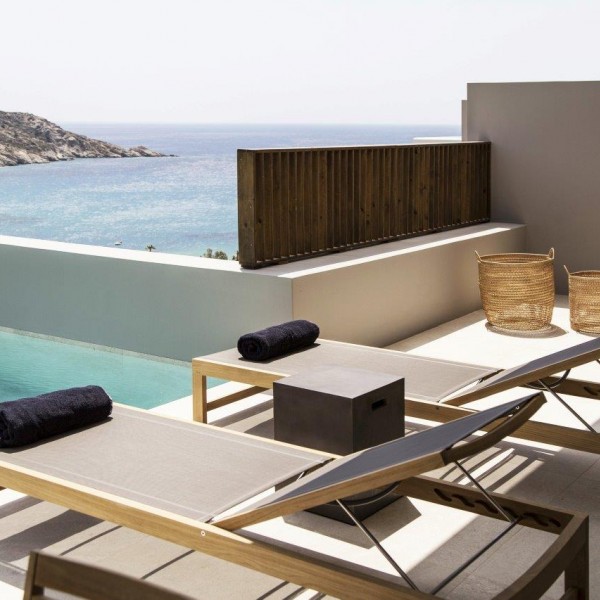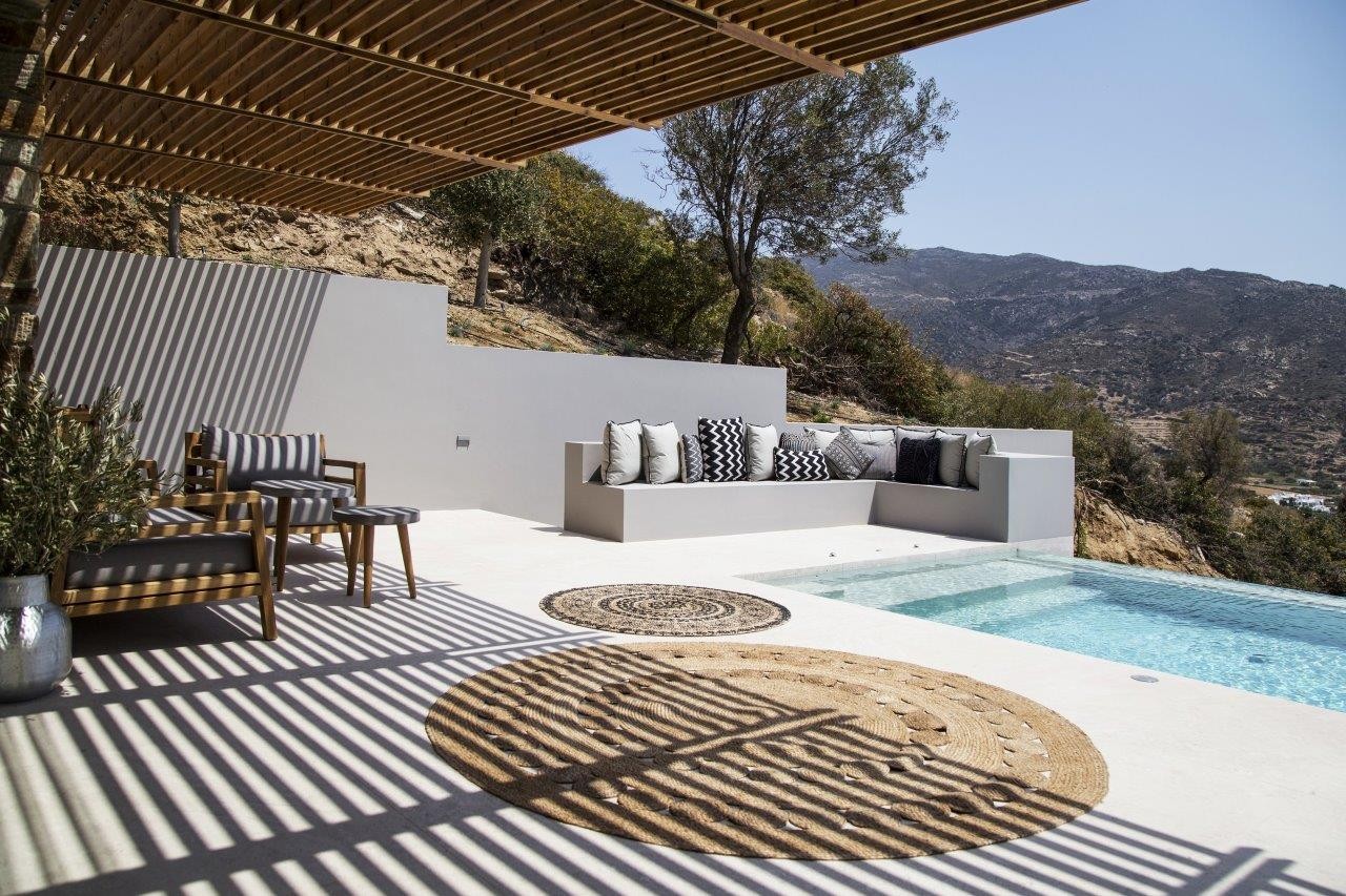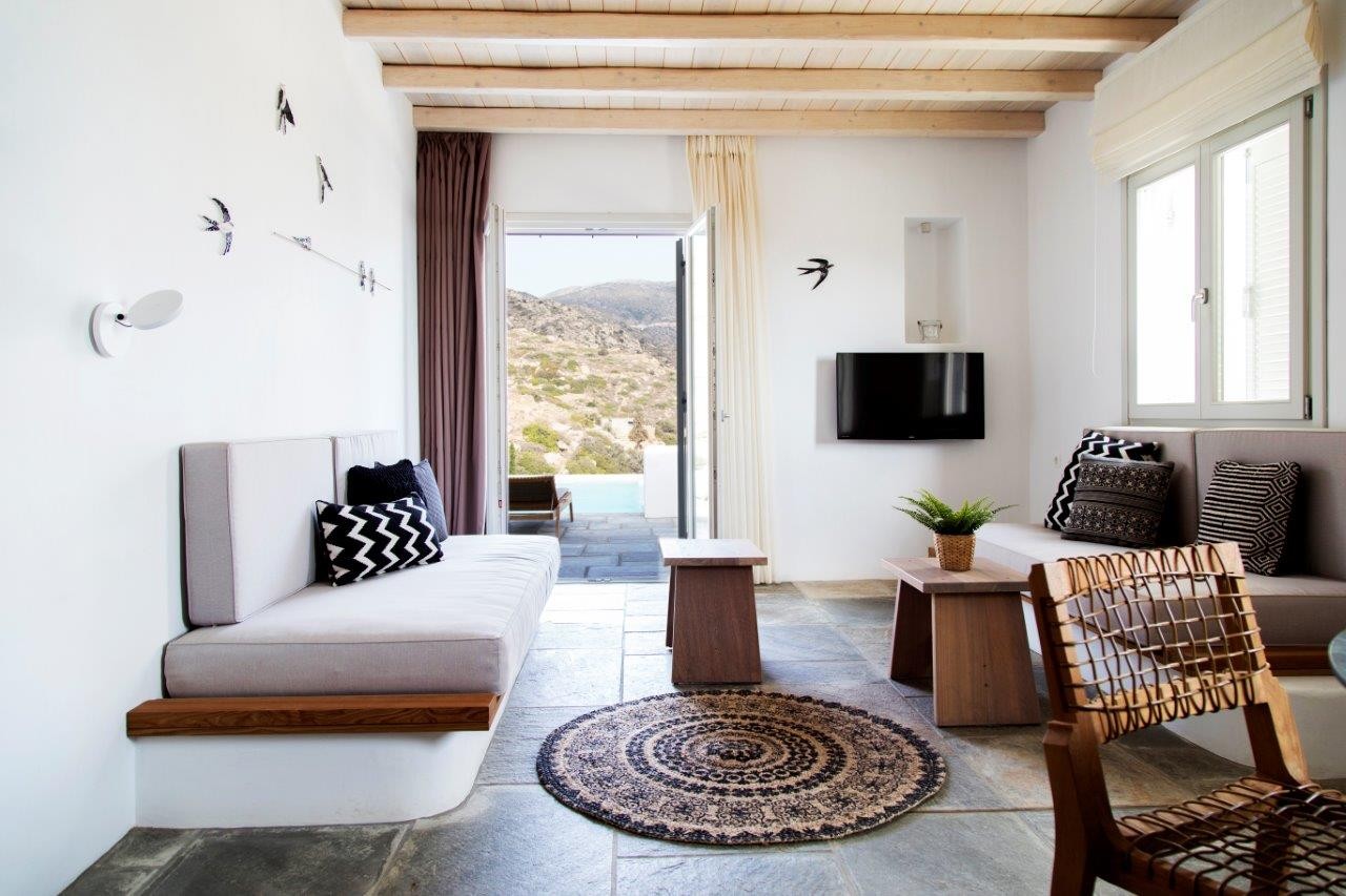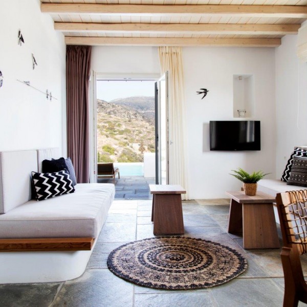 Su una collina proprio sopra la spiaggia di Mylopota premiata, con vista sulle acque scintillanti dell'Egeo, Hideout Suites è un complesso cicladico bianco cicladico di 12 suite di lusso, ne hanno una con la loro piscina privata di Veranta e nuoto.