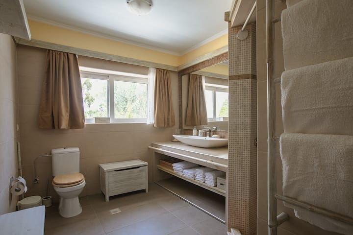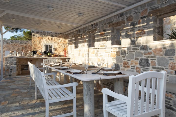 La casa è immersa tra cespugli di rosmarino e lavanda, ulivi, eucalipti e proprio accanto a una pineta. La sua posizione gode quotidianamente del tramonto sulle montagne, mentre la mancanza di luce ambientale crea un paradiso per gli spettatori ogni notte dell'estate. In questa splendida villa per vacanze, ampie aree soggiorno all'aperto accoglienti, vi invitano ad assaporare le vibrazioni positive della natura nelle isole greche.