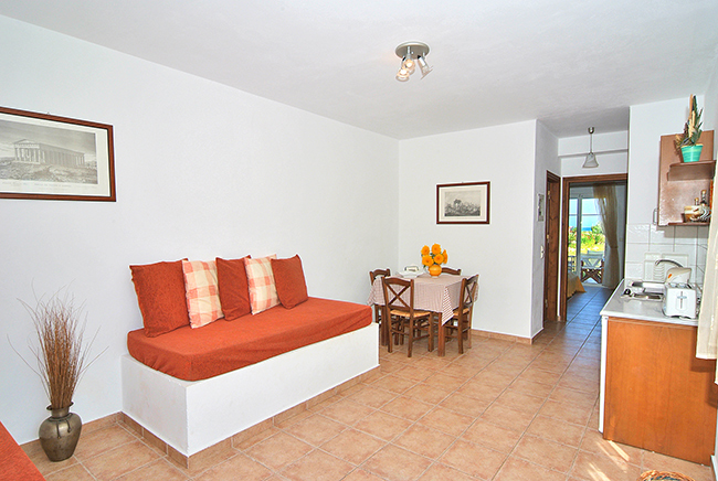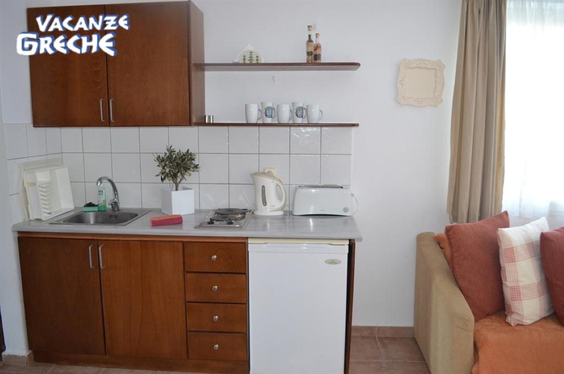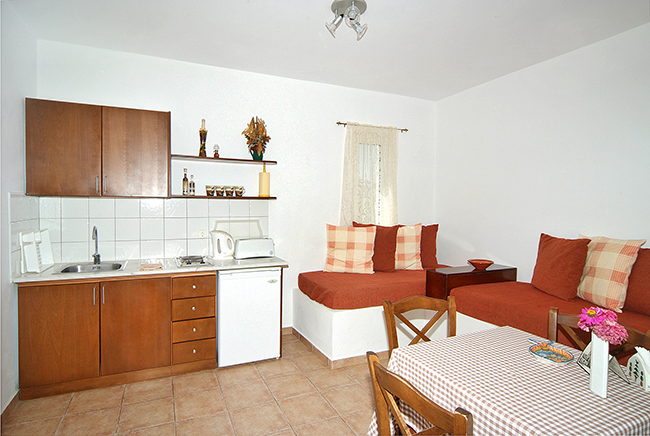 A poca distanza (circa 10/15 min a piedi) si trova il centro del villaggio con i suoi negozi, bar e taverne. All'esterno dell'appartamento è possibile fare delle grigliate o rilassarsi sotto al pergolato. Una soluzione ideale per famiglie con bambini. Il mini market e la taverna più vicina si trovano a 5 minuti a piedi. Ogni appartamento ha un angolo cottura completamente attrezzato con 2 piastre di cottura, frigorifero, bollitore e tostapane.