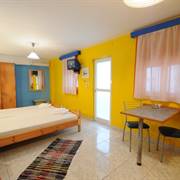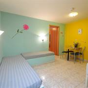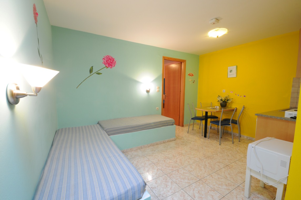 Tutti gli appartamenti con piccolo angolo cottura, bagno privato, balcone o terrazza e aria condizionata, sono arredati in modo semplice ma funzionale con un tocco di colore che ravviva ogni singola stanza.