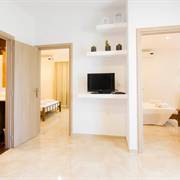 Camere da letto con letto matrimoniale, cucina, soggiorno, balcone.