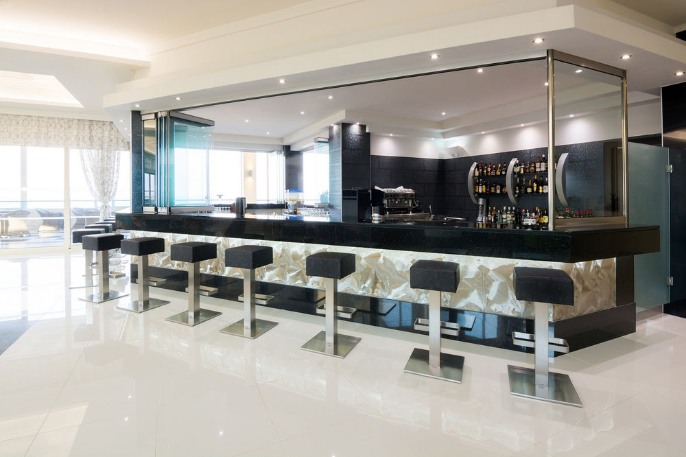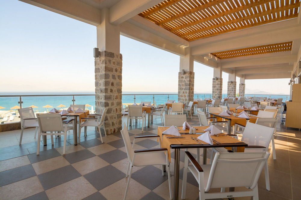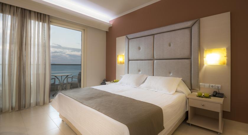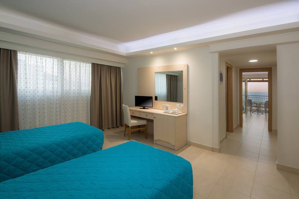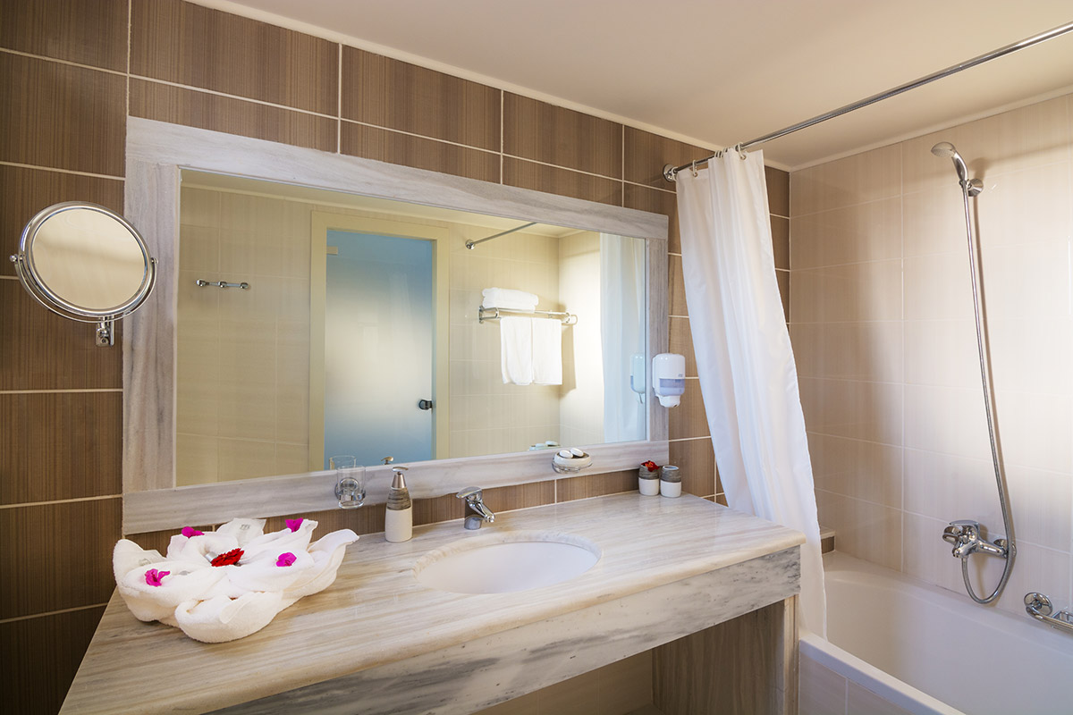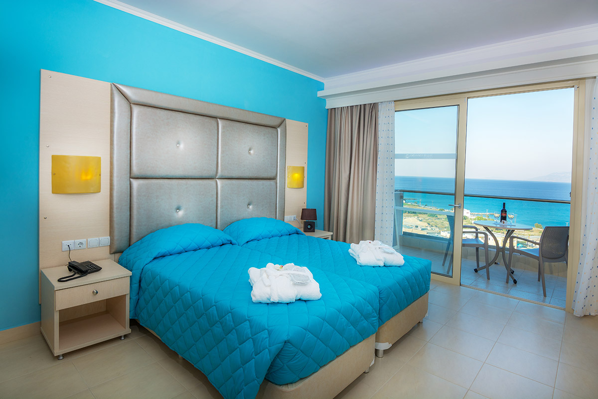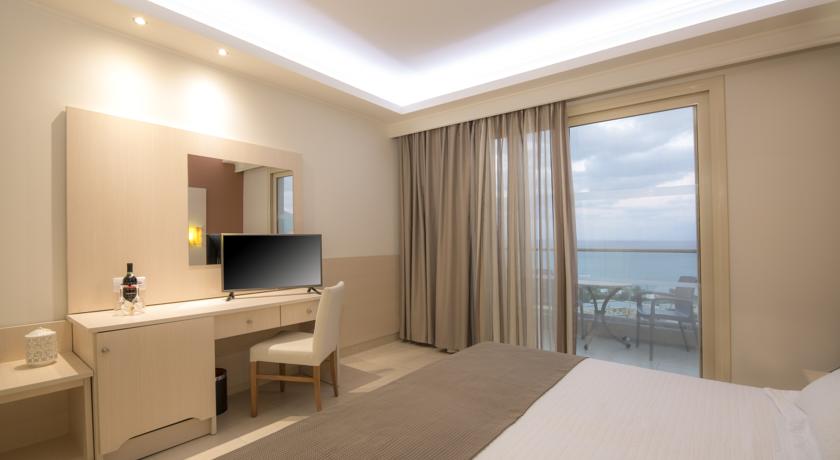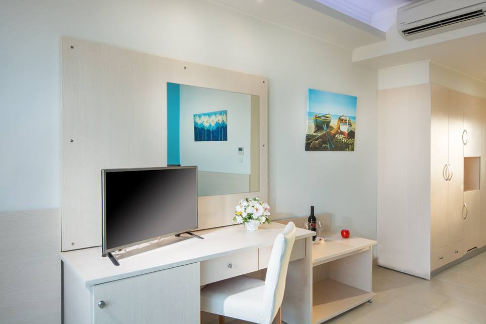 Alloggerete in camere dotate di bagno privato completo di set di cortesia e phon, che includono la vista sulla piscina, sul mare o sul giardino, e una TV a schermo piatto con canali satellitari.