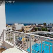 Tutte le camere presentano ampie vetrate, un balcone con vista sulla piscina, sul Mar Egeo o sulla montagna, una TV con canali satellitari, un frigorifero e un bagno privato con asciugacapelli.