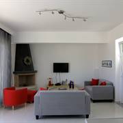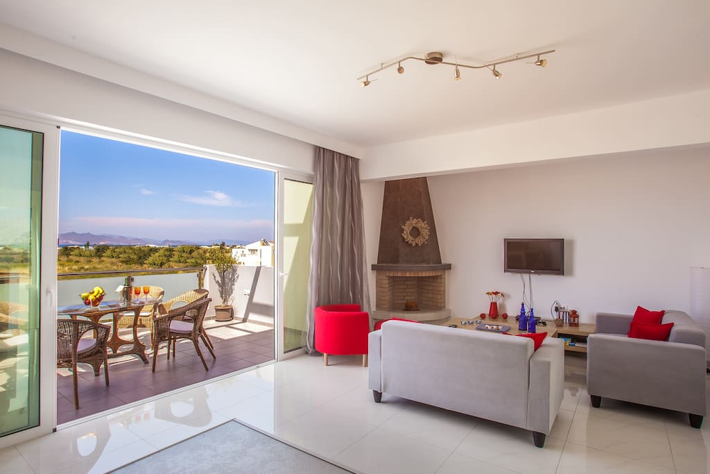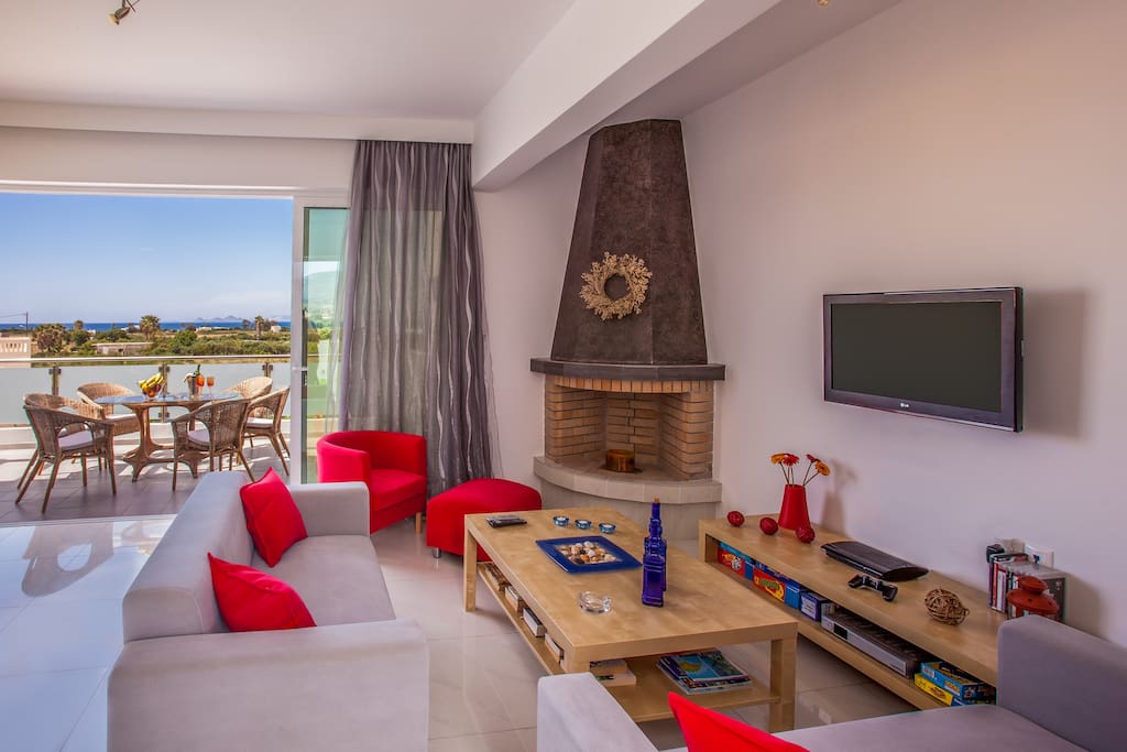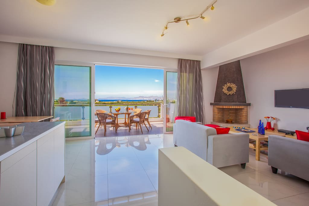 L'interno della villa è di design moderno con grandi finestre e una vista mozzafiato sul mare. È inoltre possibile vedere l'isola di Kalymnos e la costa turca dal soggiorno.