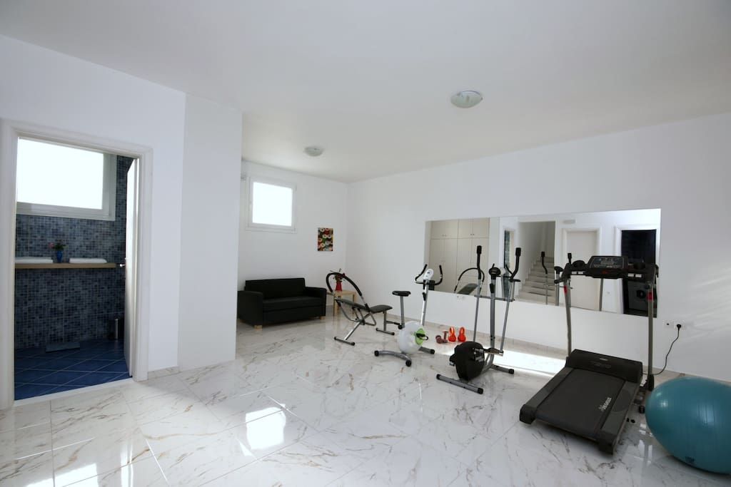 Il piano terra è composto da una grande stanza (55) con una palestra completa e un divano letto aggiuntivo che può ospitare 2 persone., Più 1 camera da letto con due letti singoli.