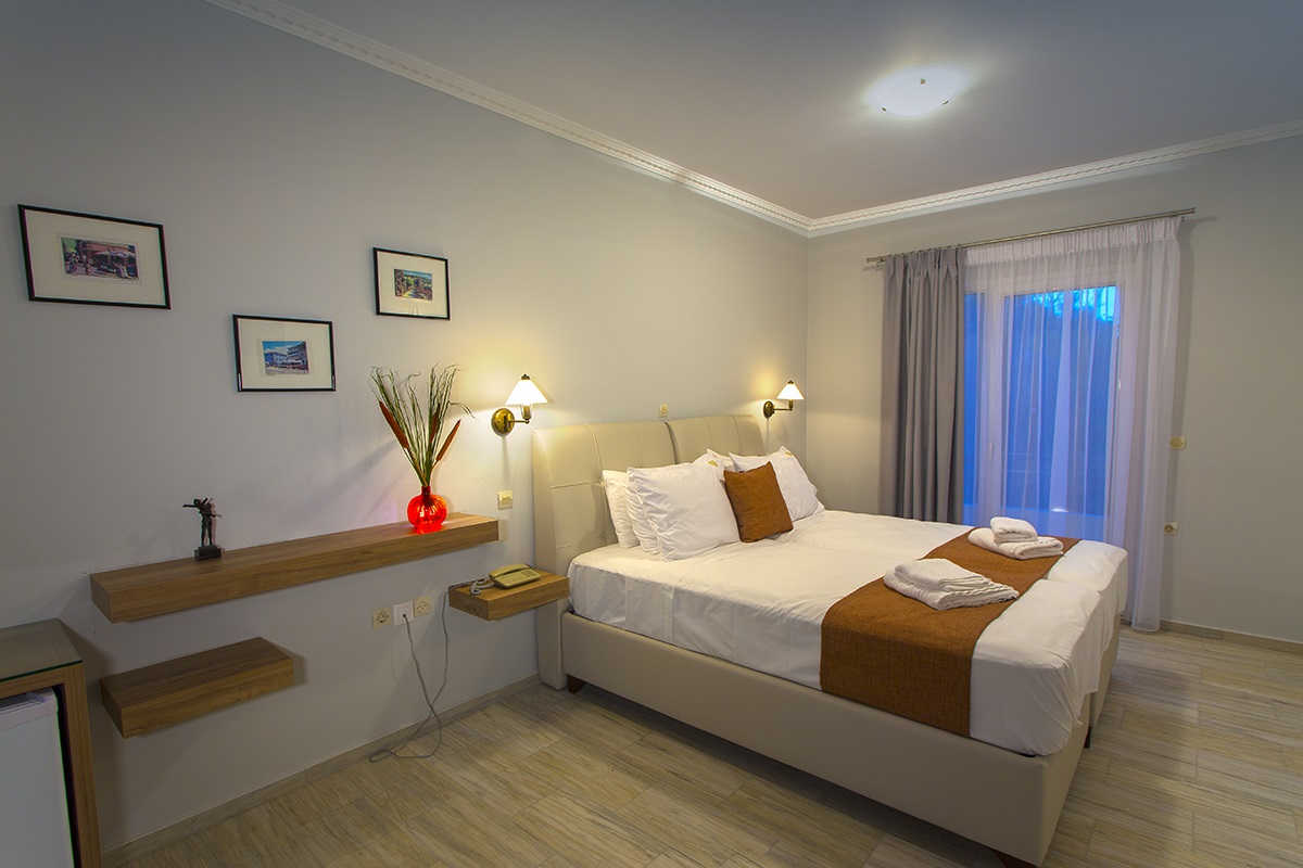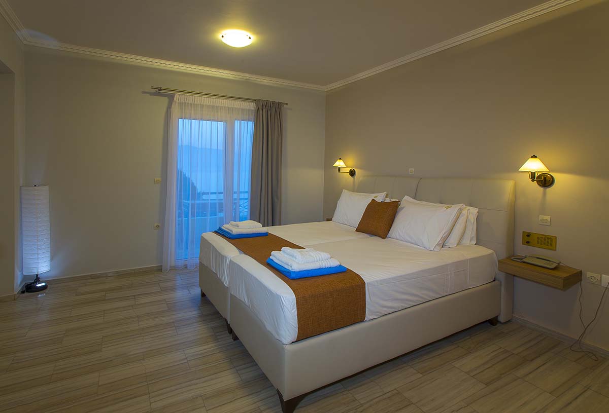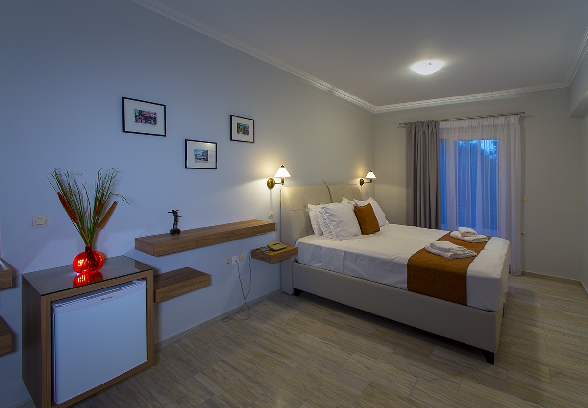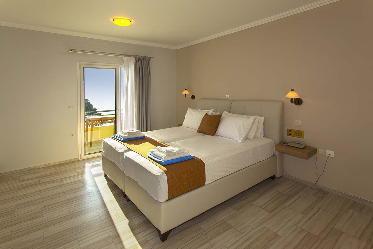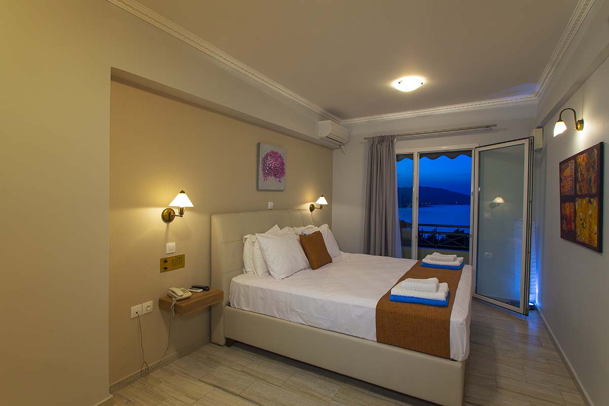 Gli alloggi  recentemente ristrutturato hanno una magnifica vista. Le camere sono attrezzate con letto matrimoniale o 2 letti singoli con divano letto, minibar, TV, aria condizionata. Tutte le camere sono dotate di balcone dove si può sedere, bere, mangiare spuntini e semplicemente godersi la spettacolare vista sul mare delle isole vicine, tra cui gli Scorpioni di proprietà della famiglia Onassis.