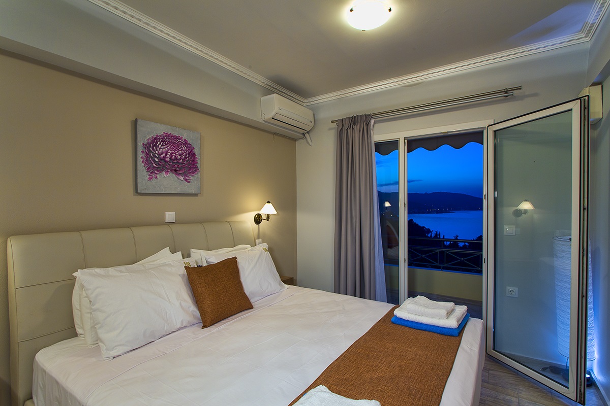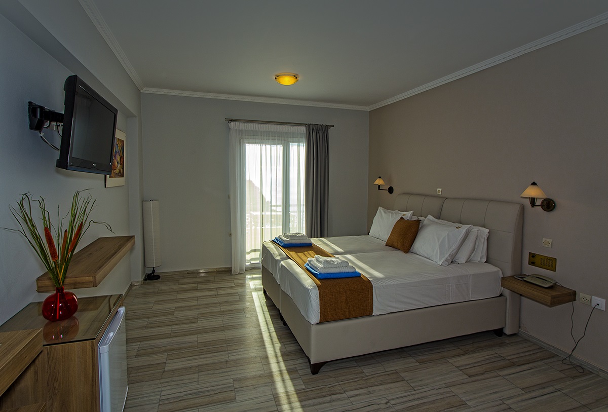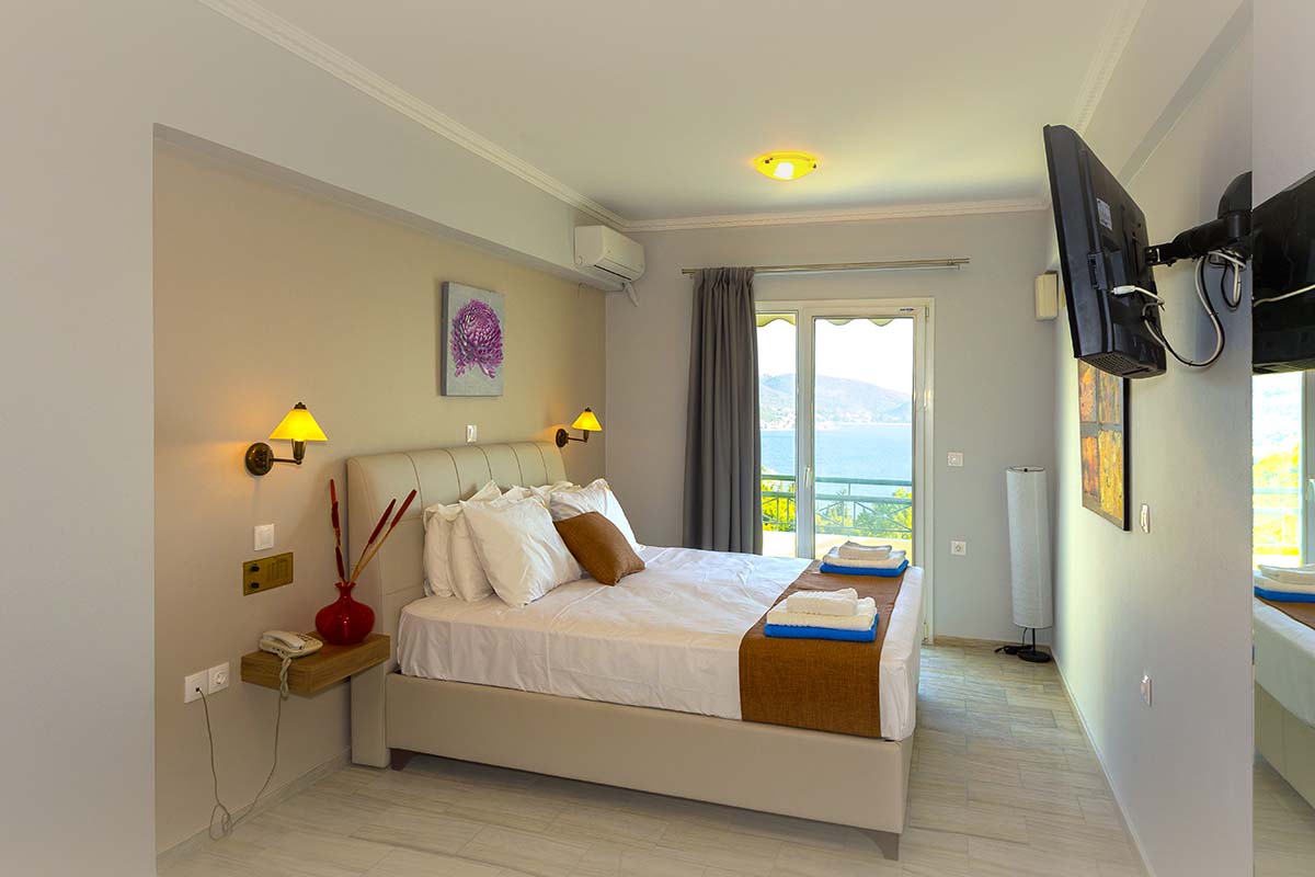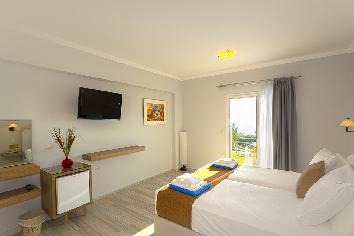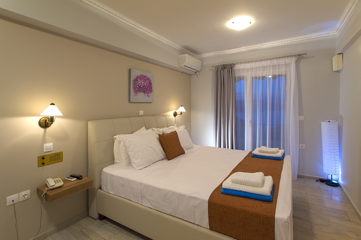 Gli alloggi  recentemente ristrutturato hanno una magnifica vista. Le camere sono attrezzate con letto matrimoniale o 2 letti singoli con divano letto, minibar, TV, aria condizionata. Tutte le camere sono dotate di balcone dove si può sedere, bere, mangiare spuntini e semplicemente godersi la spettacolare vista sul mare delle isole vicine, tra cui gli Scorpioni di proprietà della famiglia Onassis.