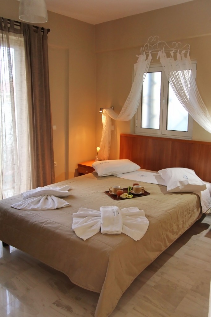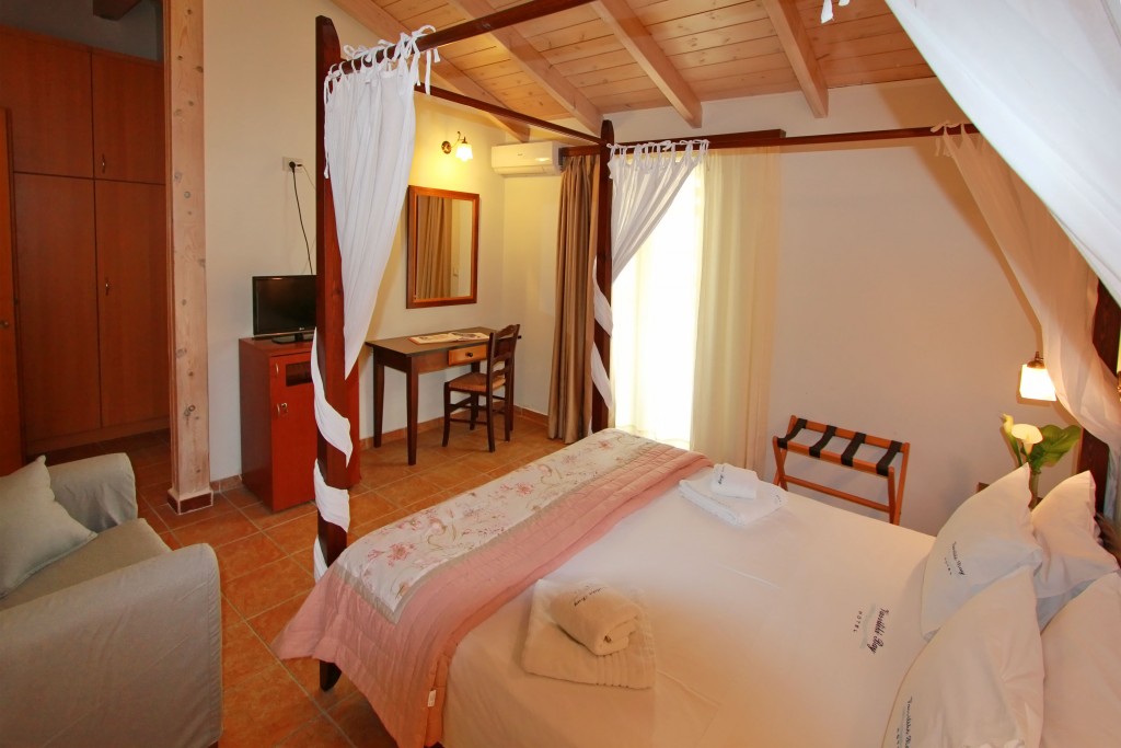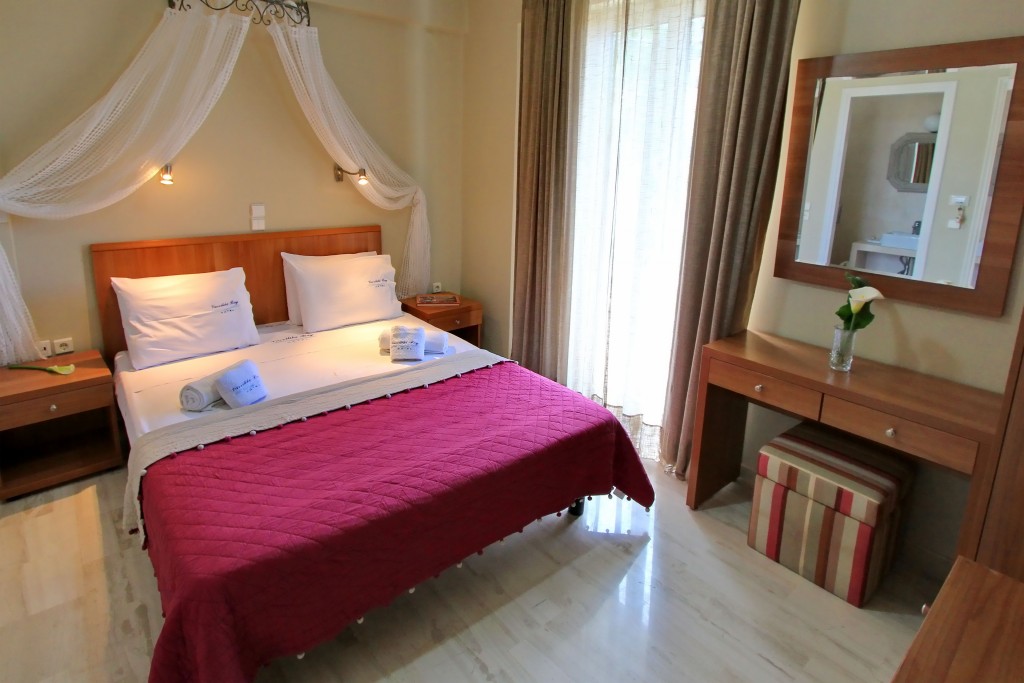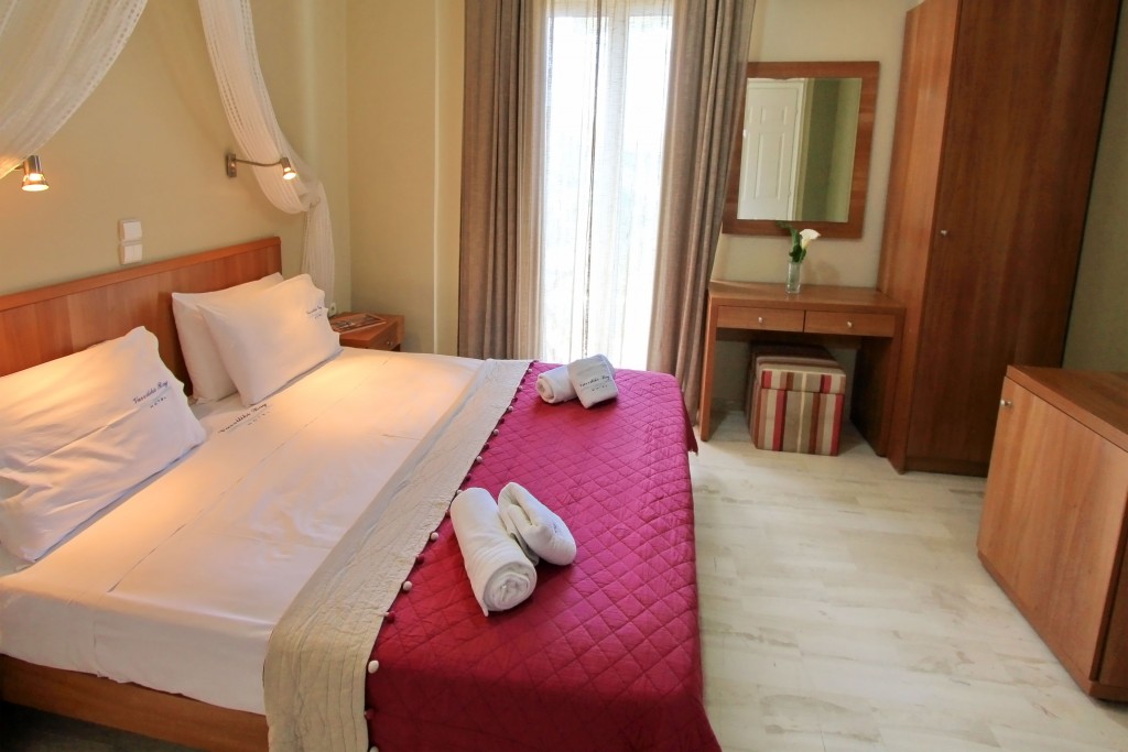 Luminose e arredate con gusto, le camere e le suite del Vassiliki Bay Hotel dispongono di balcone, bagno privato, aria condizionata, TV satellitare e frigorifero.