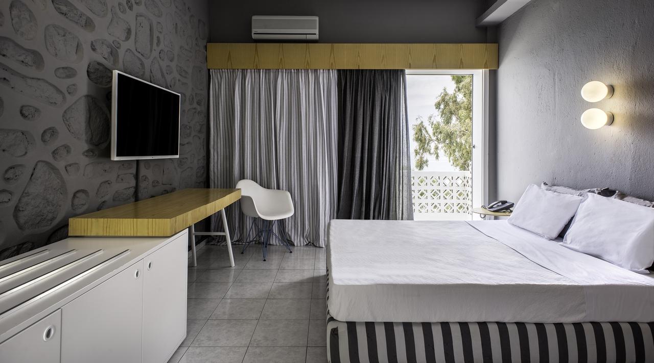 Tutte ampie e climatizzate, le camere dell'Alkistis Hotel sono ben arredate e includono un frigorifero per le bevande, un balcone privato con splendida vista sul mare, un comodo letto e una TV satellitare.