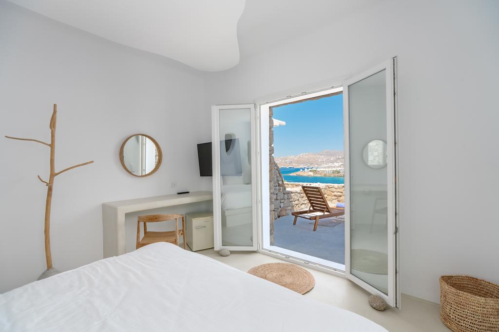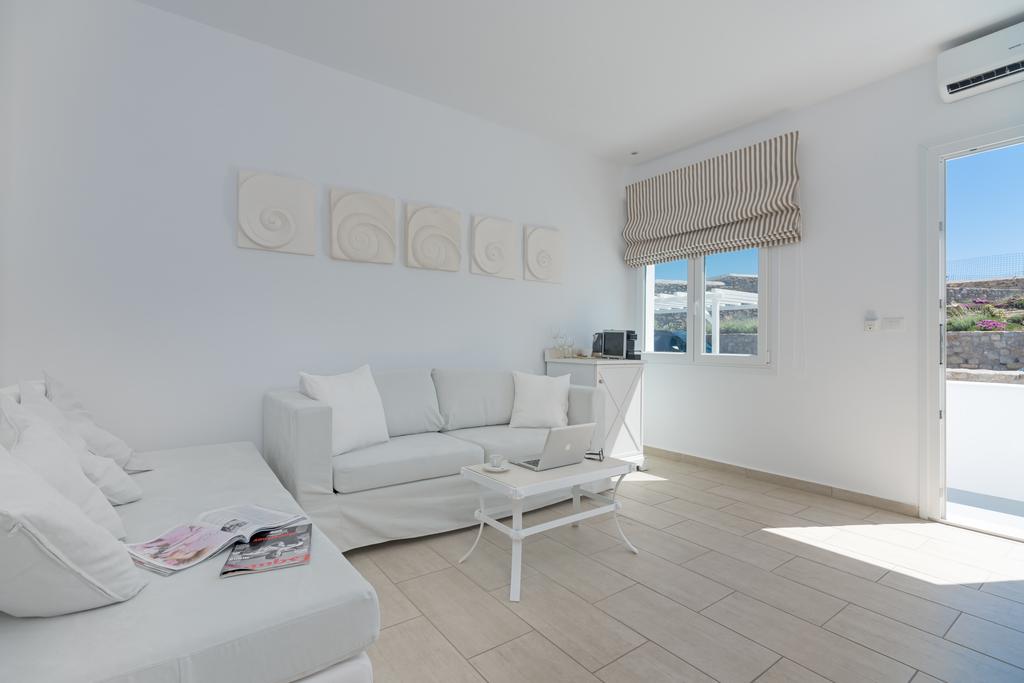 Dotate di pavimenti piastrellati, arredi ben scelti e pareti imbiancate, le unità del Cape Mykonos presentano balcone privato arredato, camera da letto separata, soggiorno e bagno moderno con doccia, asciugacapelli e set di cortesia, 1 camera da letto, soggiorno, bagno moderno con doccia, asciugacapelli e set di cortesia, TV a schermo piatto, macchinetta del caffè, bollitore elettrico e cestino per la colazione fornito ogni giorno negli alloggi.
