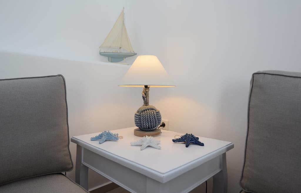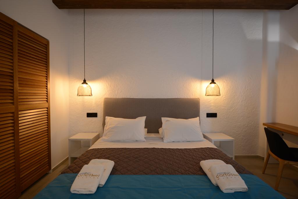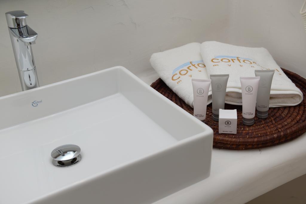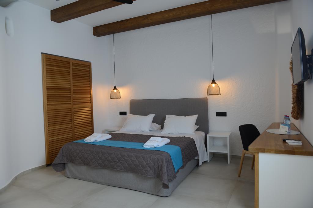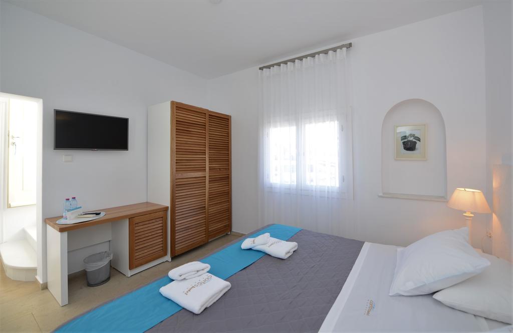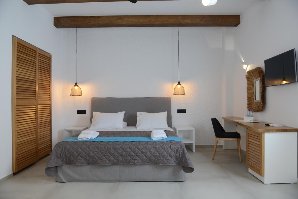 Arredate in stile minimalista con mobili in bianco e azzurro, le sistemazioni del Corfos Hotel sono dotate di TV satellitare e frigorifero.
