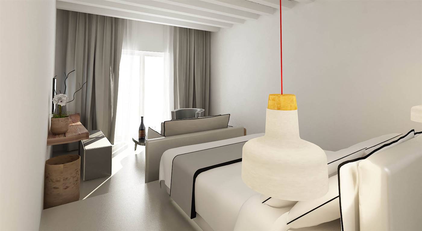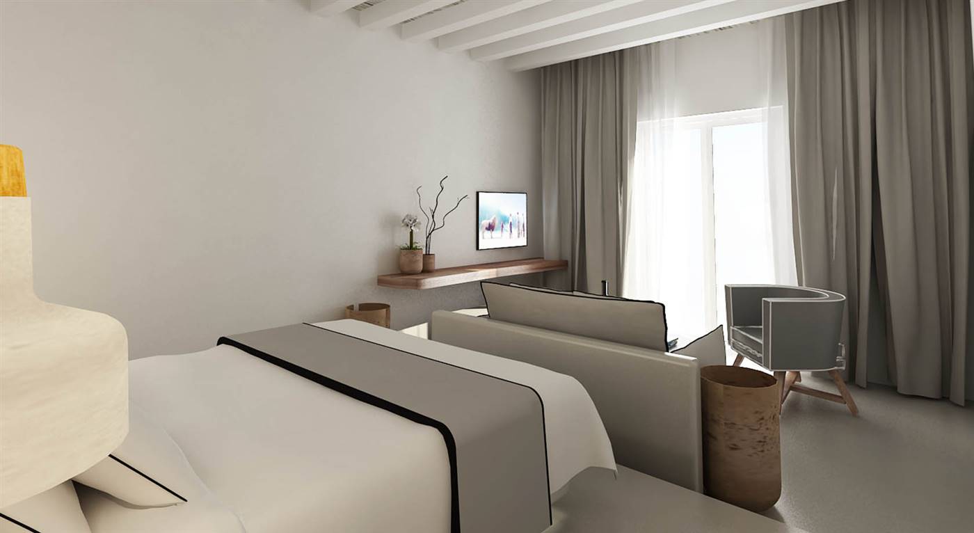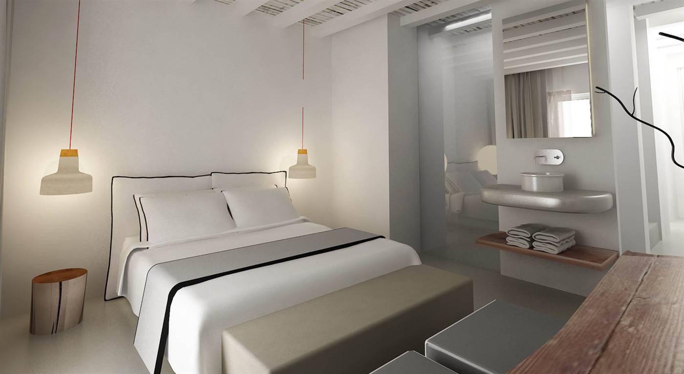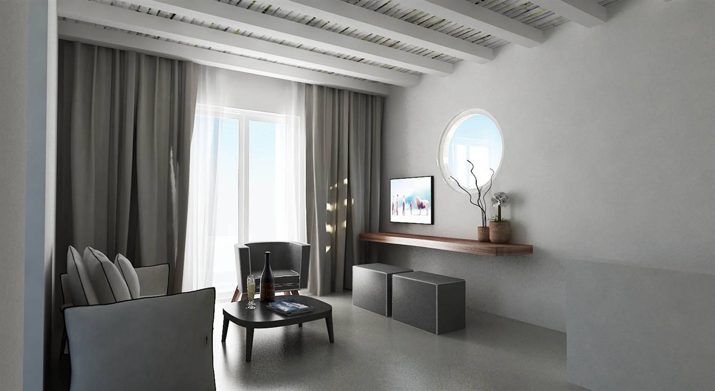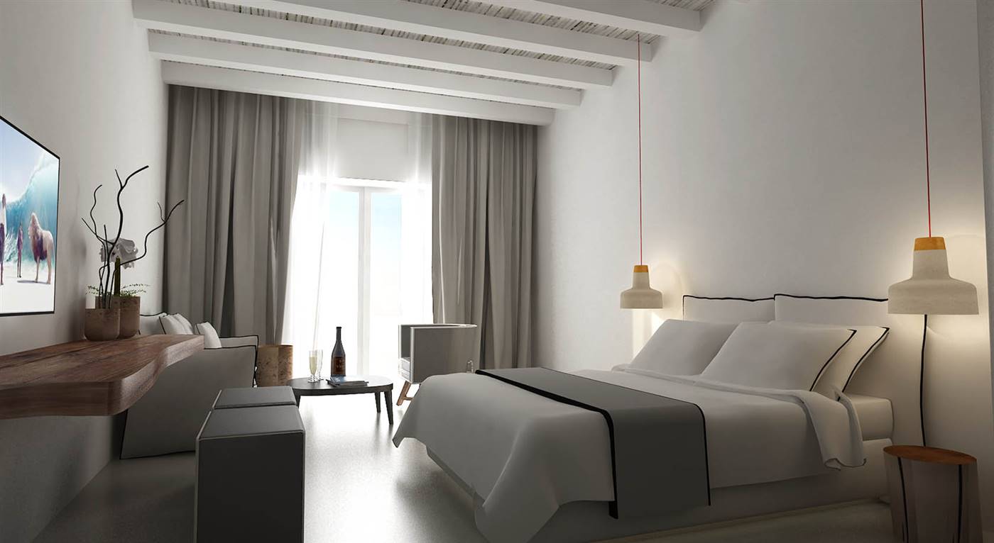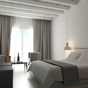 Gli alloggi, che riprendono lo stile tradizionale delle Cicladi con tocchi moderni, comprendono una TV a schermo piatto, un minibar, l'aria condizionata e in alcuni casi anche una zona soggiorno. Il personale offre il servizio concierge e il trasferimento gratuito su richiesta per il porto (a 4 km) e l'aeroporto (a 1 km) dell'isola.