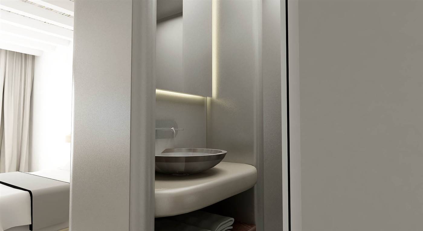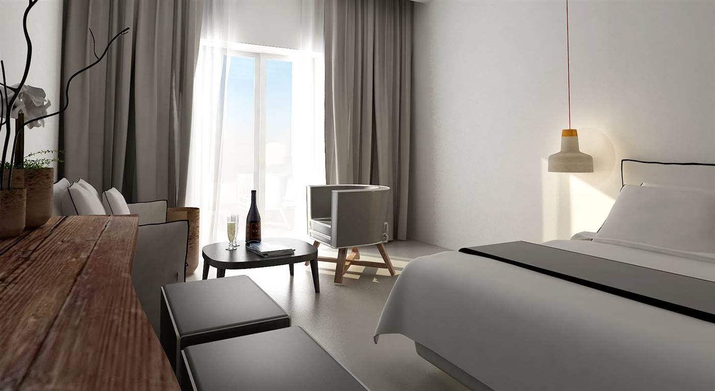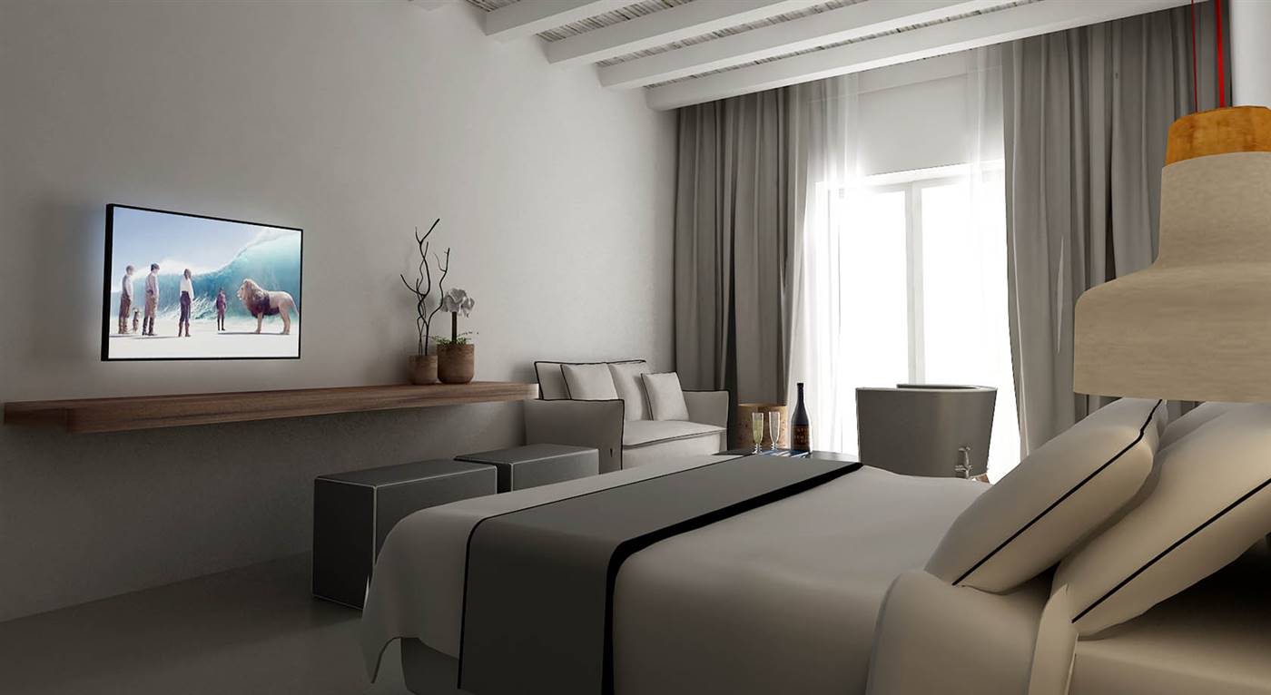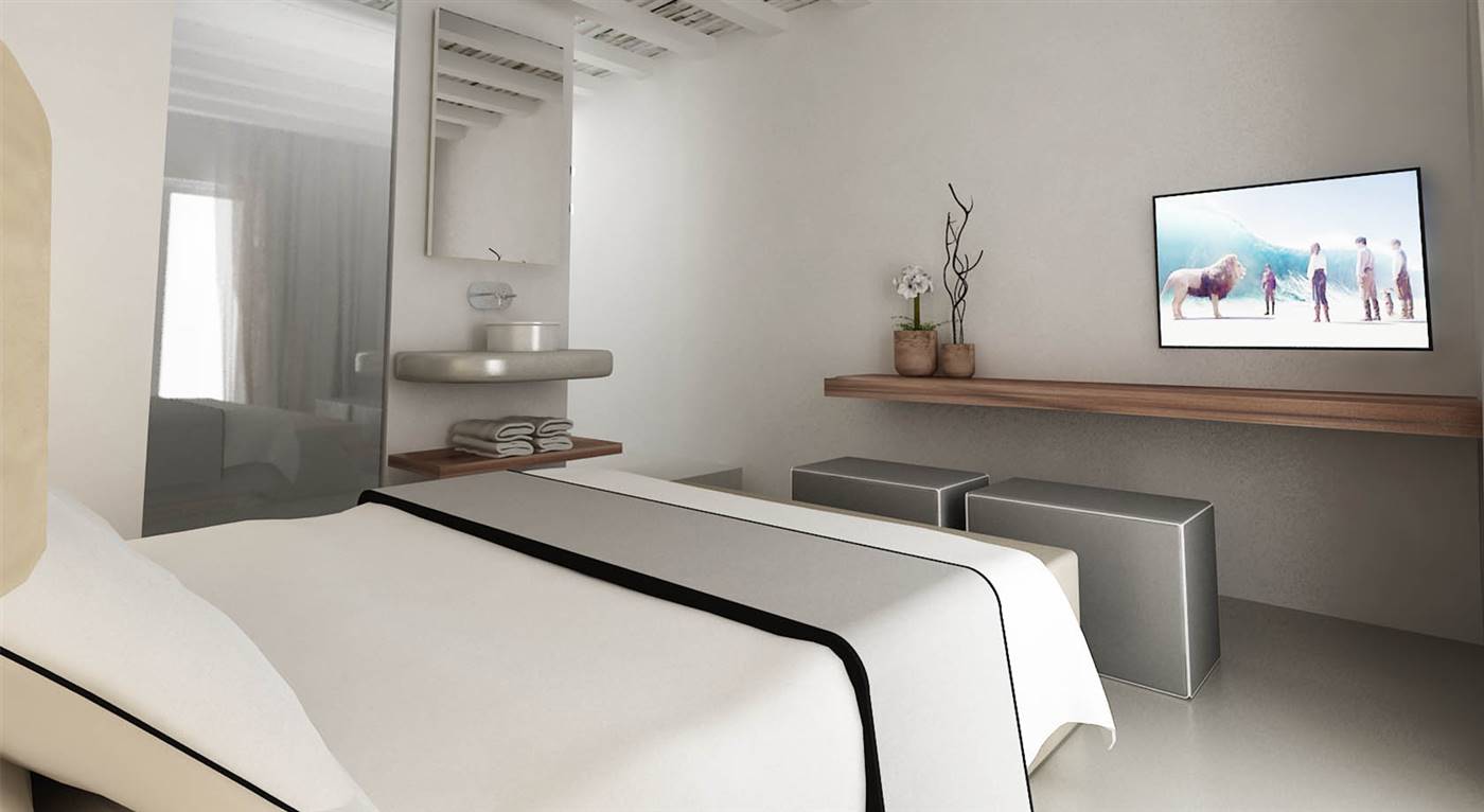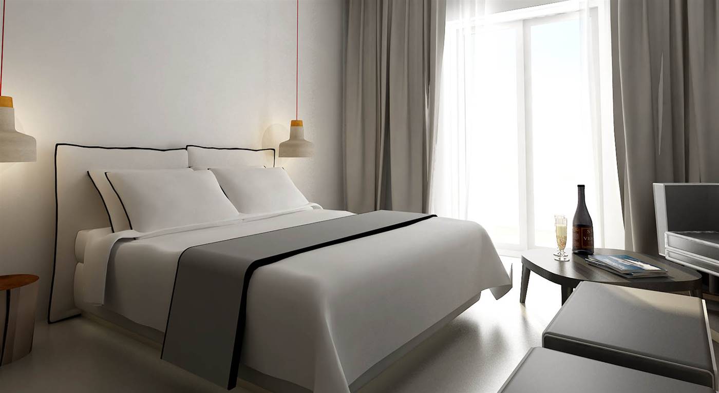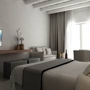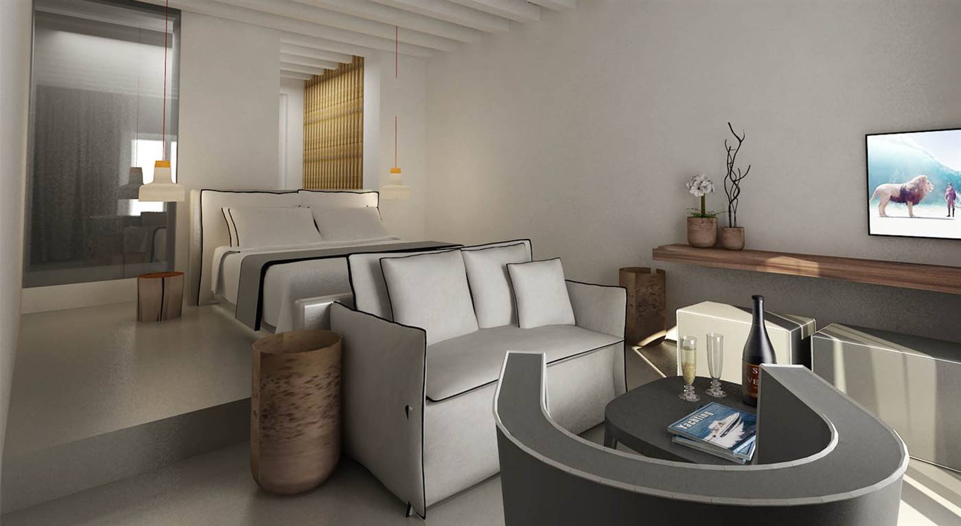 Gli alloggi, che riprendono lo stile tradizionale delle Cicladi con tocchi moderni, comprendono una TV a schermo piatto, un minibar, l'aria condizionata e in alcuni casi anche una zona soggiorno. Il personale offre il servizio concierge e il trasferimento gratuito su richiesta per il porto (a 4 km) e l'aeroporto (a 1 km) dell'isola.