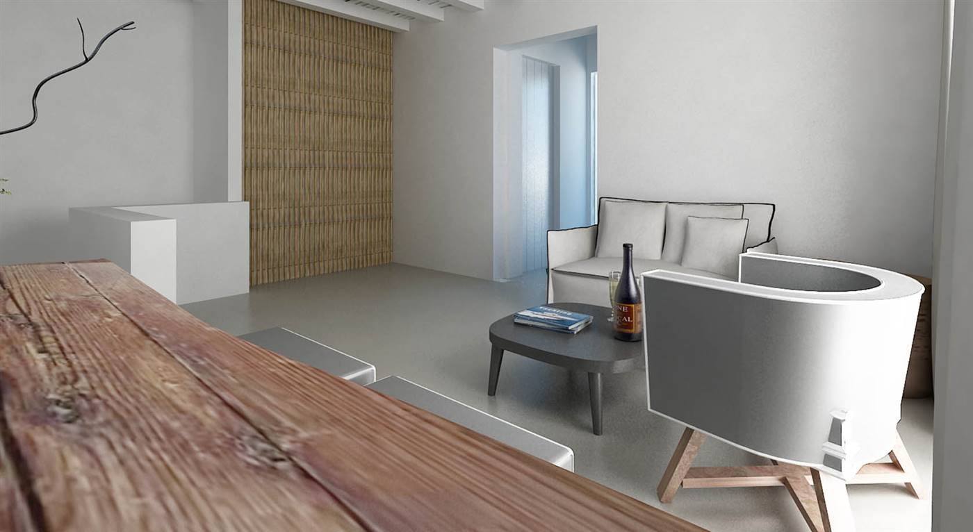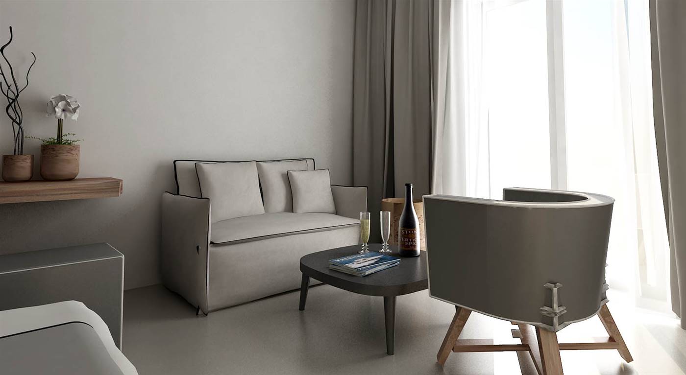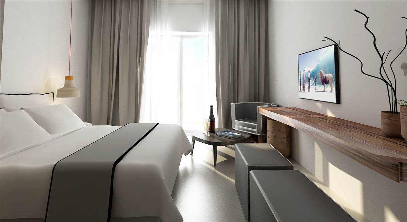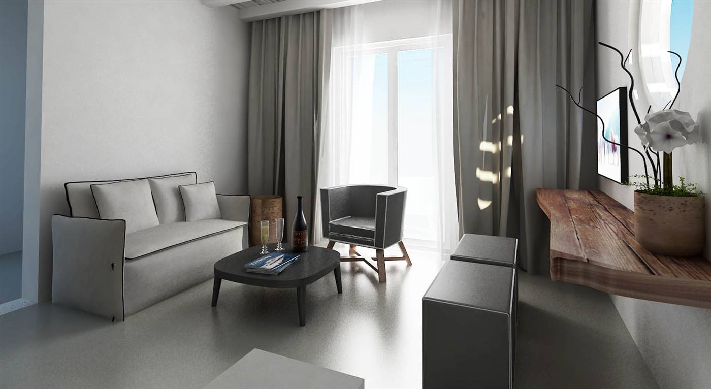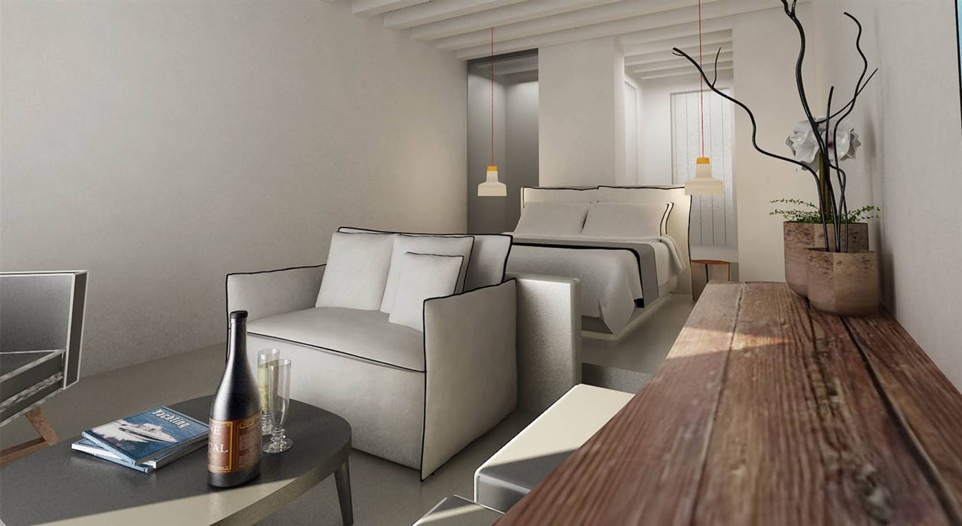 Gli alloggi, che riprendono lo stile tradizionale delle Cicladi con tocchi moderni, comprendono una TV a schermo piatto, un minibar, l'aria condizionata e in alcuni casi anche una zona soggiorno. Il personale offre il servizio concierge e il trasferimento gratuito su richiesta per il porto (a 4 km) e l'aeroporto (a 1 km) dell'isola.