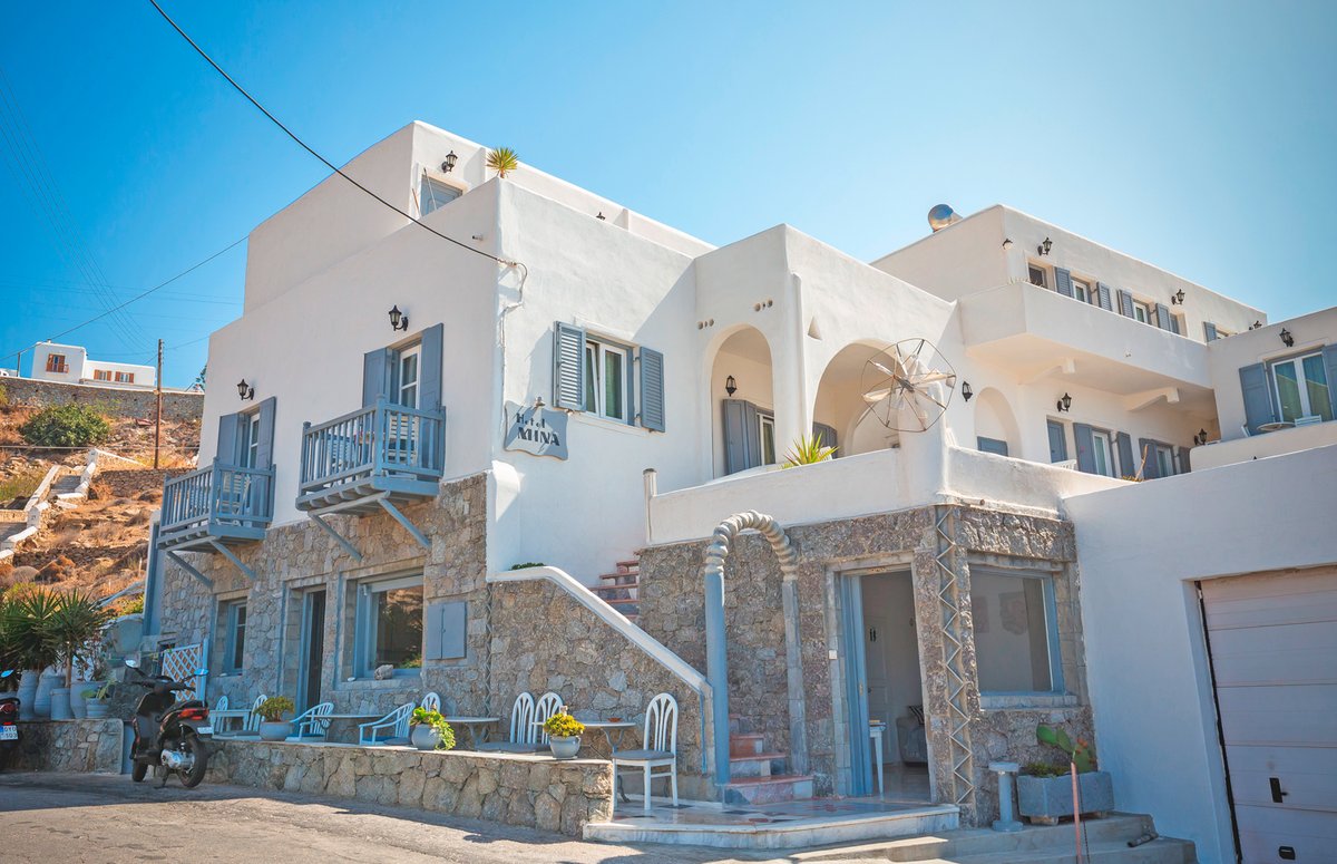 Si tratta di una piccola pensione, rinfrescata completamente nell'inverno 2017 e che si presenta ora con uno stile più fresco e arredi bianchissimi, perfettamente in linea con lo stile cicladico. La consigliamo a giovani che cercano una soluzione pratica e piacevole, per vivere al meglio l’isola facendo base in un comodo punto d’appoggio. Benché si trovi a pochi passi dalla bella spiaggia dorata di Agios Stefanos, vi consigliamo di abbinare il noleggio di un’auto, per scoprire le numerose spiagge e le opportunità di divertimento che hanno reso l’isola così famosa. Mykonos Town è comunque raggiungibile con una breve corsa di taxi o in pochi minuti d’auto. Vi aprirà le porte di serate davvero folli!