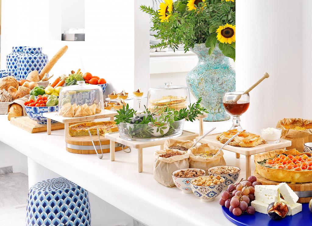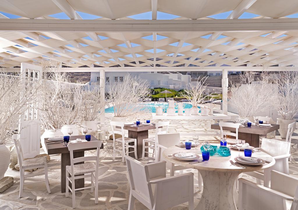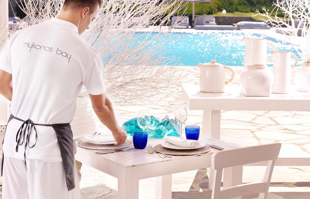 Ogni mattina vi attende una colazione mediterranea a buffet con ingredienti freschi, come torte e formaggi locali. In qualità di ospiti del Mykonos Bay Resort & Villas potrete godervi la gustosa cucina del ristorante alla carta a bordo piscina/mare e sorseggiare i cocktail del lounge bar della piscina, ammirando il tramonto nel Mar Egeo.