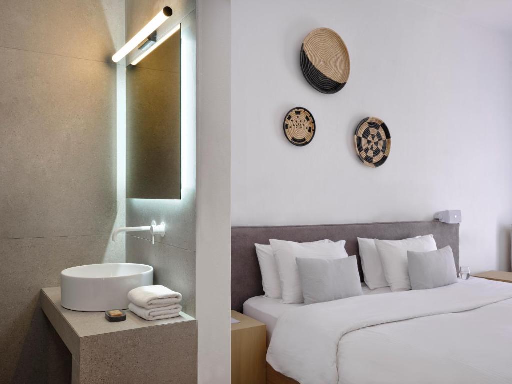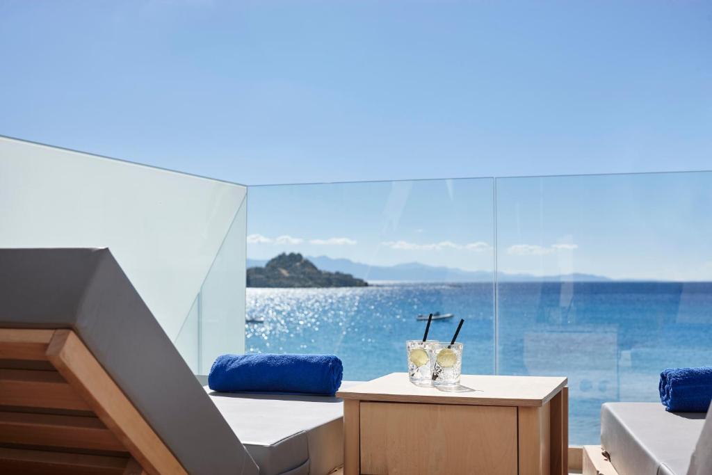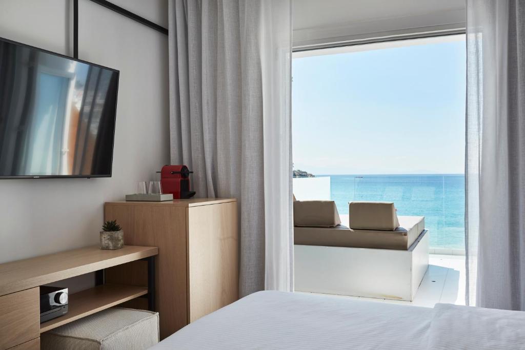 Tutte le camere del Kosmoplaz sono dotate di aria condizionata, balcone con vista sulla piscina o sul Mar Egeo, TV satellitare a schermo piatto e minibar.