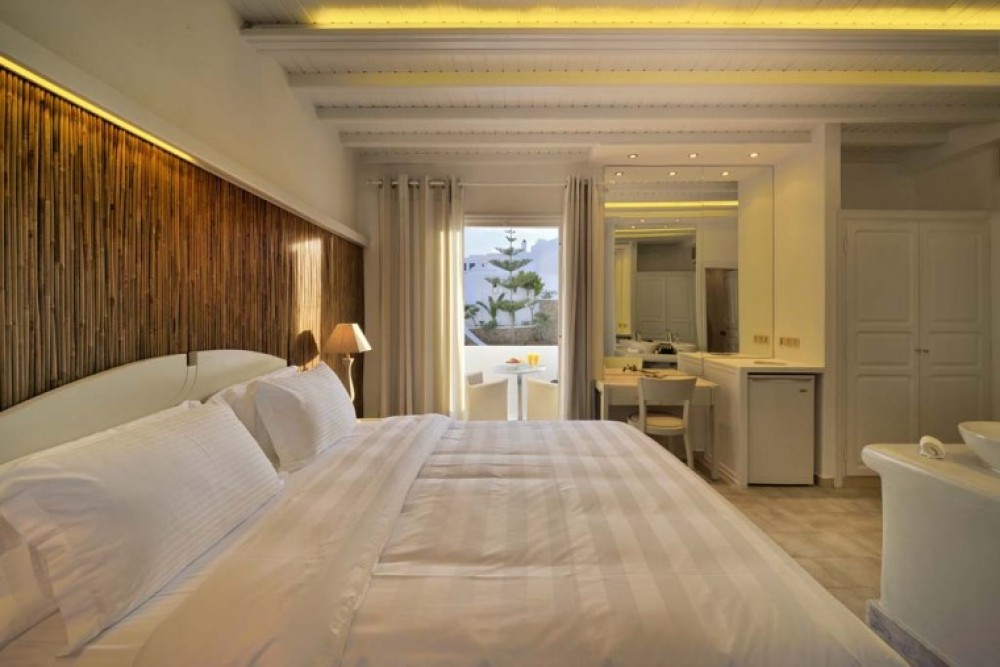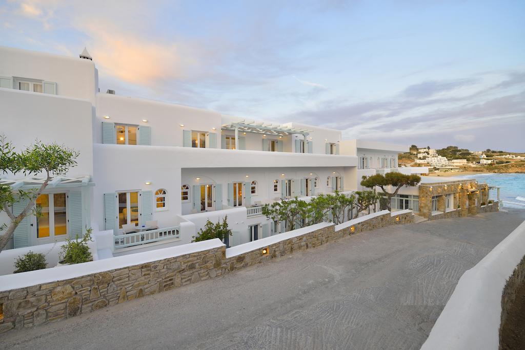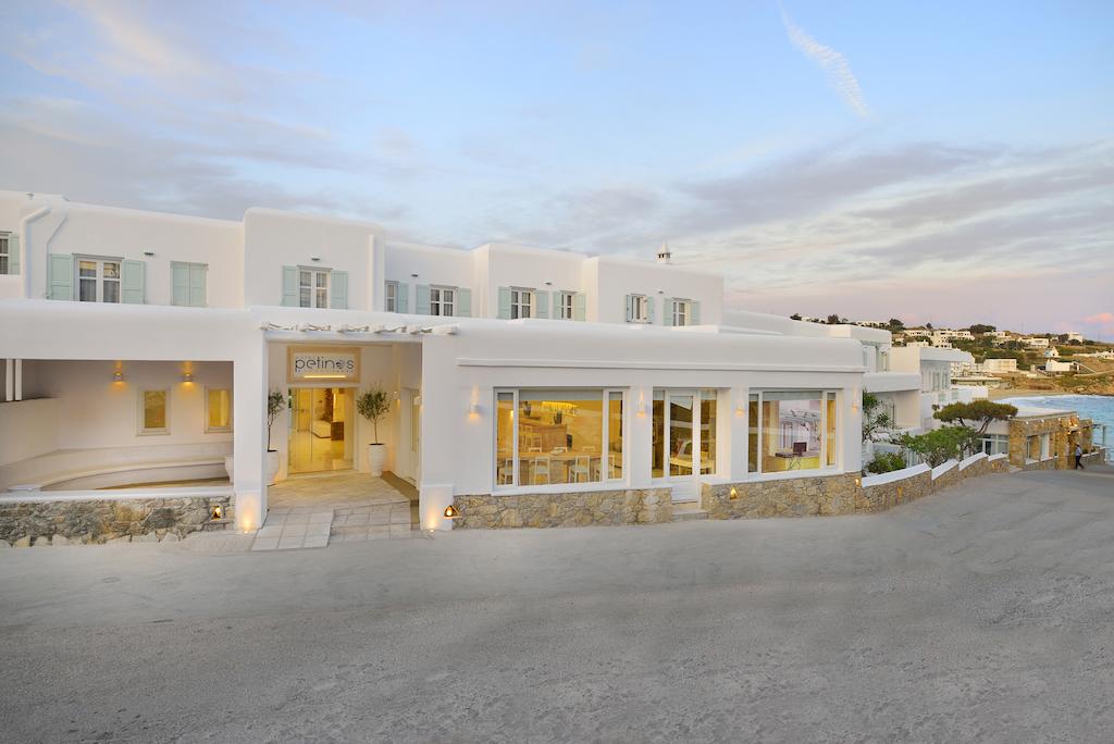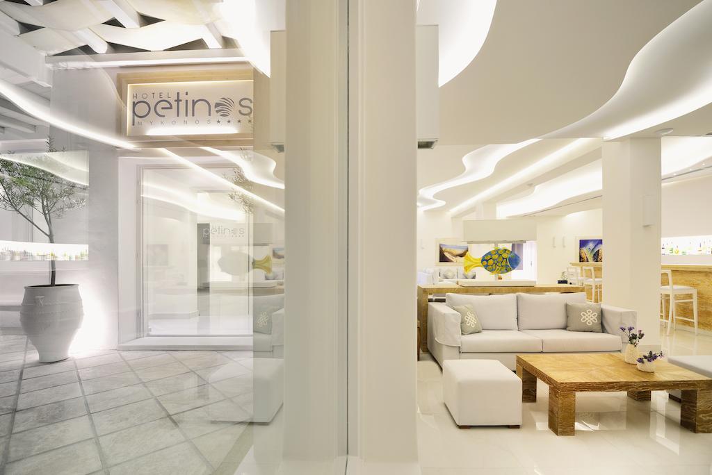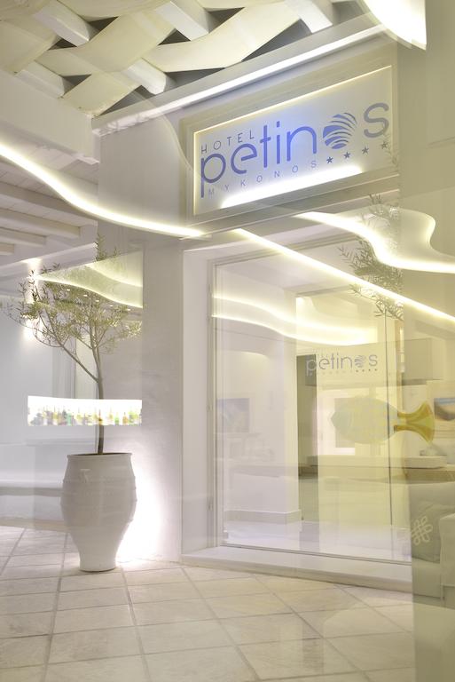 Il Petinos Beach Hotel, in stile cicladico, dista 200 metri dalla spiaggia di Platis Gialos a Mikonos e offre un salone all'aperto, una piscina all'aperto con bar e camere con balcone affacciato sul Mar Egeo.