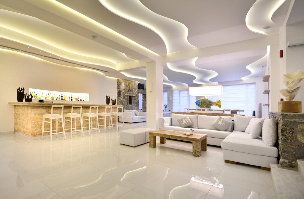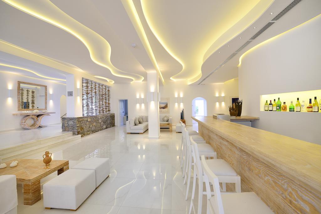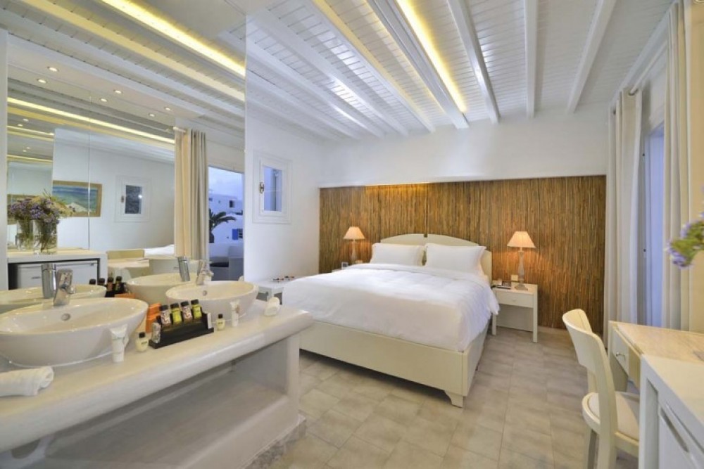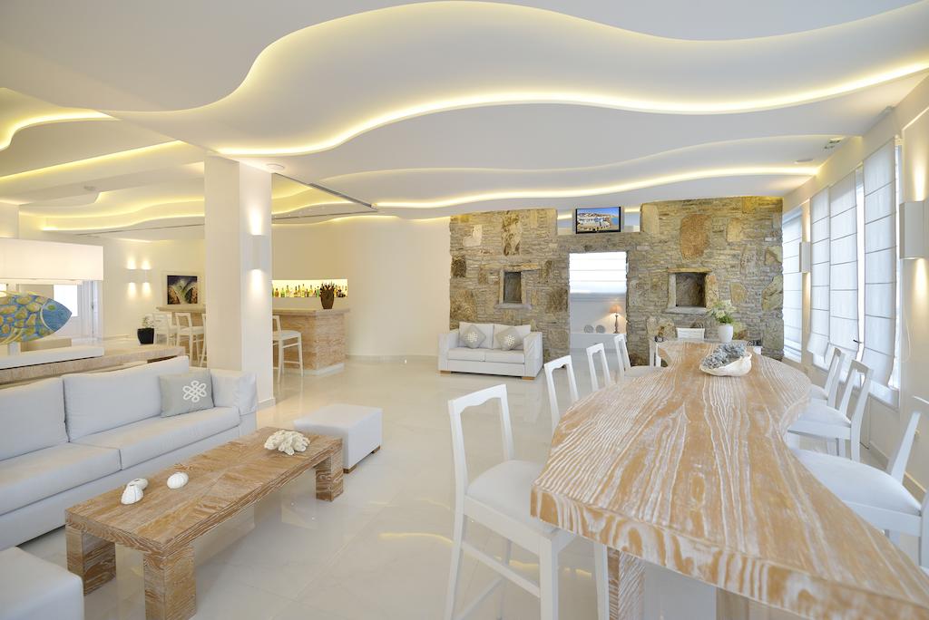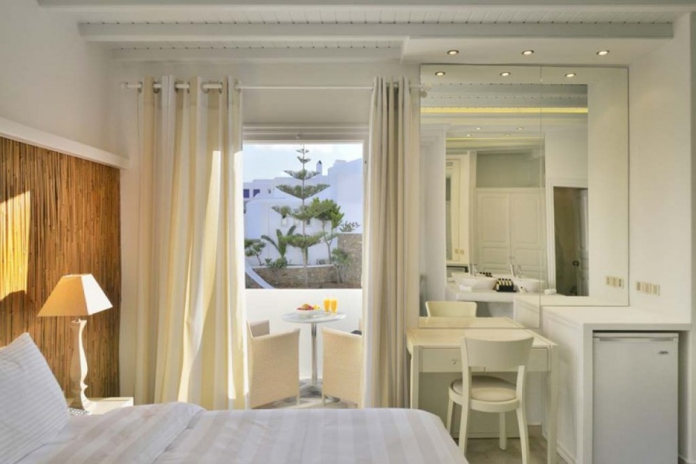Il Petinos Beach Hotel, in stile cicladico, dista 200 metri dalla spiaggia di Platis Gialos a Mikonos e offre un salone all'aperto, una piscina all'aperto con bar e camere con balcone affacciato sul Mar Egeo.