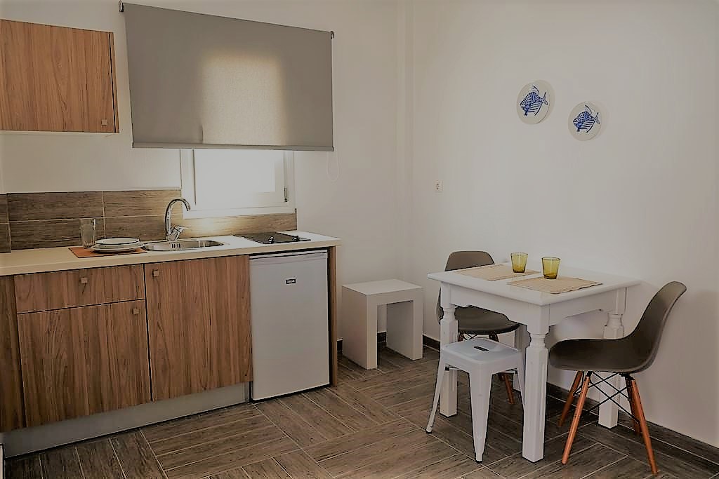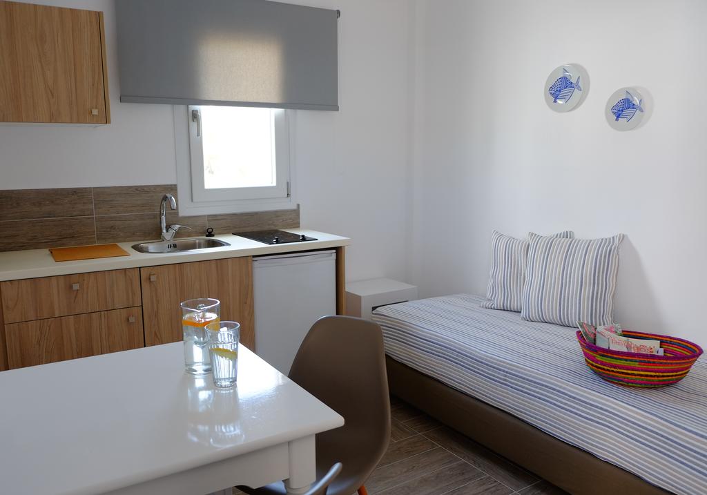 Arredati con mobili in legno e colori vivaci, i monolocali climatizzati dell'Ornos dispongono di angolo cottura con frigorifero e fornelli. Ogni unità comprende un'area salotto, una zona pranzo e una TV LCD. Il bagno privato è completo di asciugacapelli.