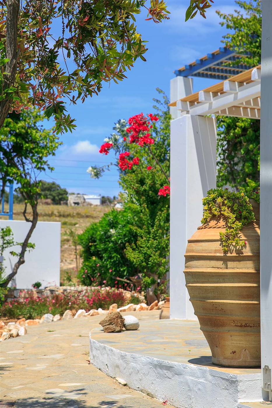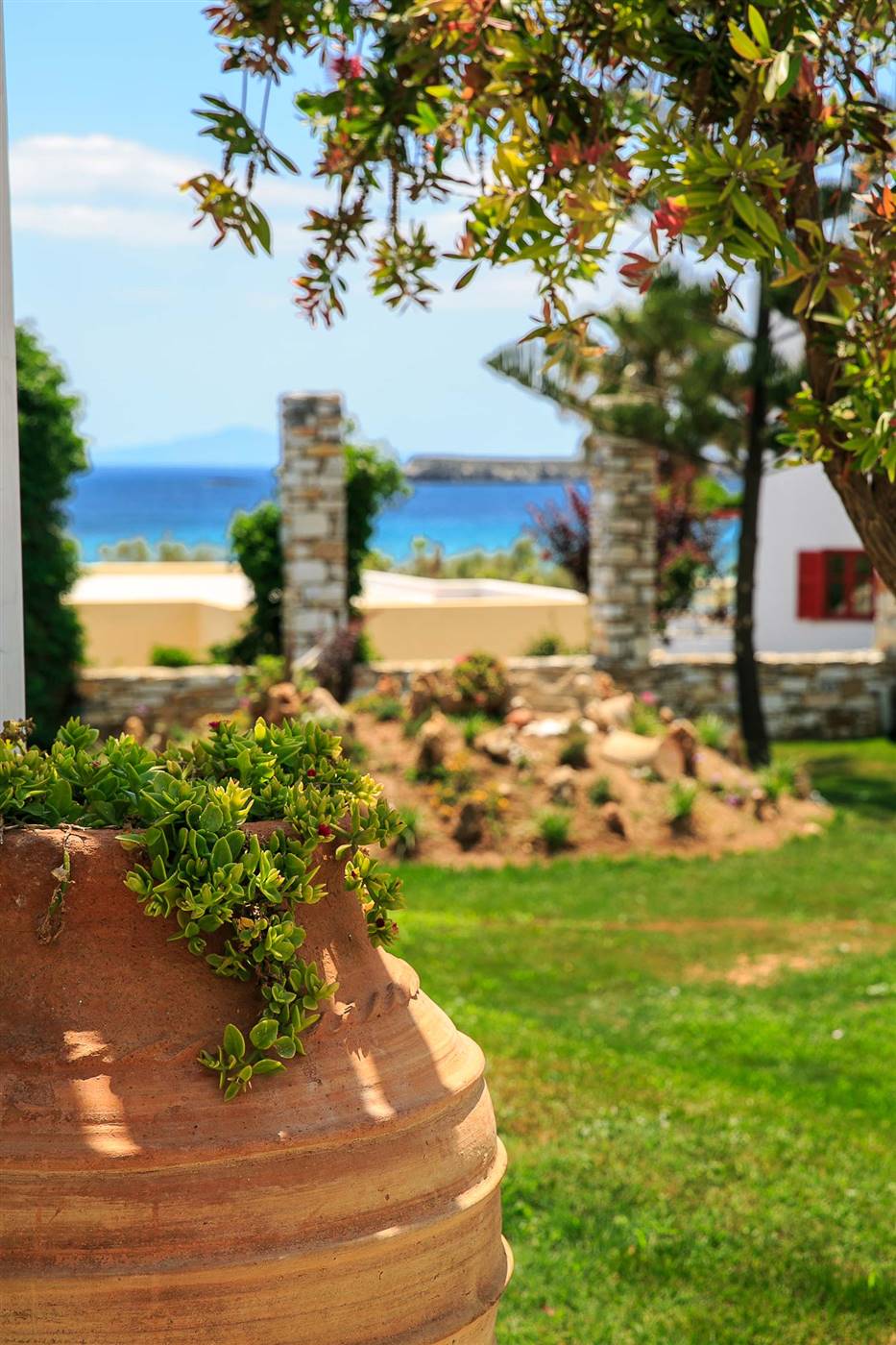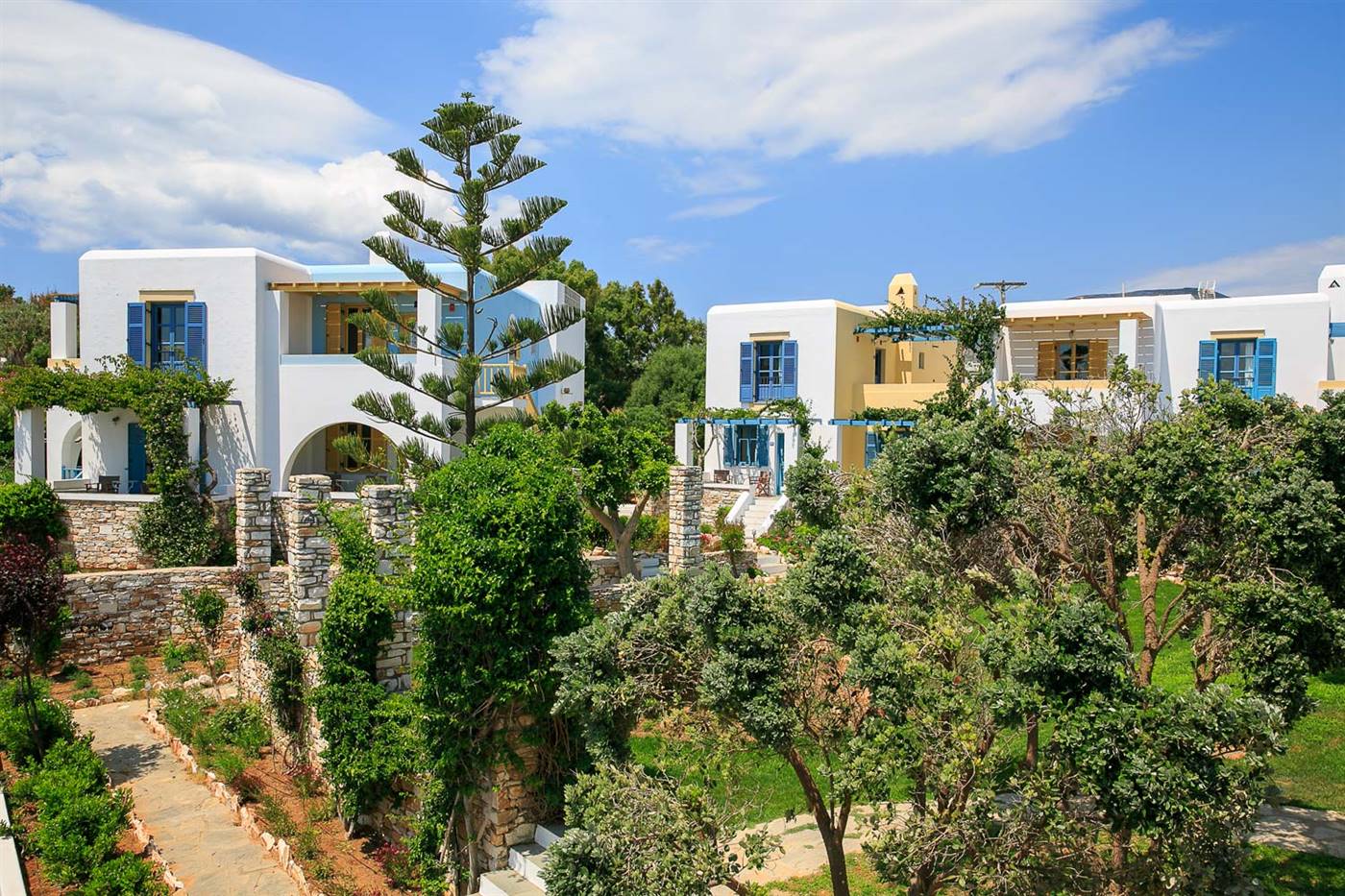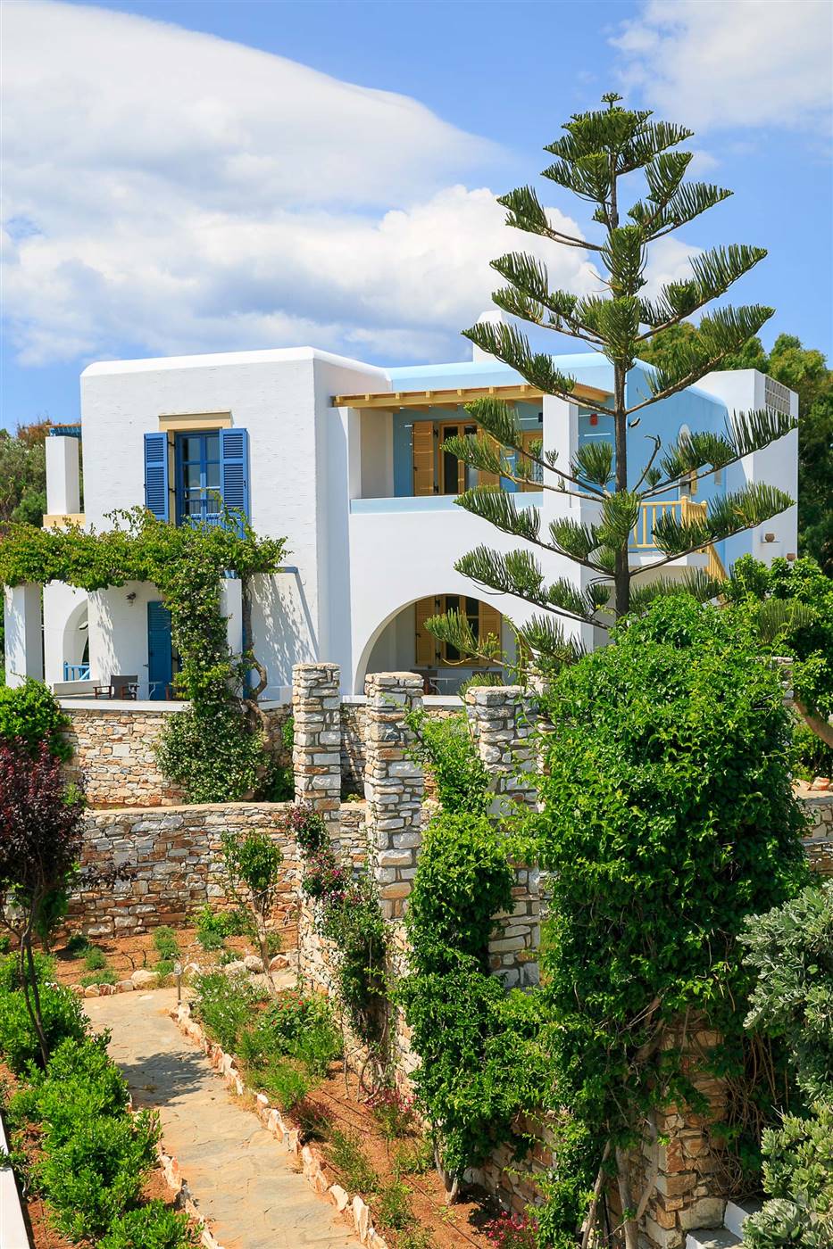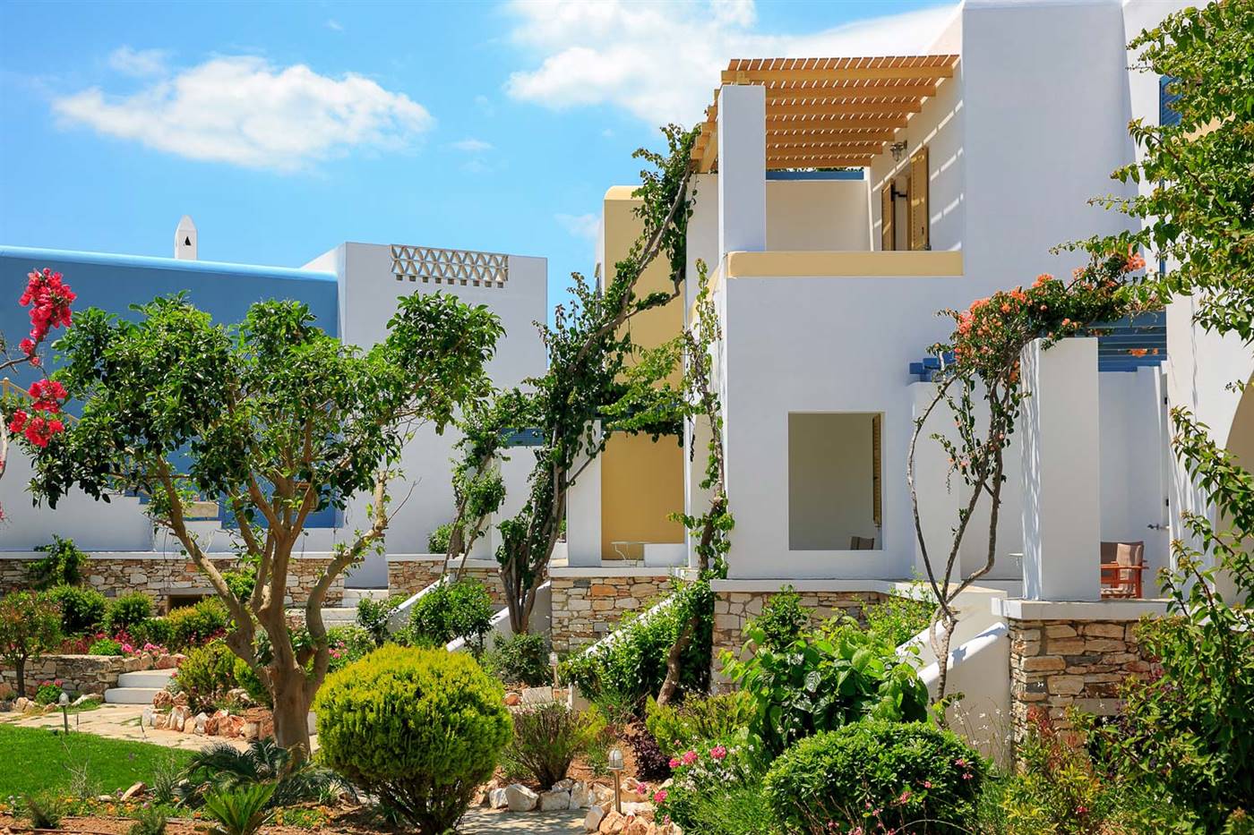 Arredate nello stile tradizionale delle Cicladi, tutte le suite dispongono di balcone o terrazza con vista sul giardino o sul Mar Egeo. Le sistemazioni sono dotate di aria condizionata, zona giorno arredata in modo confortevole, TV, frigorifero e bagno in marmo.