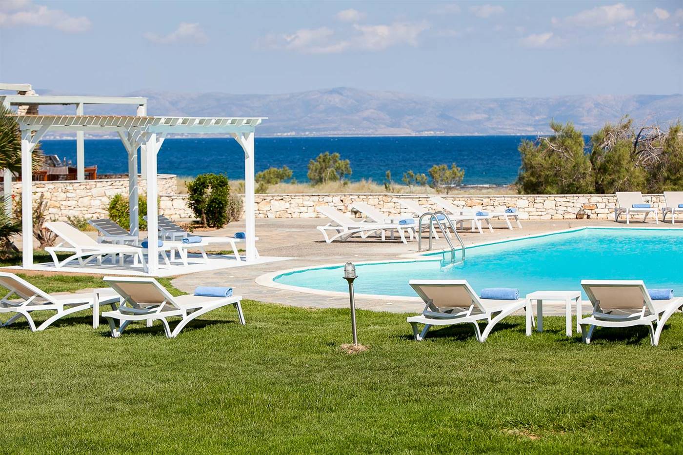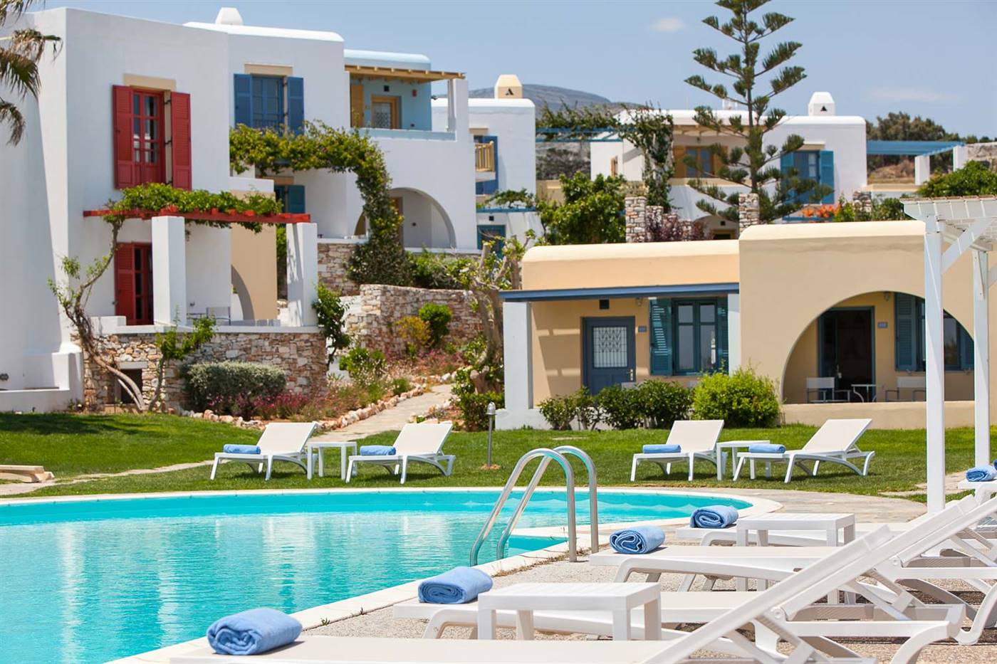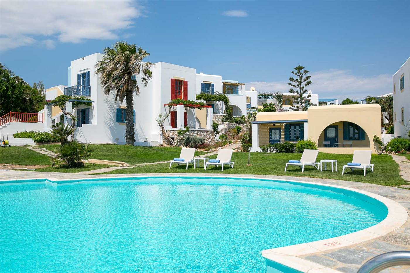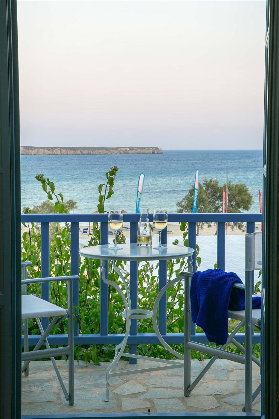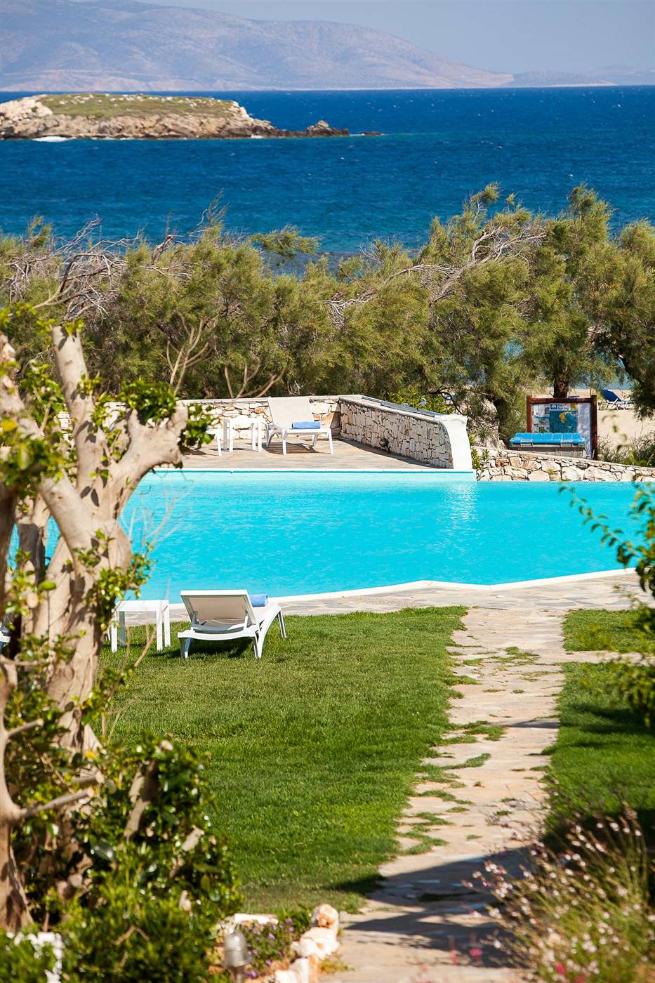 Arredate nello stile tradizionale delle Cicladi, tutte le suite dispongono di balcone o terrazza con vista sul giardino o sul Mar Egeo. Le sistemazioni sono dotate di aria condizionata, zona giorno arredata in modo confortevole, TV, frigorifero e bagno in marmo.