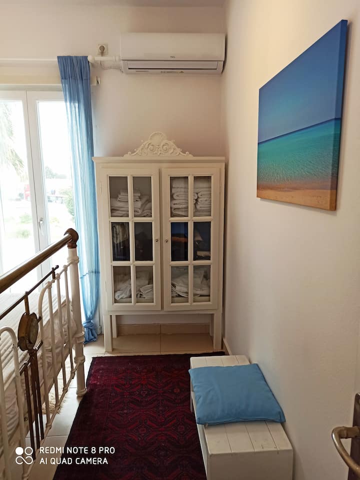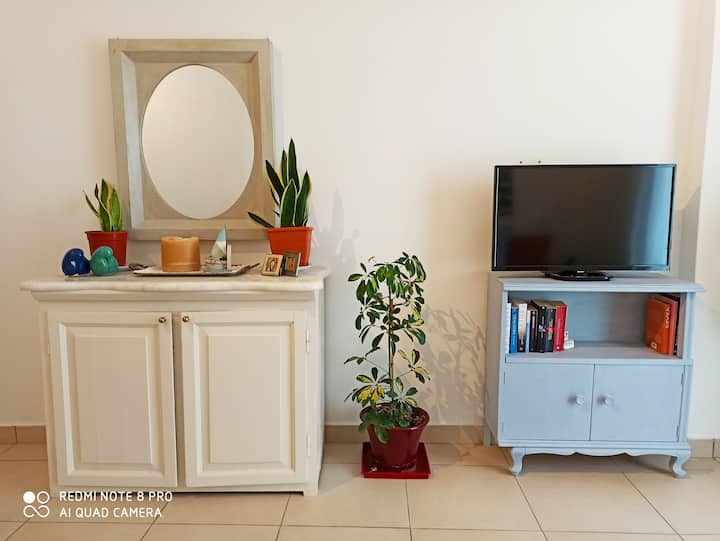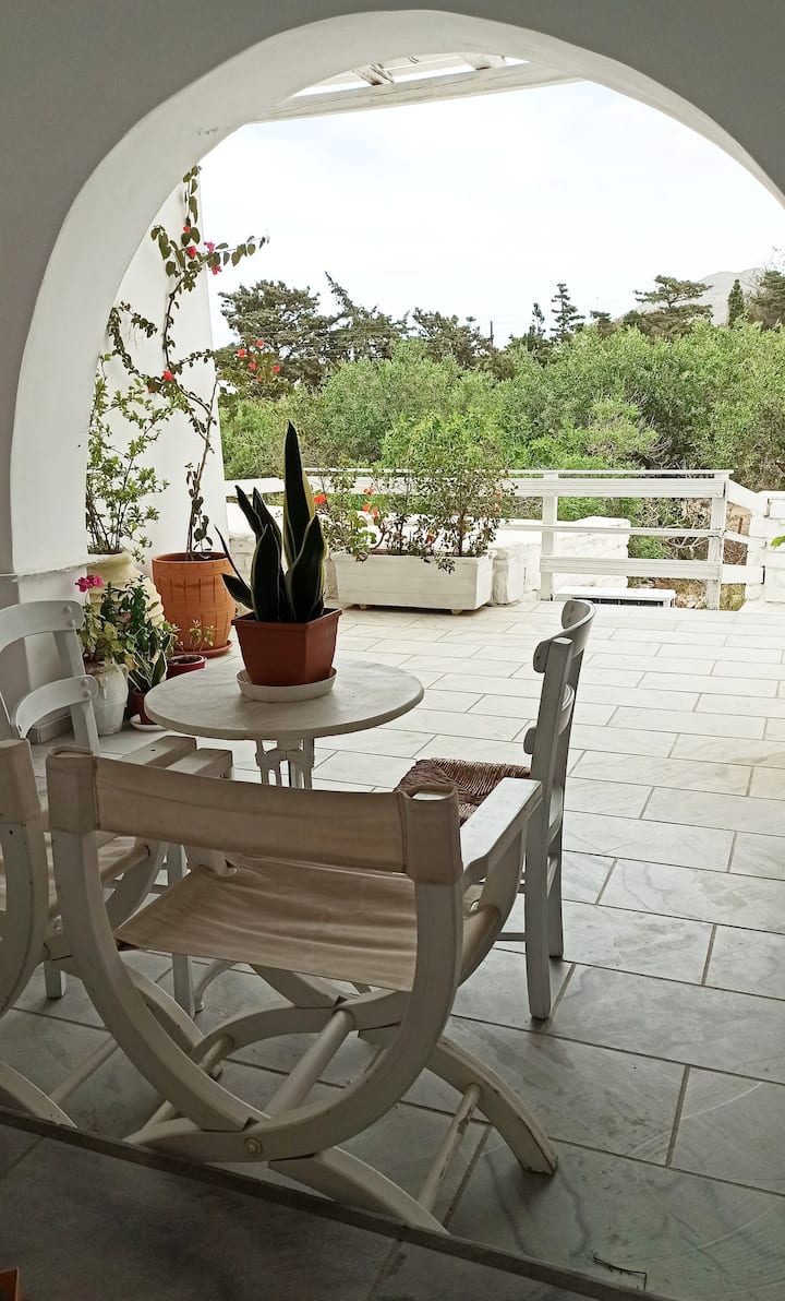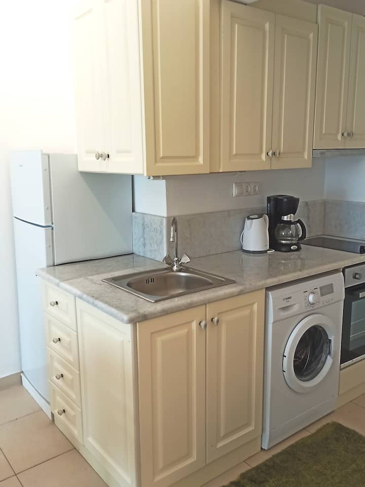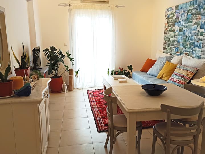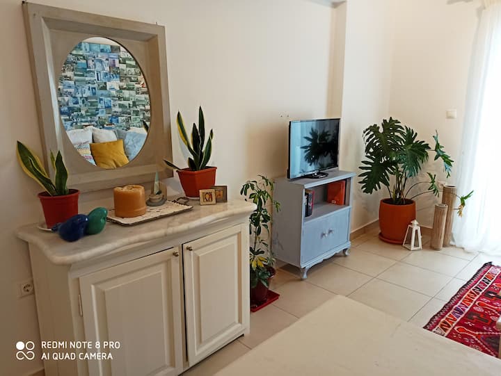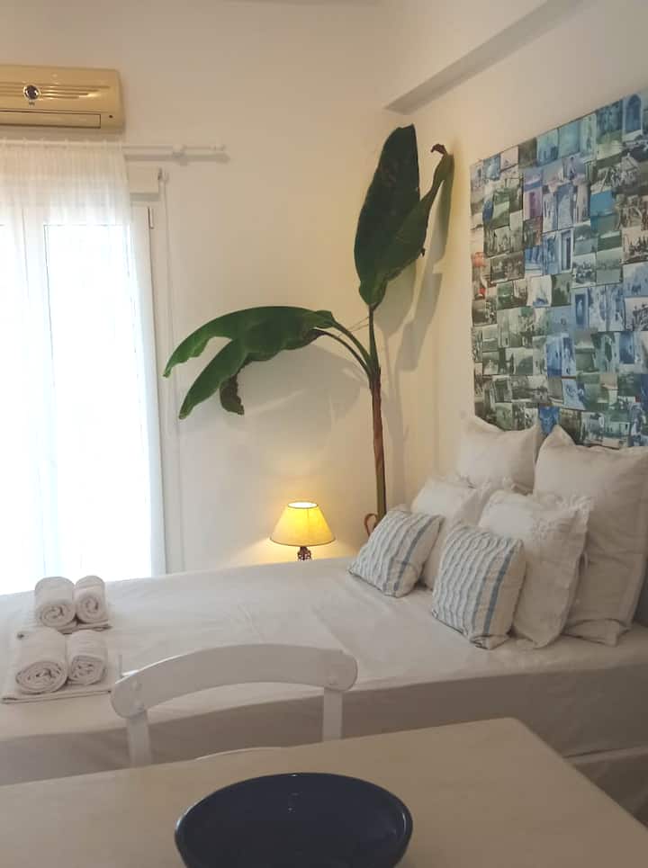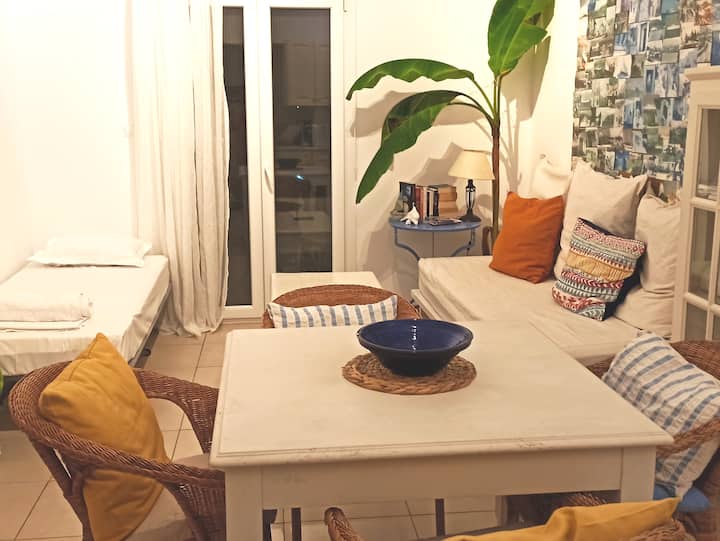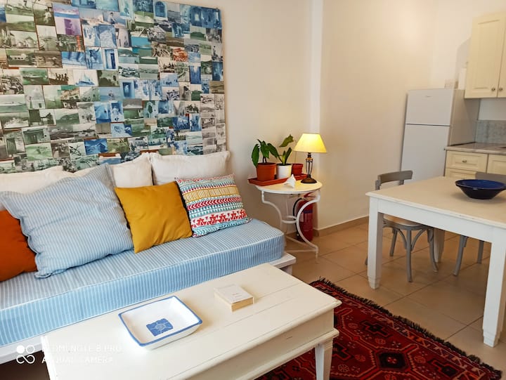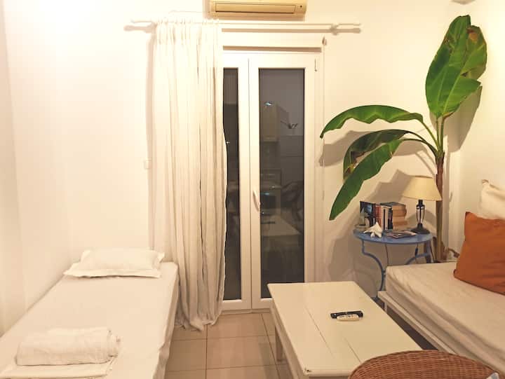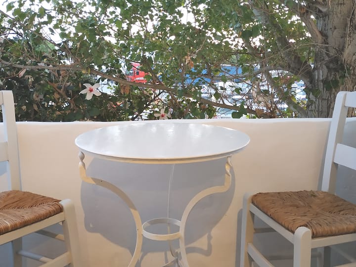 L'appartamento si compone di due camere: cucina-soggiorno cucina (completamente attrezzata con elettrodomestici nuovi di zecca - frigorifero, forno e lavatrice) , camera da letto e 2 bagni. Nel soggiorno c'è una sala da pranzo e un divano letto che può ospitare 2 persone e un balcone dove potrete fare colazione godendovi l'ombra dell'albero. C'è un bagnetto vicino alla cucina. La camera da letto ha un letto matrimoniale vintage (dimensioni 1,60m x2,00m), bagno privato e balcone privato.  Può ospitare coppie, famiglie con 1-2 bambini, un gruppo di amici che desiderano avere un accesso vicino a tutti i punti di interesse di Parikia e Paros in generale.