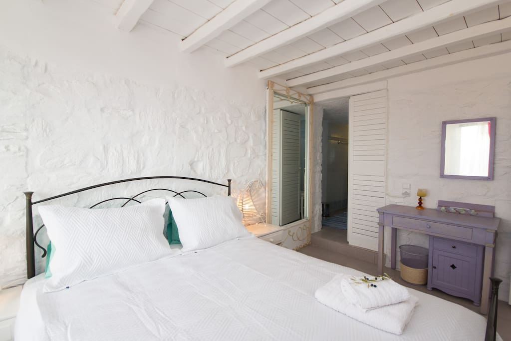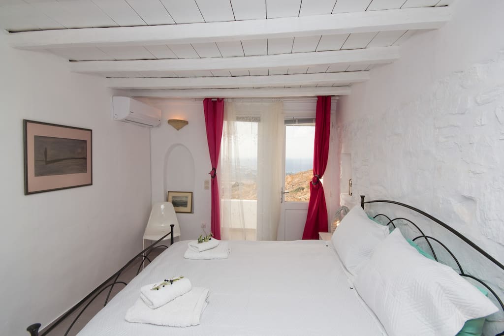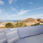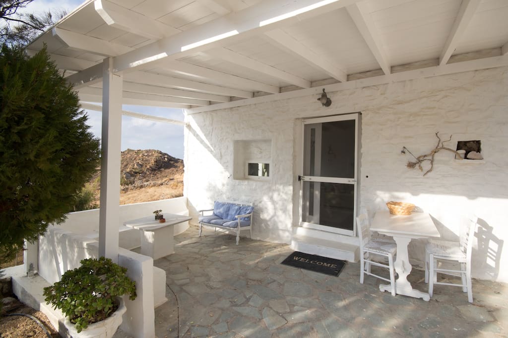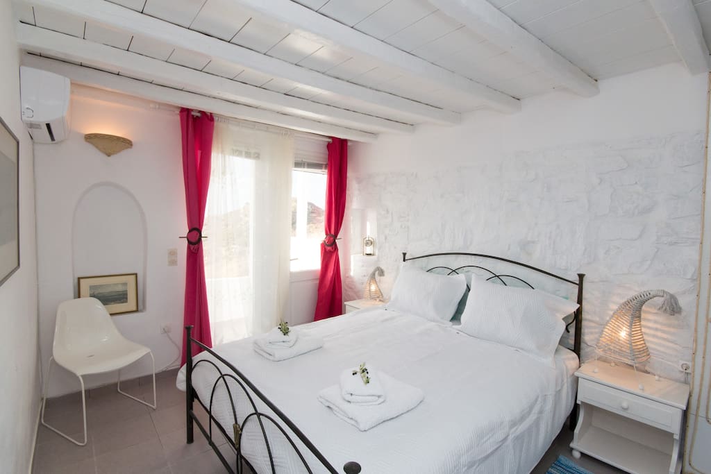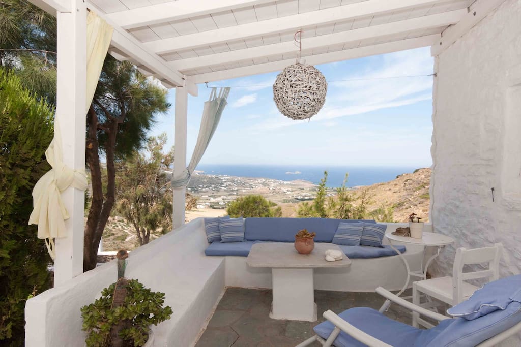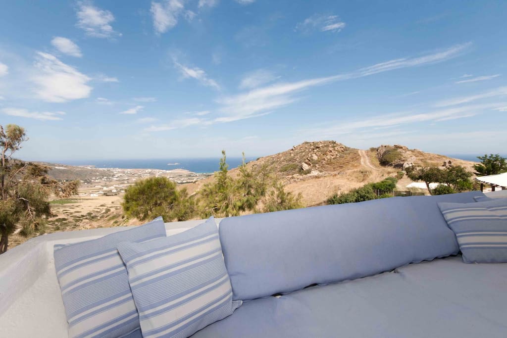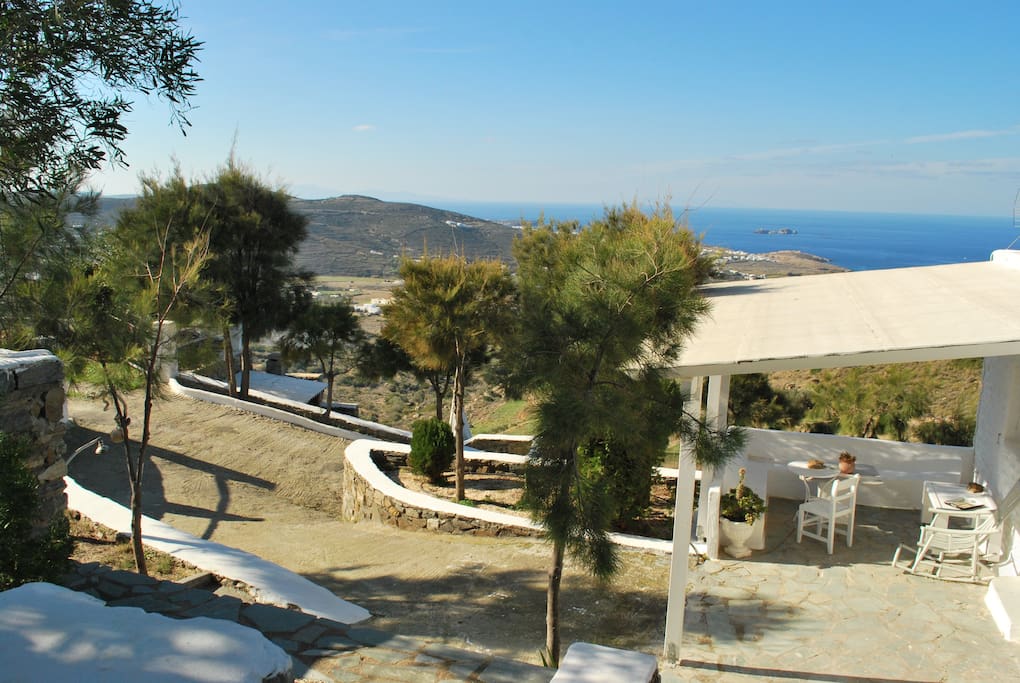Un camino, un cortile con altalene per i bambini e una piccola corte beasketball. I colori sono quelli tipici delle Cicladi con tonalità di bianco e blu con una splendida vista sul Mar Egeo. La sua veranda è ideale per la colazione o rilassanti cocktail al tramonto.
